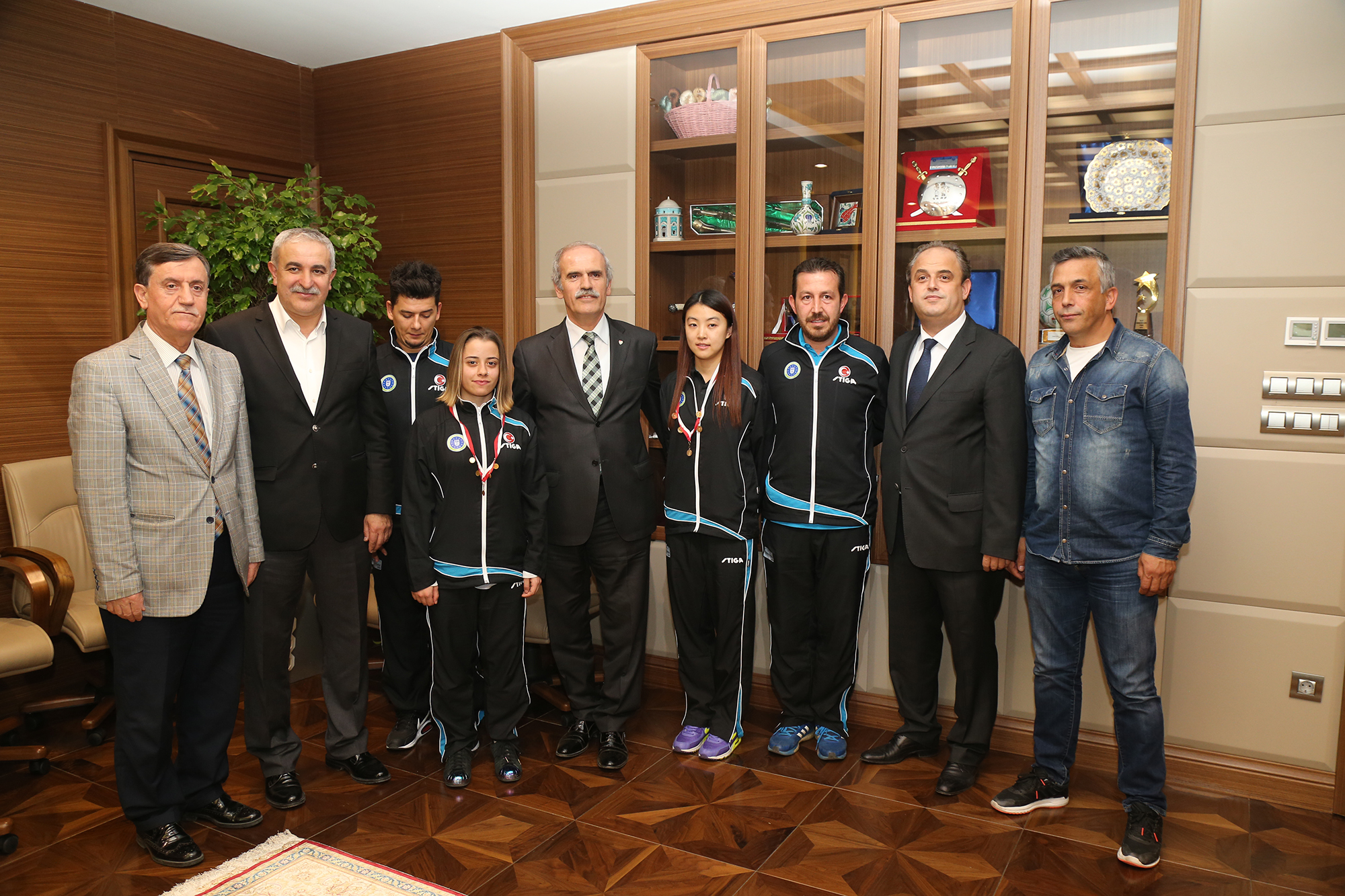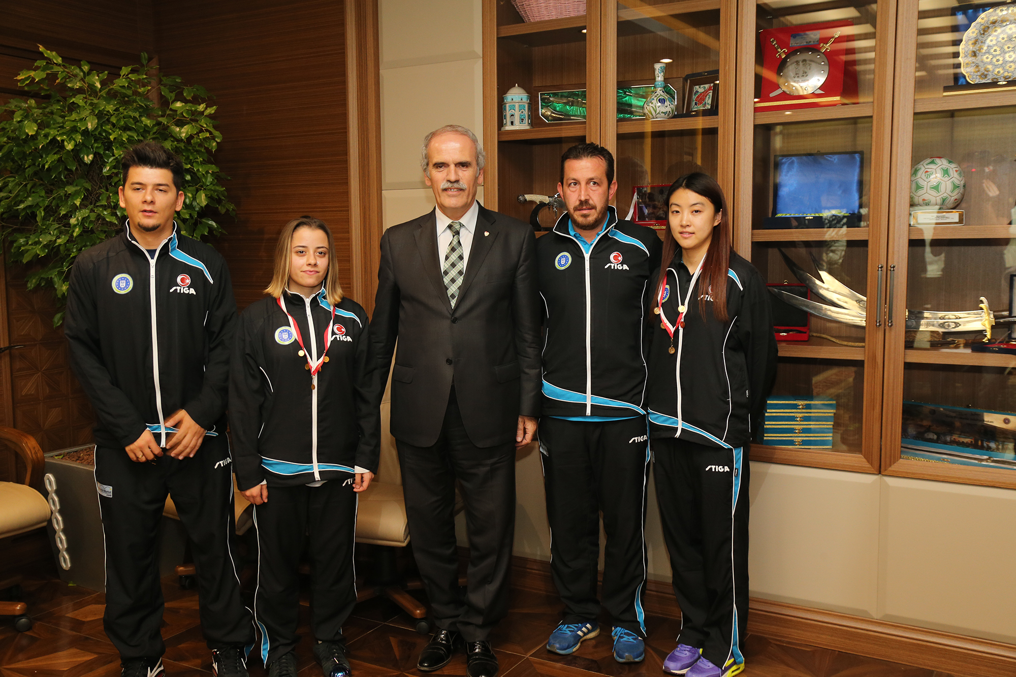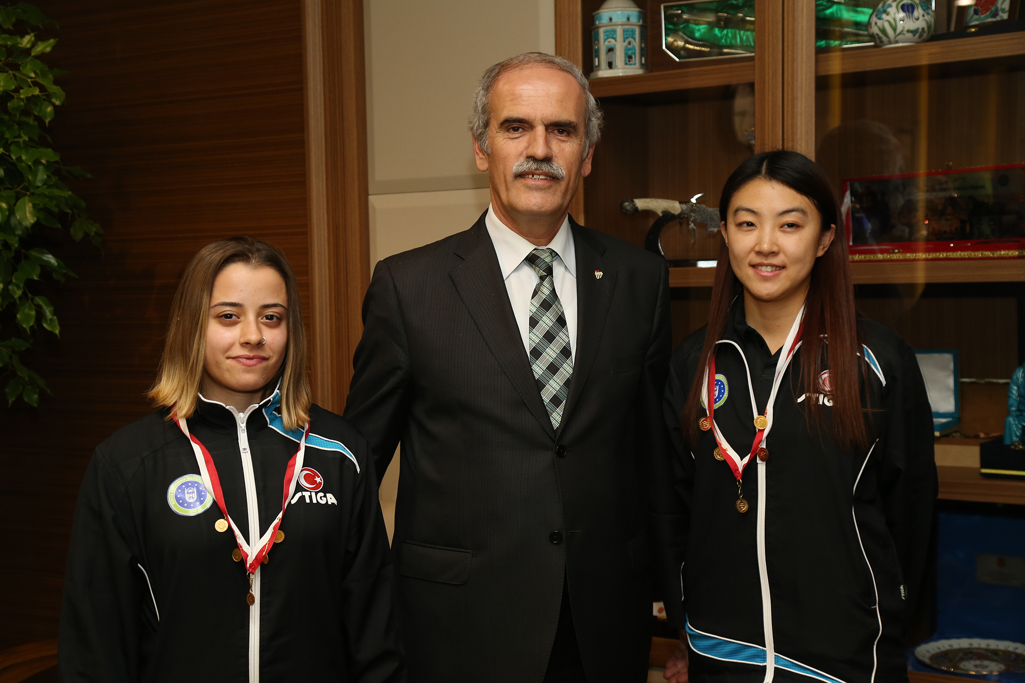 Geçtiğimiz günlerde Macaristan’ın başkenti Budapeşte’de yapılan 2016 Avrupa Masa Tenisi Şampiyonası’nda tek kadınlarda Avrupa Şampiyonu olan ve bu kategoride ülkemize ilk şampiyonluğu getiren Melek Hu ve yine 1-7 Aralık tarihlerinde Güney Afrika’nın Cape Town şehrinde düzenlenecek olan Dünya Gençler Masa Tenisi Şampiyonasında Türkiye’yi temsil edecek olan Simay Kulakçeken ve Bursa Büyükşehir Belediyespor Kulübü Masa Tenisi branşı antrenörleri Başkan Altepe’yi ziyaret etti. Büyükşehir Belediyespor Kulübü Başkan Yardımcısı İlhan Satık ve Masa Tenisi Federasyonu İl Temsilcisi Cemil Ünlü’nün de hazır bulunduğu ziyarette konuşan Başkan Altepe “Bugün gurur günümüz” derken spora olan yatırımlarının her geçen gün meyvelerini artarak aldıklarını ifade etti.