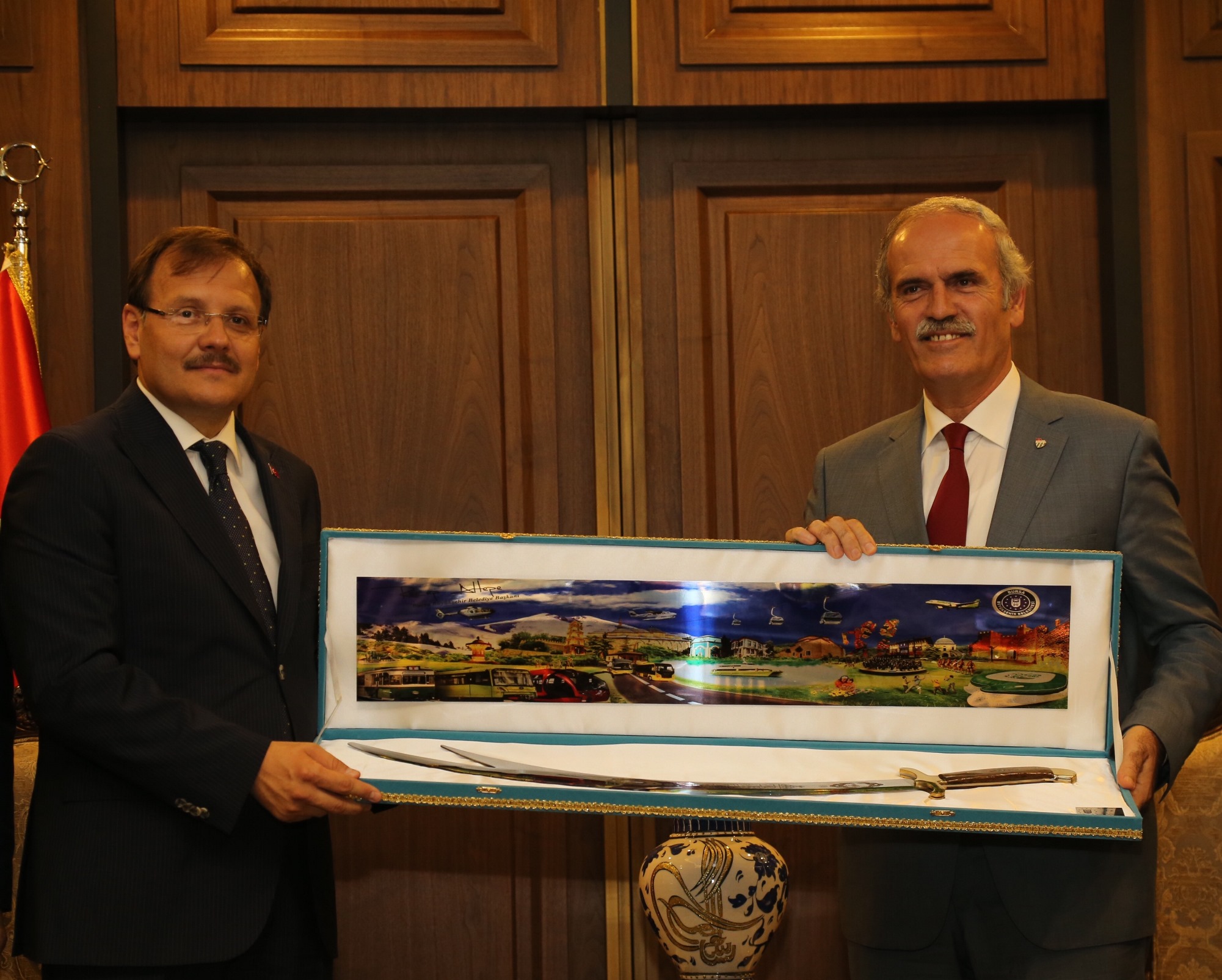 Başkan Altepe, Başbakan Yardımcısı Çavuşoğlu’na günün anısına ‘Zülfikar’ kılıcı hediye etti. Başbakan Yardımcısı Çavuşoğlu, ziyaret sonrasında Büyükşehir şeref defterini imzaladı.