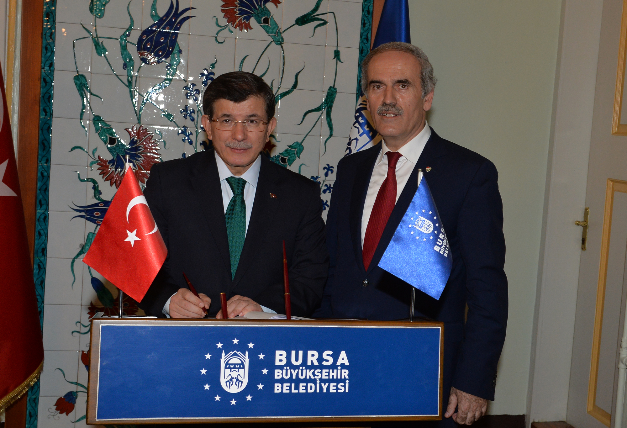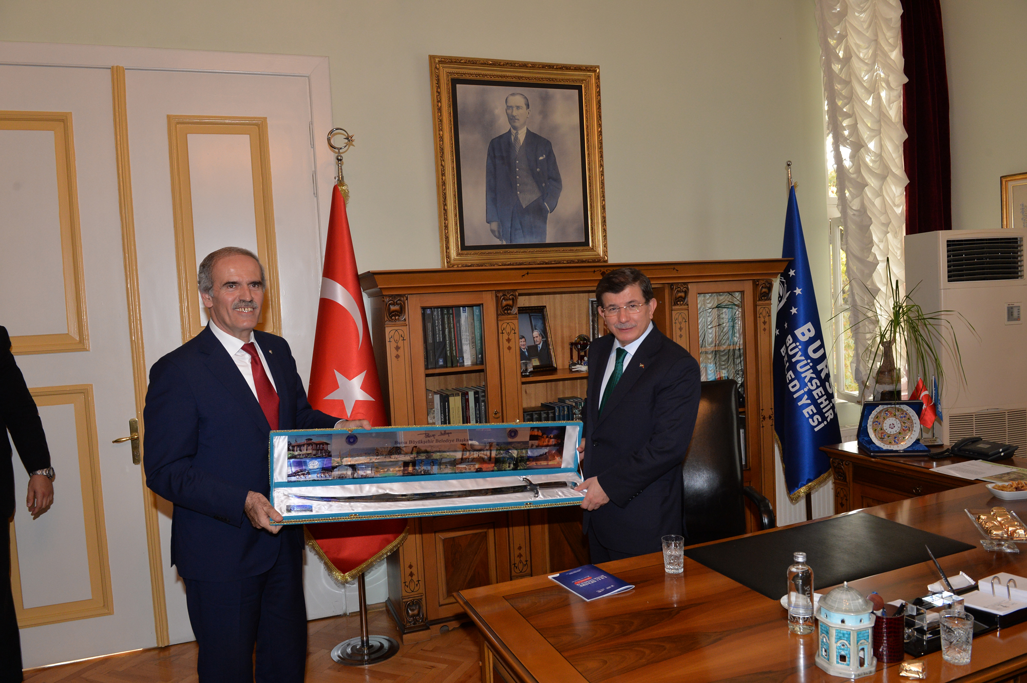 Bursa Valiliği, Büyükşehir, Yıldırım ve Osmangazi Belediyeleri ile Sağlık Bakanlığı ve Ulaştırma Bakanlığı tarafından Bursa’da yaptırılan ve 720 milyon TL’ye mal olan 21 yatırımın hizmete açılış töreni için Bursa’ya gelen Başbakan Ahmet Davutoğlu, Ulucami’de Cuma namazını kıldıktan sonra yürüyerek Tarihi Büyükşehir Belediye Binası’na geldi. Burada Büyükşehir Belediye Başkanı Recep Altepe tarafından karşılanan Davutoğlu’na, Büyükşehir Belediyesi’nin çevre gönüllüleri tarafından çiçek verildi. Daha sonra beraberindeki Başbakan Yardımcısı Bülent Arınç, İçişleri Bakanı Efkan Ala, Maliye Bakanı Mehmet Şimşek, Orman ve Su işleri Bakanı Veysel Eroğlu ve Çevre ve Şehircilik Bakanı İdris Güllüce ile birlikte Başkan Altepe’yi makamında ziyaret eden Başbakan Davutoğlu, Bursa’da hayata geçirilen yatırımlar hakkında Başkan Altepe’den bilgi aldı. Basına kapalı yapılan ve yaklaşık 45 dakika süren ziyaretin sonunda Başkan Altepe, günün anısına Başbakan Davutoğlu’na el yapımı bir kılıç hediye etti. El yapımı kılıcı dikkatle inceleyen Başbakan Davutoğlu, kendisinin kılıç ve kama koleksiyonu olduğunu belirterek, bu kılıcı da kendi özel koleksiyonunda saklayacağını söyledi.