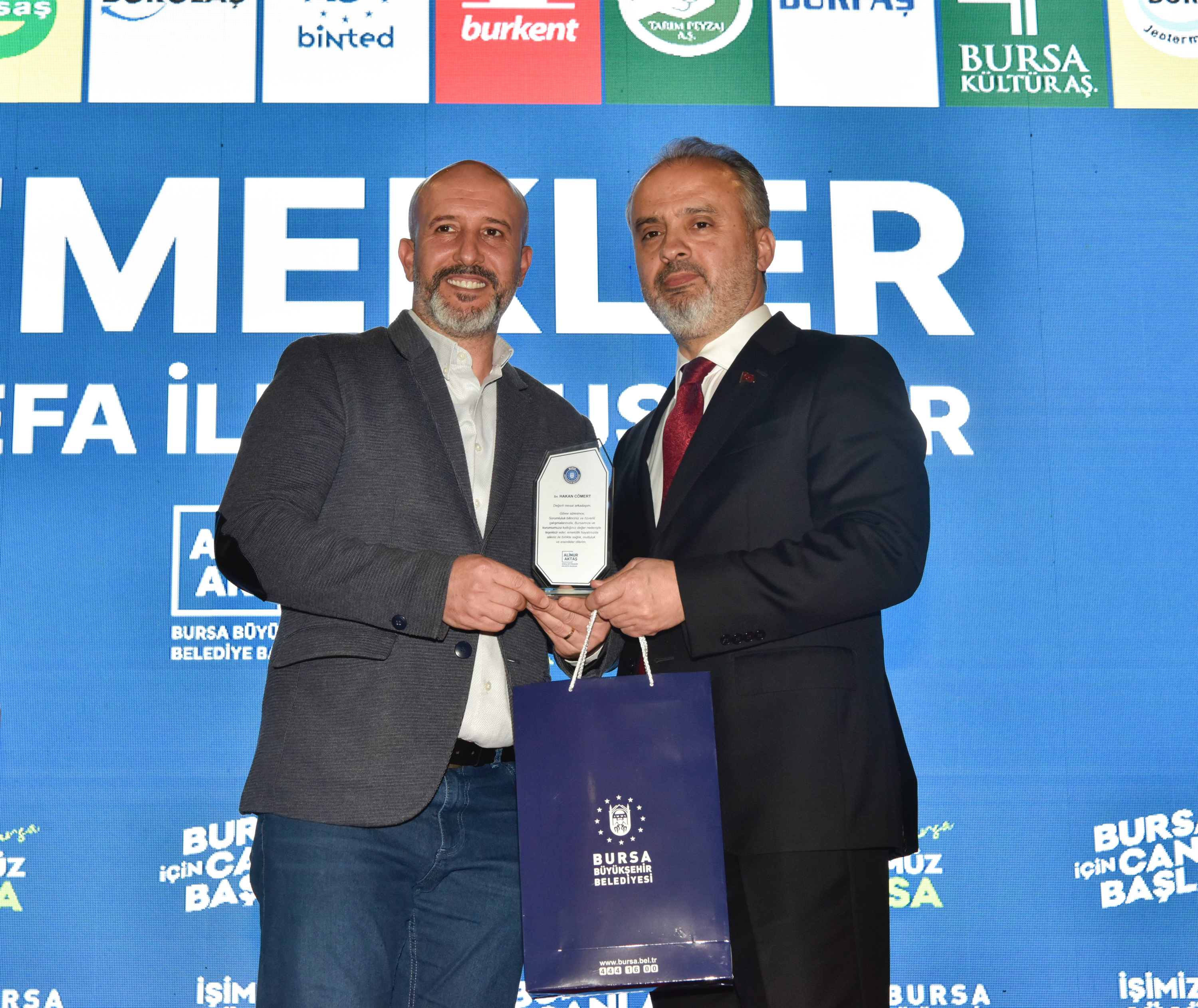 Bursa’ya ve Büyükşehir Belediyesi’ne yıllarca emek veren tüm çalışanlara hizmetlerinden dolayı teşekkür eden Büyükşehir Belediye Başkanı Alinur Aktaş, Bursa’da ortaya çıkan tüm güzel hizmetlerde Büyükşehir Belediyesi ve iştiraklere çalışanların emeği ve katkısı bulunduğunu söyledi. On binlerce üyesi bulunan büyük bir aile olduklarını belirten Başkan Aktaş, “Sel oldu, siz koştunuz. Yangın oldu, siz koştunuz. Sosyal yardıma muhtaç bir aile oldu. yine siz koştunuz. Hep beraber koştuk. Allah hepinizden razı olsun. Bugün de artık o verdiğiniz emeğin, mücadelenin bir sonunu, nihayetini ve kıvancını yaşıyorsunuz. Bursa Büyükşehir Belediyesi çok büyük bir aile. Sekiz iştirakimiz, BUSKİ ve Büyükşehir Belediyesi olmak üzere on tüzel kişilik, 13 bin civarı çalışanımız var. Her birinize teşekkür ediyorum. Bundan sonraki hayatınızda başarılar ve mutluluklar diliyorum. Sizlerle yol arkadaşlığı yapmak, bu şehre hizmet etmek, bu kutlu şehre, bu maneviyatı şehre çok hizmet etmek büyük bir mutluluk. Ailelerinizle, çocuklarınızla beraber sağlıklı, hayırlı, uzun ömürler temenni ediyorum” diye konuştu.