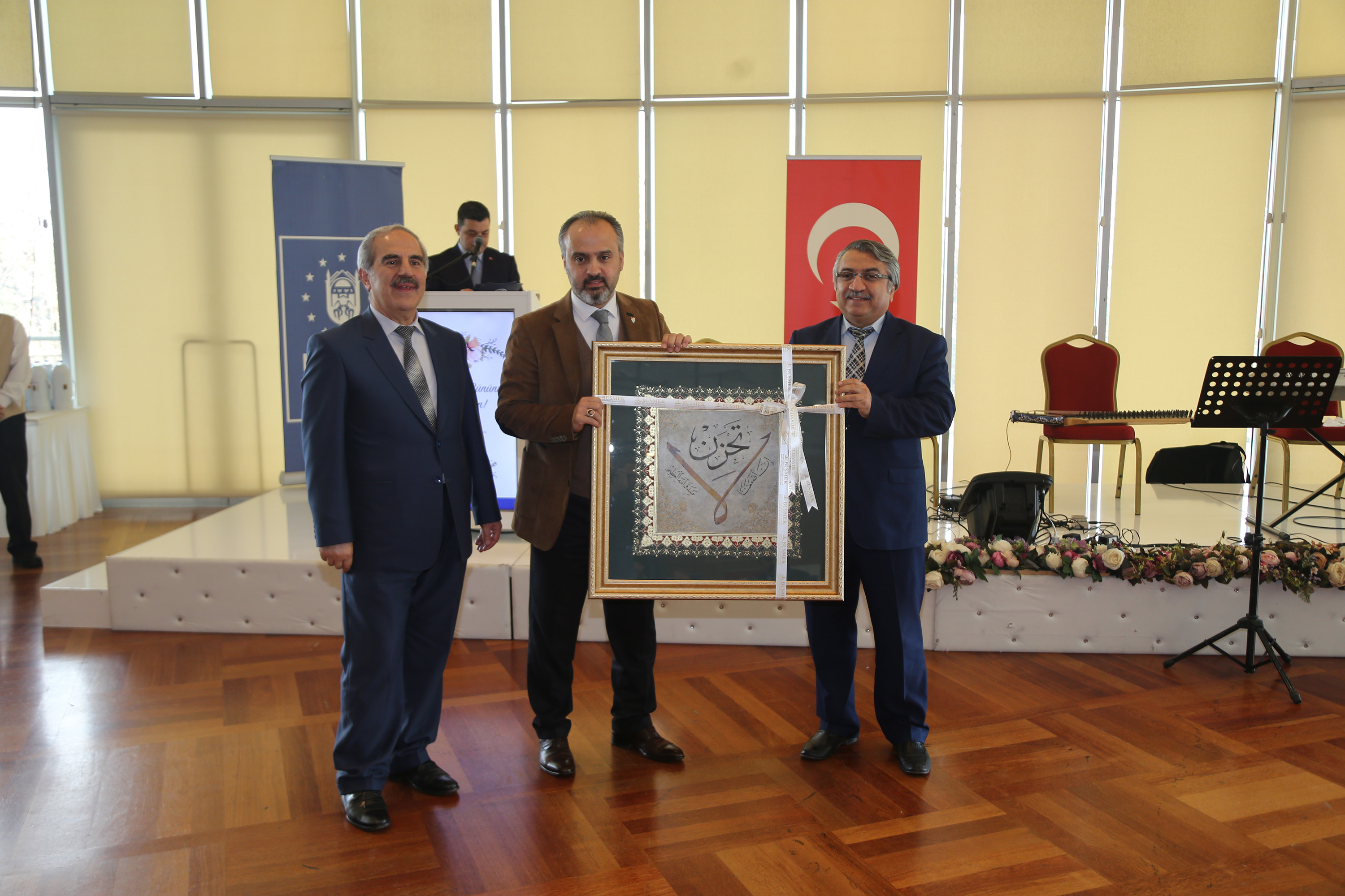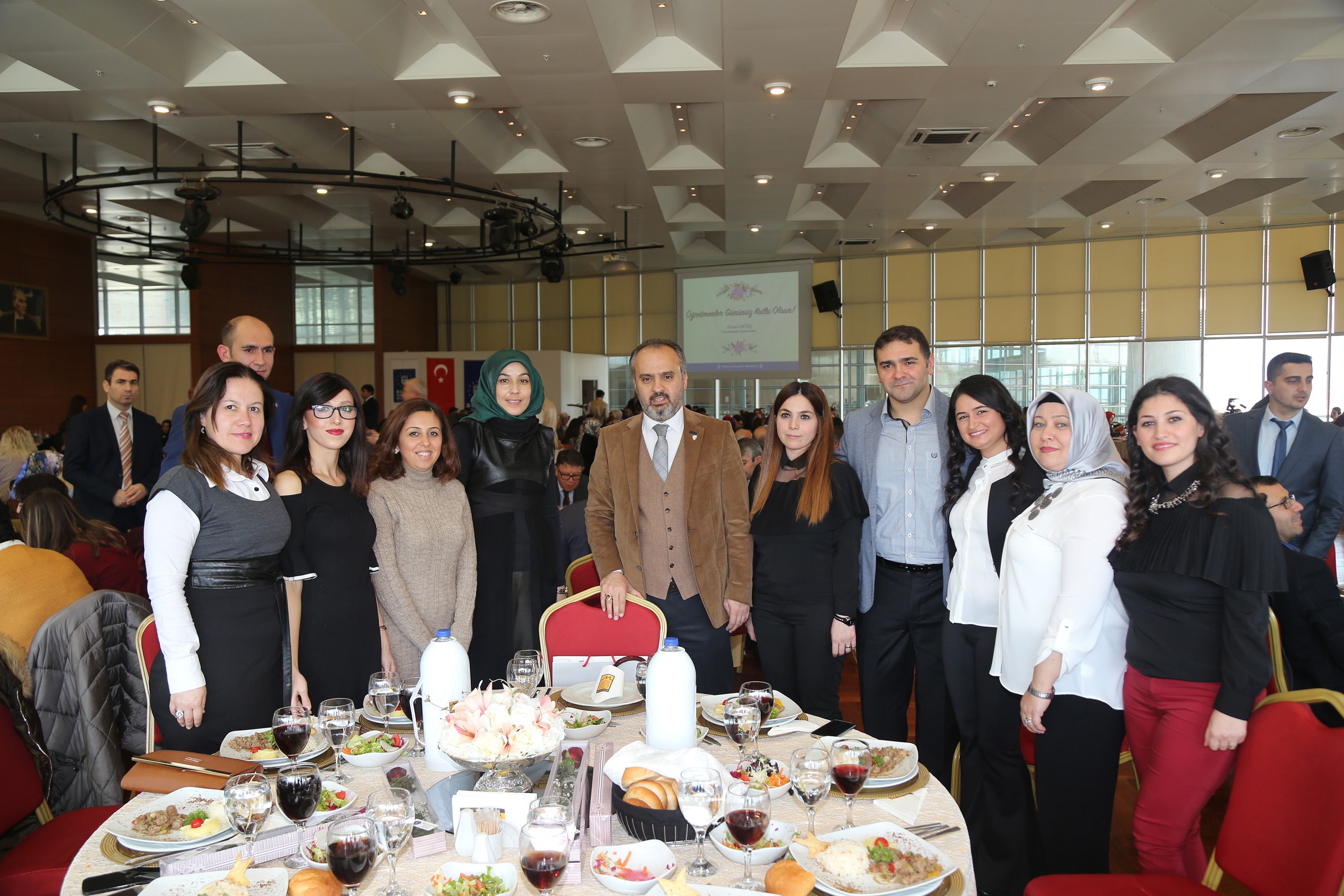 Başkan Aktaş, yemeğe katılan öğretmenler adına Miray Şen’e çiçek verirken, Başkan Aktaş'ın lise döneminde spor derslerine giren ve şu anda Bursa Büyükşehir Belediyesi bünyesinde görev yapan Enver Fatih Karakoç da eski öğrencisine BUSMEK kursiyerlerince yapılan el işi hat yazılı tablo hediye etti.