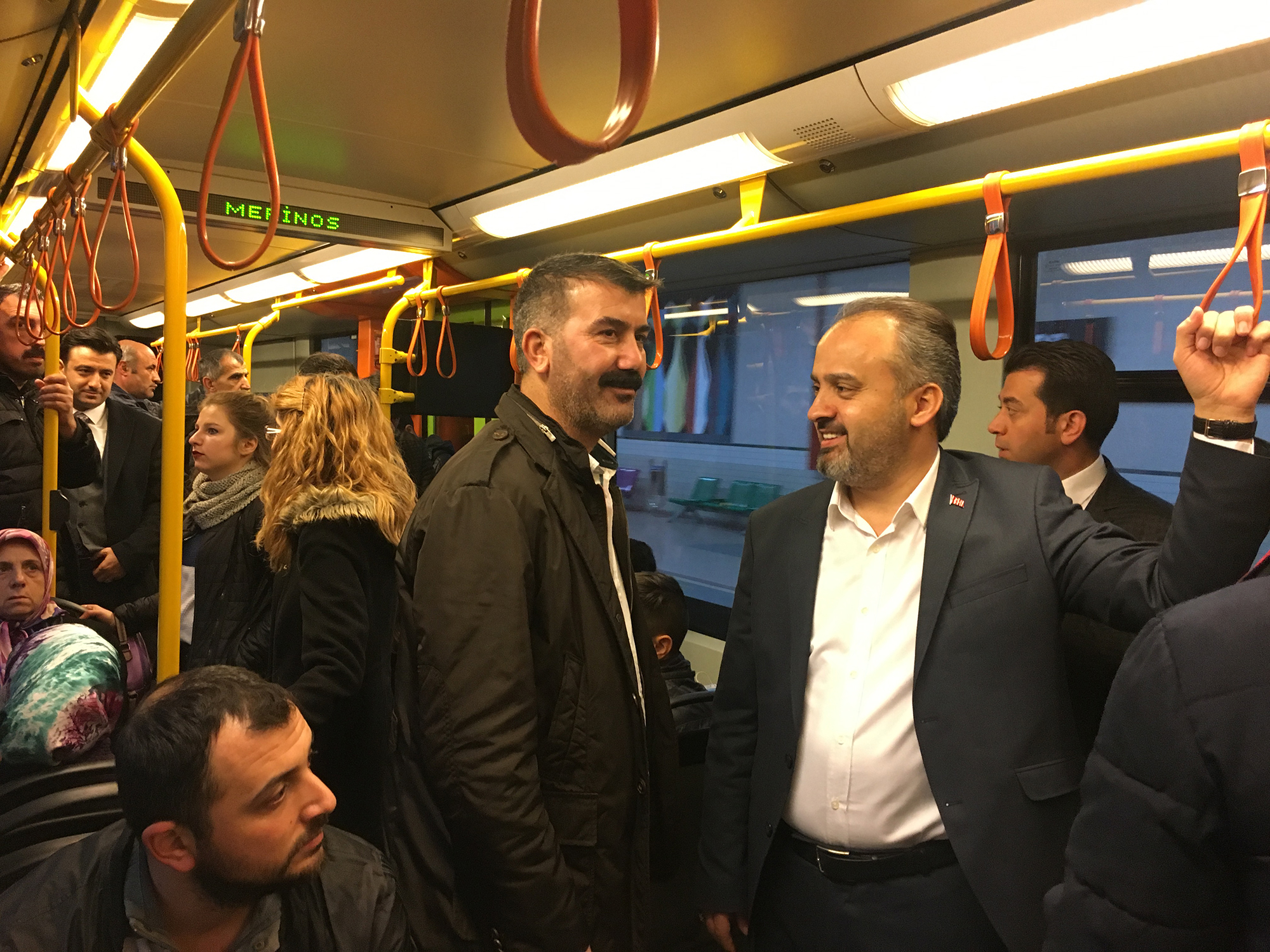 Toplu ulaşımda özellikle yoğunluğun olduğu pik saatlerde oturarak gitme olayının çok mümkün olmadığını ifade eden Başkan Aktaş, “Yapılacak çok ciddi iyileştirmeler var. Çünkü tabir yerindeyse insanların vücutlarının cama yapışarak seyahat ettikleri bir uygulama kabul edilebilir değil. O yüzden de inşallah ekibimizle birlikte yapacağımız uygulamalarla çok yakında Bursalı hemşerilerimiz bu ayrıcalığı, bu farklılığı hissedecek. Aldığımız bütün bu bilgileri değerlendireceğiz. Yoğunluğun olduğu akşam saatlerinde de bir yolculuk yapacağım. Özelikle bugün yalnız geldim. Yerinde tespit yapayım istedim. Bunun yanında ciddi konularla ilgili bilgiler aldık. Vatandaşlarımızın hayatlarını kolaylaştırmaya yönelik ciddi adımlar atacağız” diye konuştu.