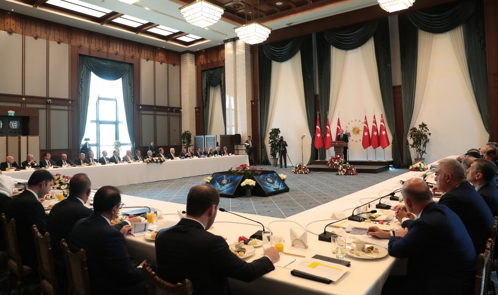 Cumhurbaşkanı Erdoğan, Büyükşehir belediye başkanlarının tamamını Külliye’de ağırladı. Başkan Erdoğan’ın daveti üzerine gerçekleşen toplantıya, AK Parti, CHP ve MHP’li belediye başkanlarının yanı sıra kayyum olarak atanan isimler de katıldı.