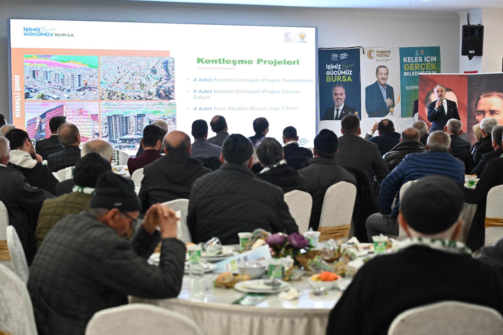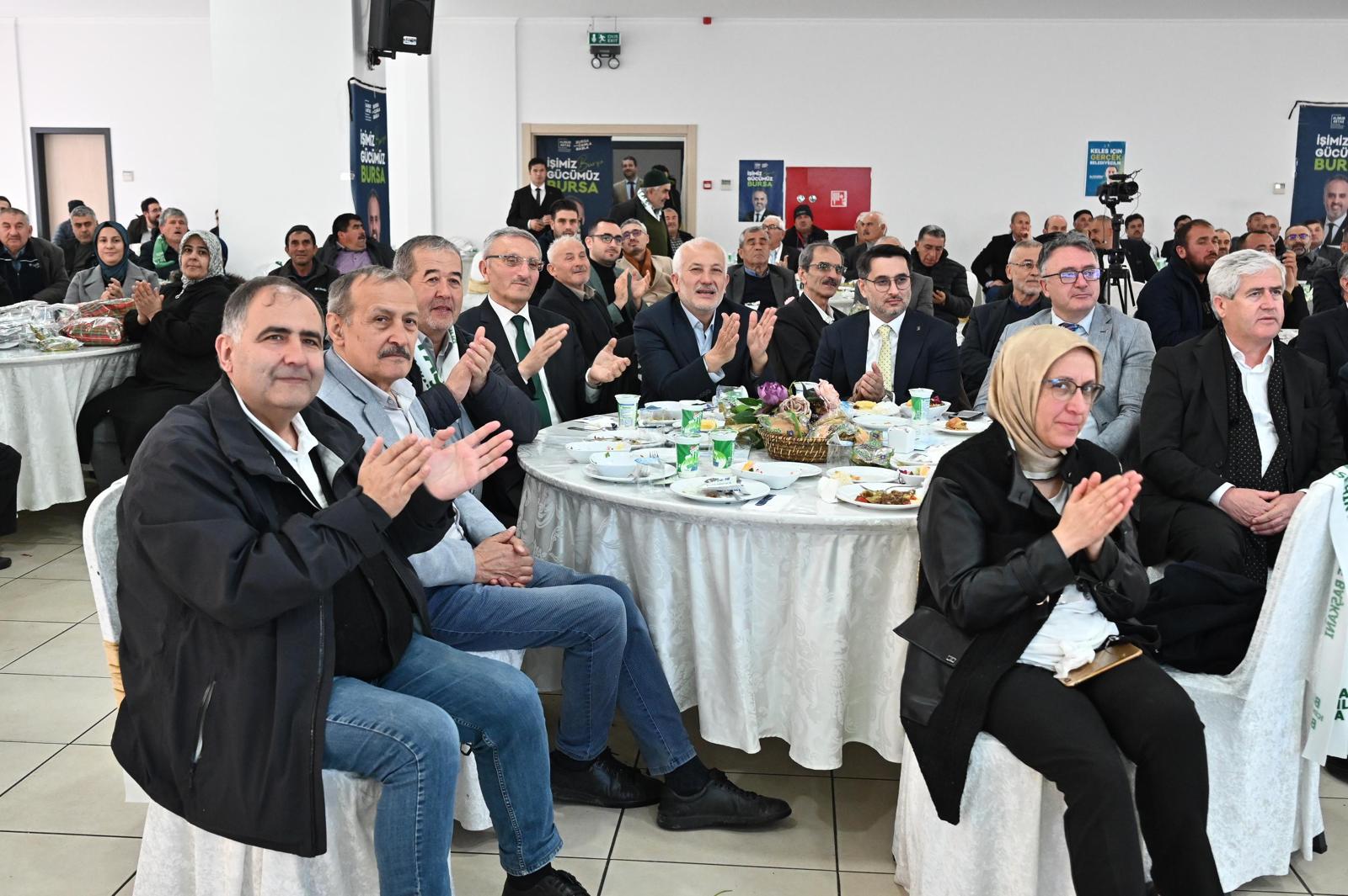 Keles özelinde yapılan yatırımları da anlatan Başkan Aktaş, 107 metre bordür, 7 bin 643 metrekare tretuar, 12 kilometre sıcak asfalt, 152 kilometre sathi kaplama, 120 bin metrekare parke temini ve 45 bin ton ocak malzemesi desteği verildiğini hatırlattı. 6 adet paket atık su arıtma tesisi, 165 kilometre içmesuyu hattı, 23 kilometre kanalizasyon hattı, 5 kilometre yağmur suyu hattı, 7 kilometre dere temizliği ve 7 adet su sondajı yapıldığını söyleyen Başkan Aktaş, “Keles Atıksu Arıtma Tesisi’ninde, Keles Menteşe Göleti’nde çalışmalar sürüyor. Keles, Kozbudaklar, Davutlar, Baraklı, Pınarcık ve Keles Kıranışıklar paket içmesuyu arıtma tesislerini hizmete aldık. Keles Katı Atık Aktarma İstasyonu devreye alındı. Kozbudaklar Düğün Salonu hizmete açıldı. Birçok tarımsal destekler yaptık. Çörek otunda elde edilen başarı hikayesinin benzerlerini yeni dönemde de yazacağız. Kapanmak üzere olan süs bitkileri kooperatifi ile birlikte çalışarak geçen sene 30 milyon TL ödeme yaptık. Hem kırsal üreticiyi destekliyoruz hem de ürünleri daha uyguna alıyoruz. Keles Kocayayla Kamp ve Rekreasyon alanında imalatlar tamamlandı. Keles Sosyal ve Kültürel Hizmet Binası ilçeye hizmet veriyor. Biz pastayı büyütmek için çaba harcıyoruz” diye konuştu.