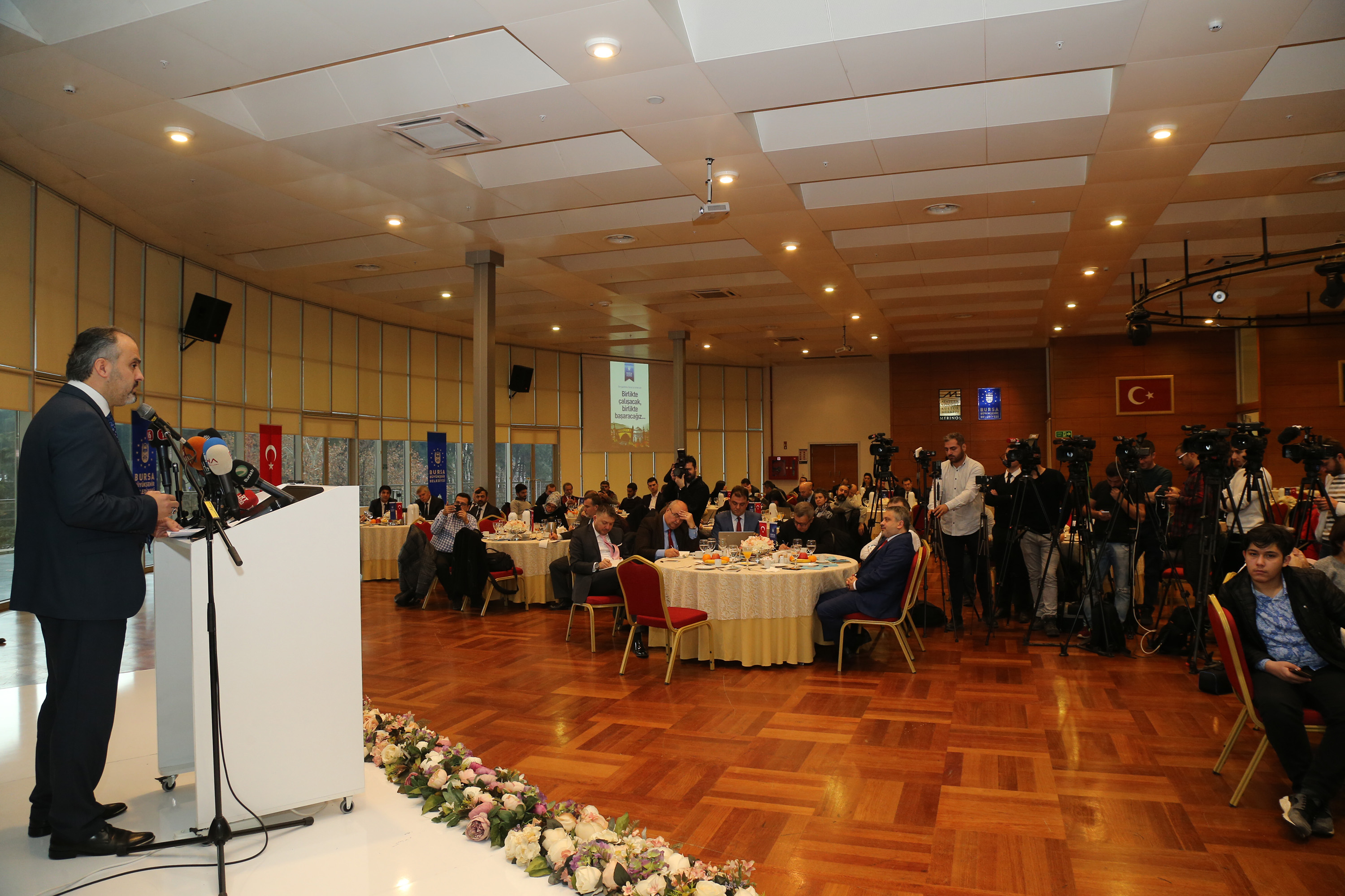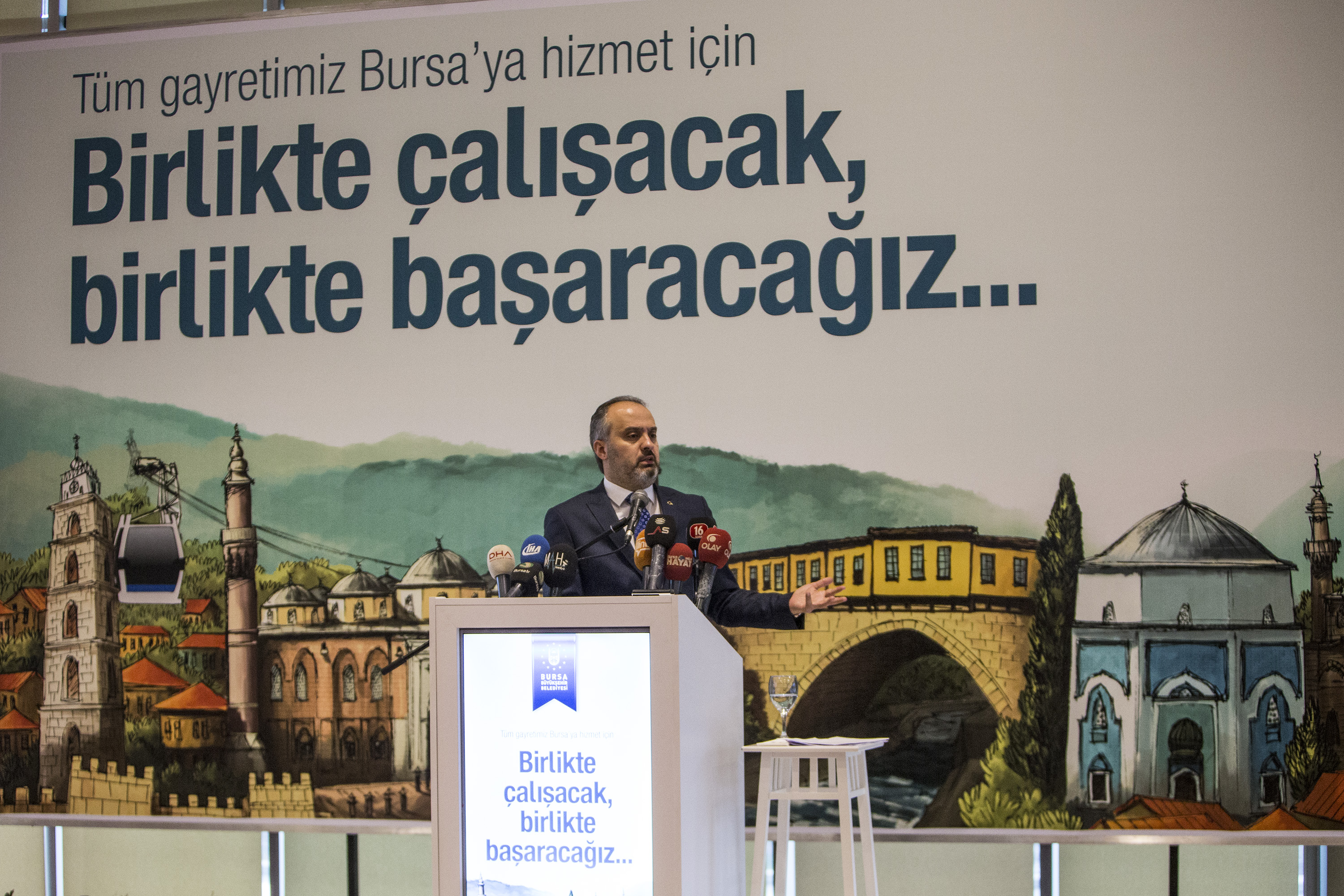 Recep Altepe’nin istifasının ardından Büyükşehir Belediye Başkanlığı koltuğuna oturan ve fiilen görevine 3 Kasım’da başlayan Başkan Alinur Aktaş, ilk günden başlattığı toplantı trafiğinin ardından görevinin 34’üncü gününde izleyecekleri yol haritasını kamuoyu ile paylaştı. Atatürk Kongre Kültür Merkezi Yıldırım Beyazıt Salonu’nda düzenlenen basın toplantısında kameraların karşısına geçen Başkan Aktaş’ı bu önemli günde AK Parti İl Başkanı Ayhan Salman da yalnız bırakmadı. Konuşmasının başında Başkanlık seçimi sırasında MHP ve bağımsız üyelere gösterdikleri nezaket nedeniyle teşekkür eden Başkan Aktaş, ulaşımdan kentsel dönüşüme, turizmden spora kadar her alanda atacakları adımları tek tek açıkladı.