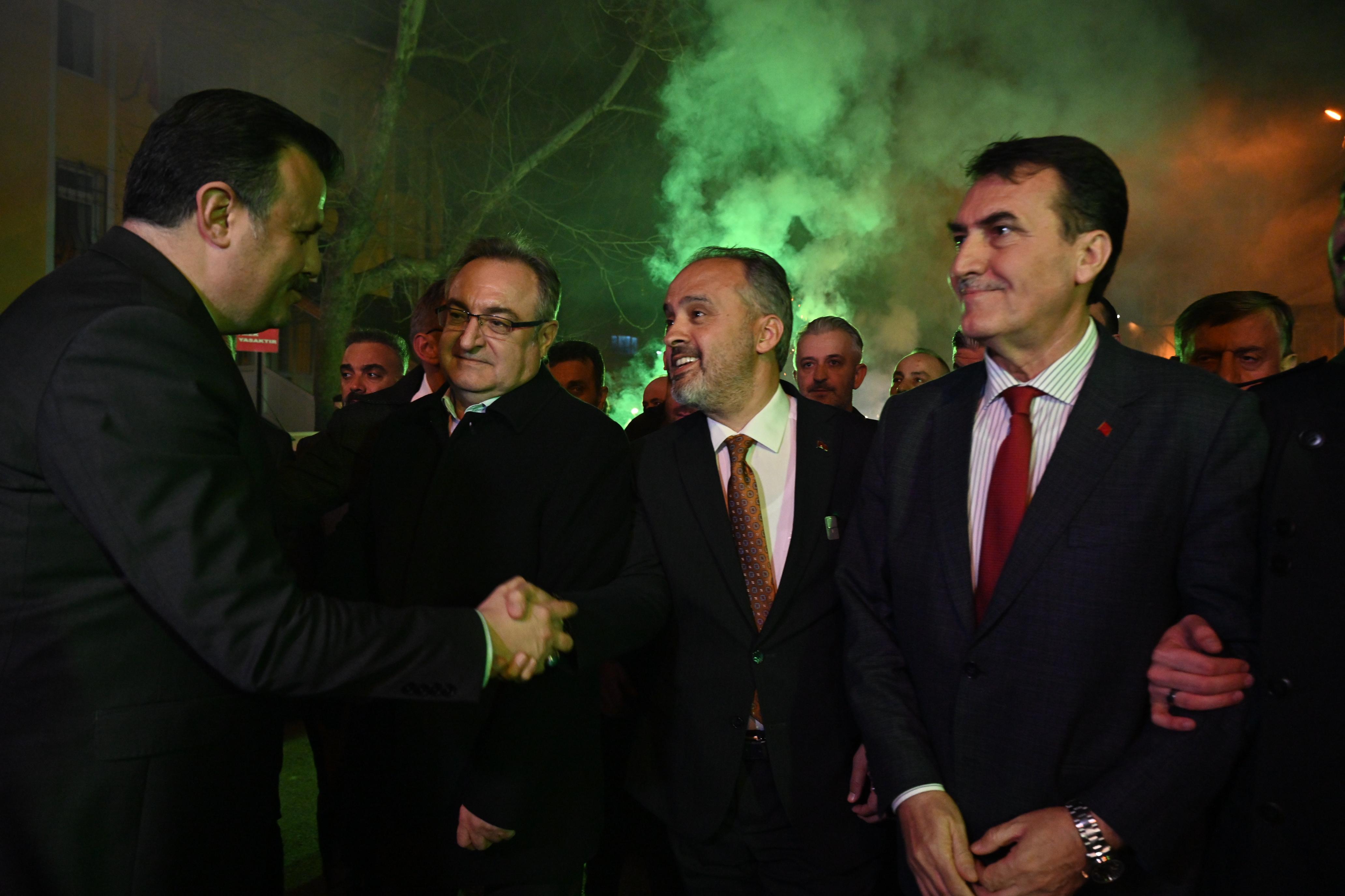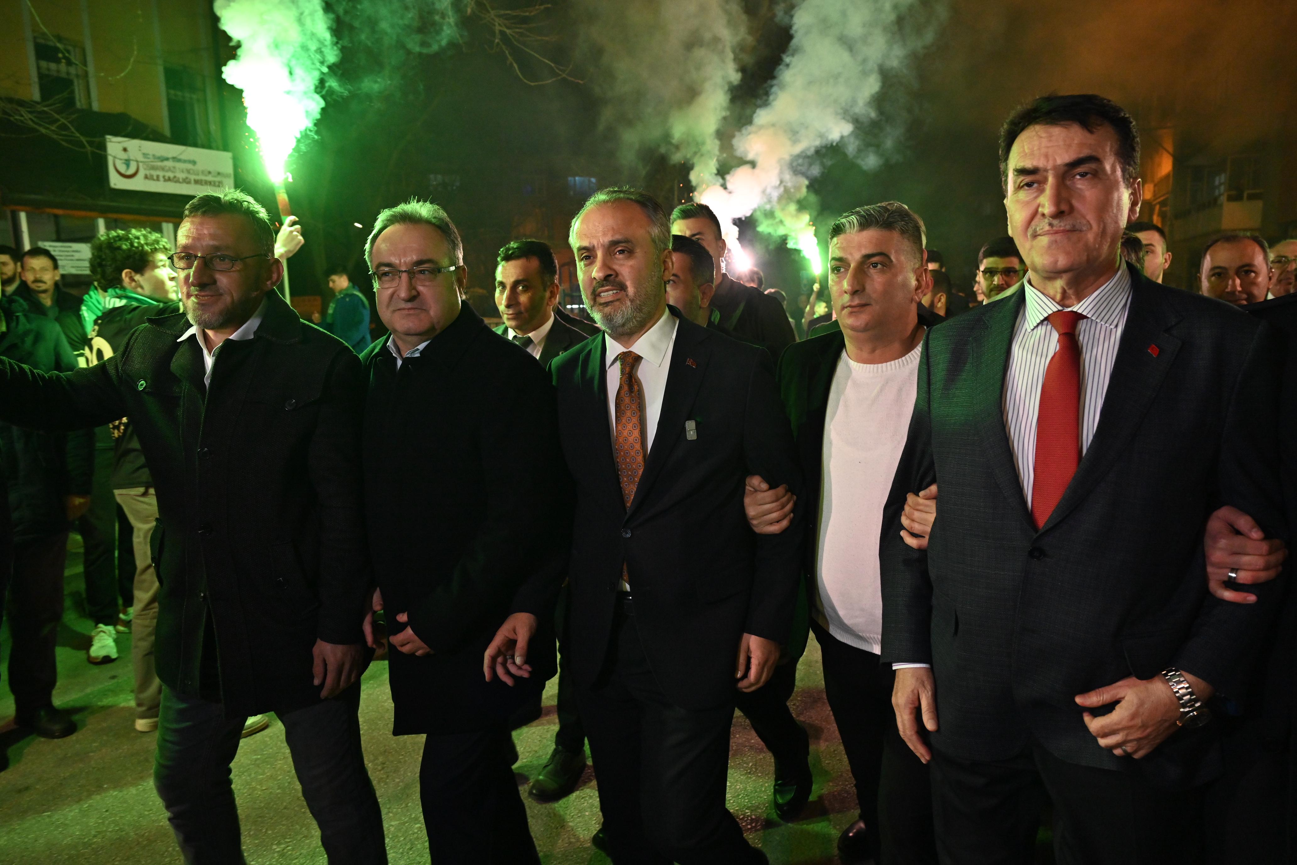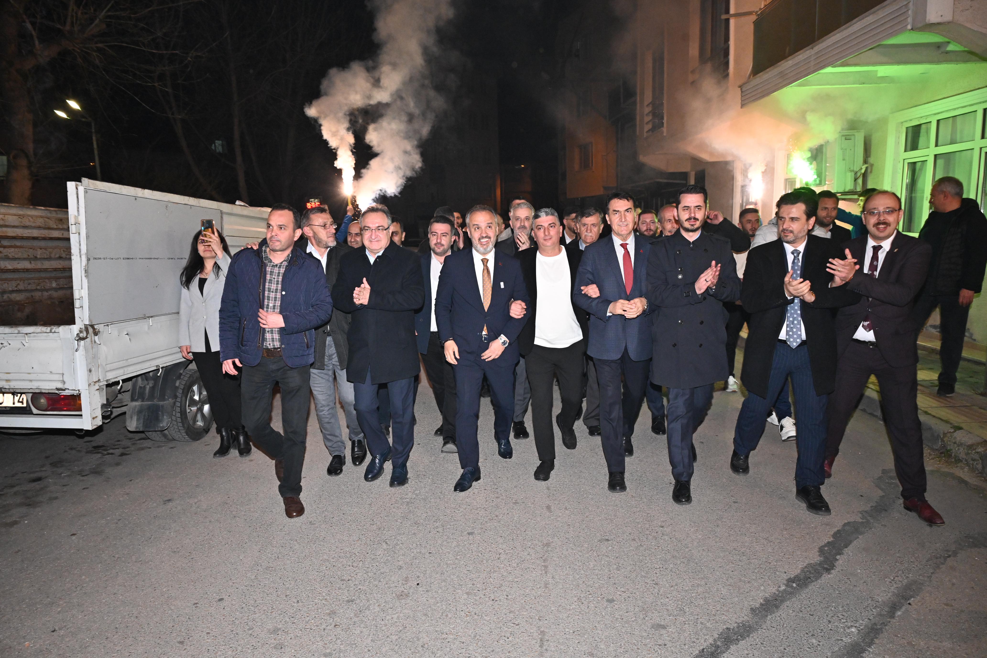BURSA – Bursa Büyükşehir Belediye Başkanı Alinur Aktaş, beraberindeki Osmangazi Belediye Başkanı Mustafa Dündar ile birlikte Küplüpınar mahallesinde büyük coşkuyla karşılandı. Gençler tarafından meşale ve havai fişeklerle karşılanan Başkan Aktaş, Küplüpınar Mahallesi’ne en kısa zamanda halı saha ve ana kucağı binası kazandırma sözü verdi.