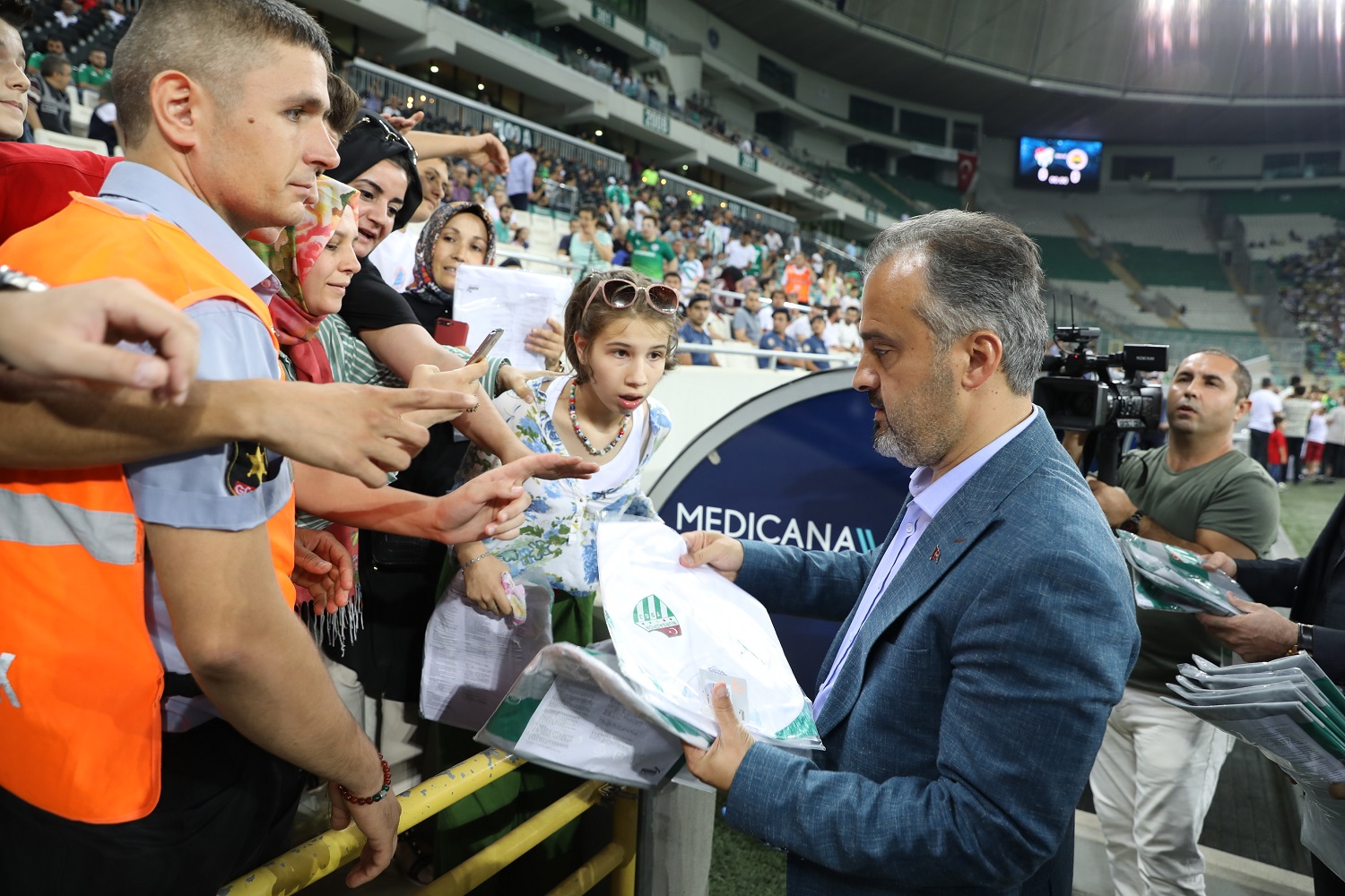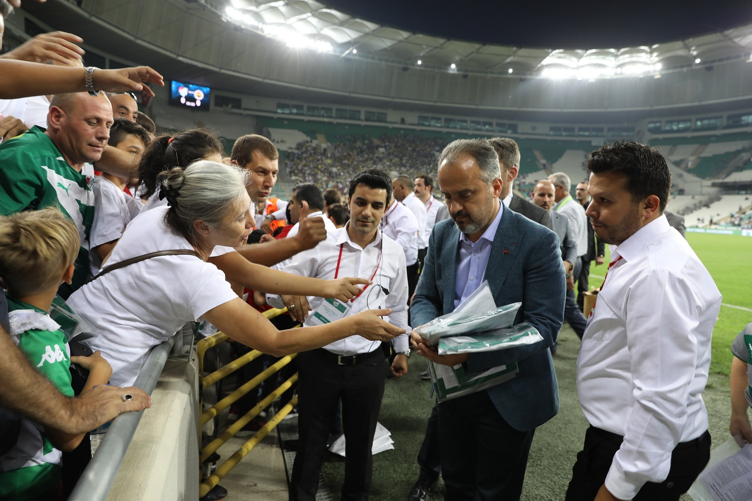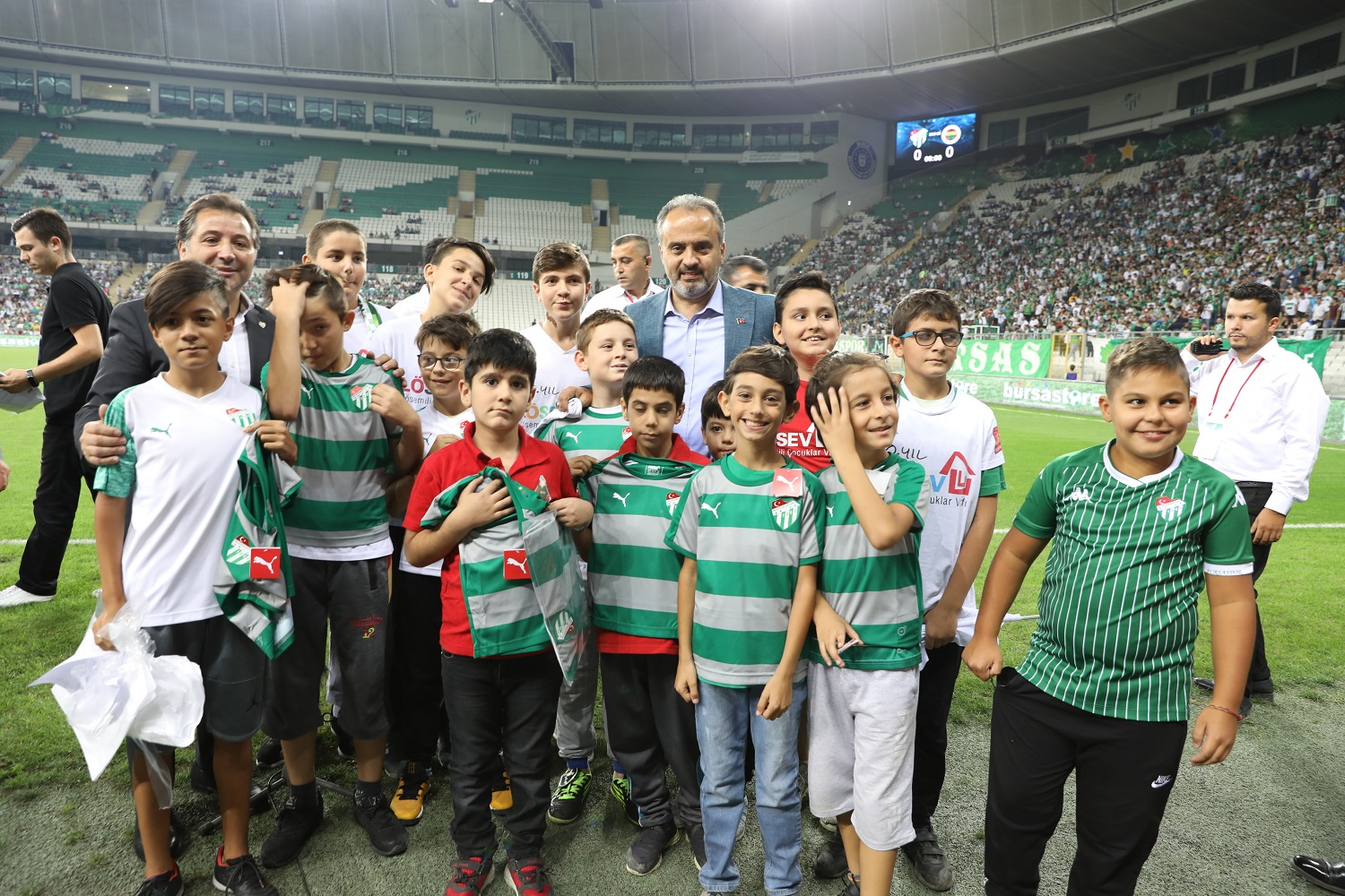 Fenerbahçe ve Bursaspor’un dünya çocuklarına farkındalık oluşturmak için düzenlediği maç, Büyükşehir Stadyumu’nda oynandı. Maçı Bursaspor Başkanı Mesut Mestan ile birlikte izleyen Büyükşehir Belediye Başkanı Alinur Aktaş, karşılaşma öncesinde tribünde yer alan çocuklara Bursaspor forması hediye etti.