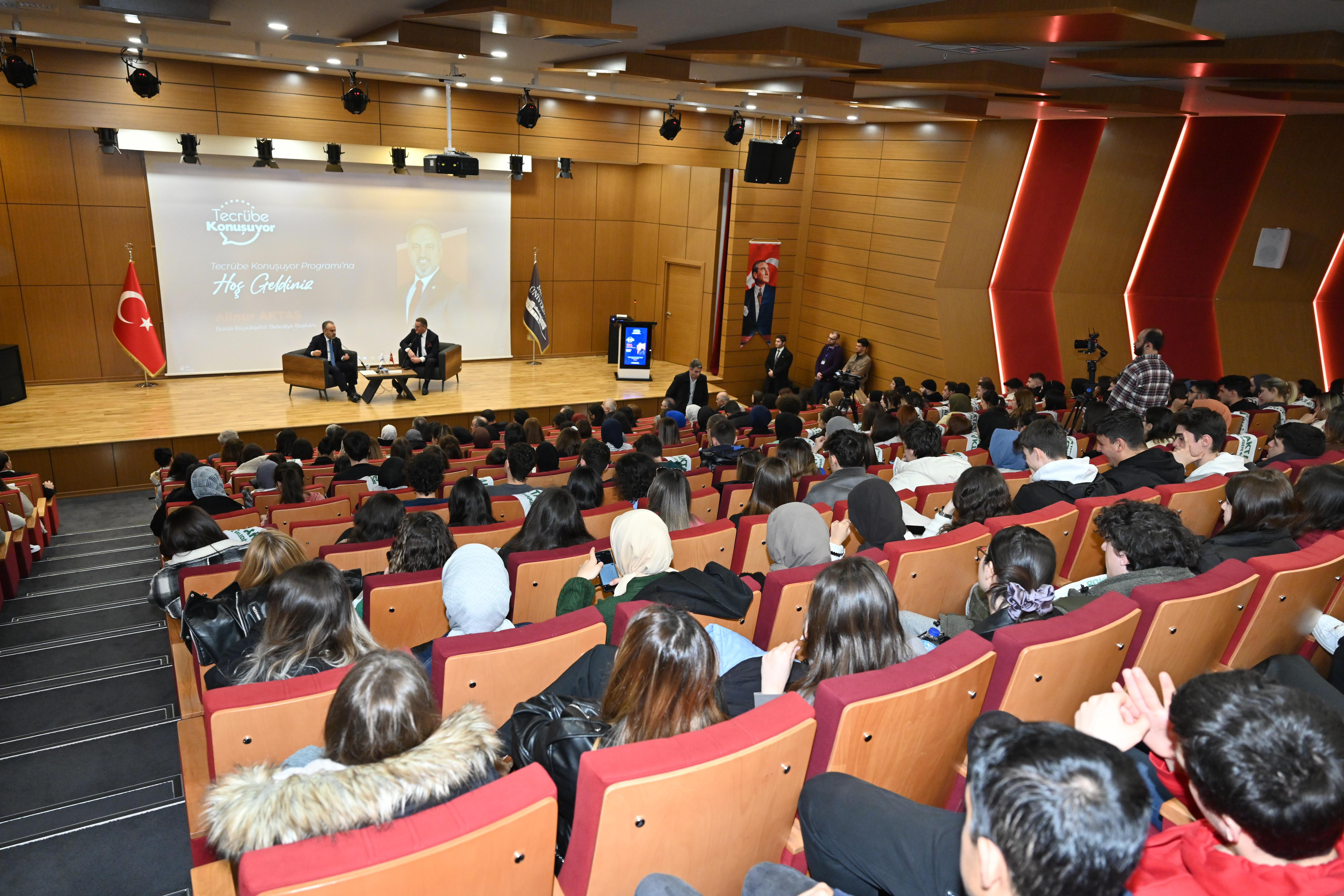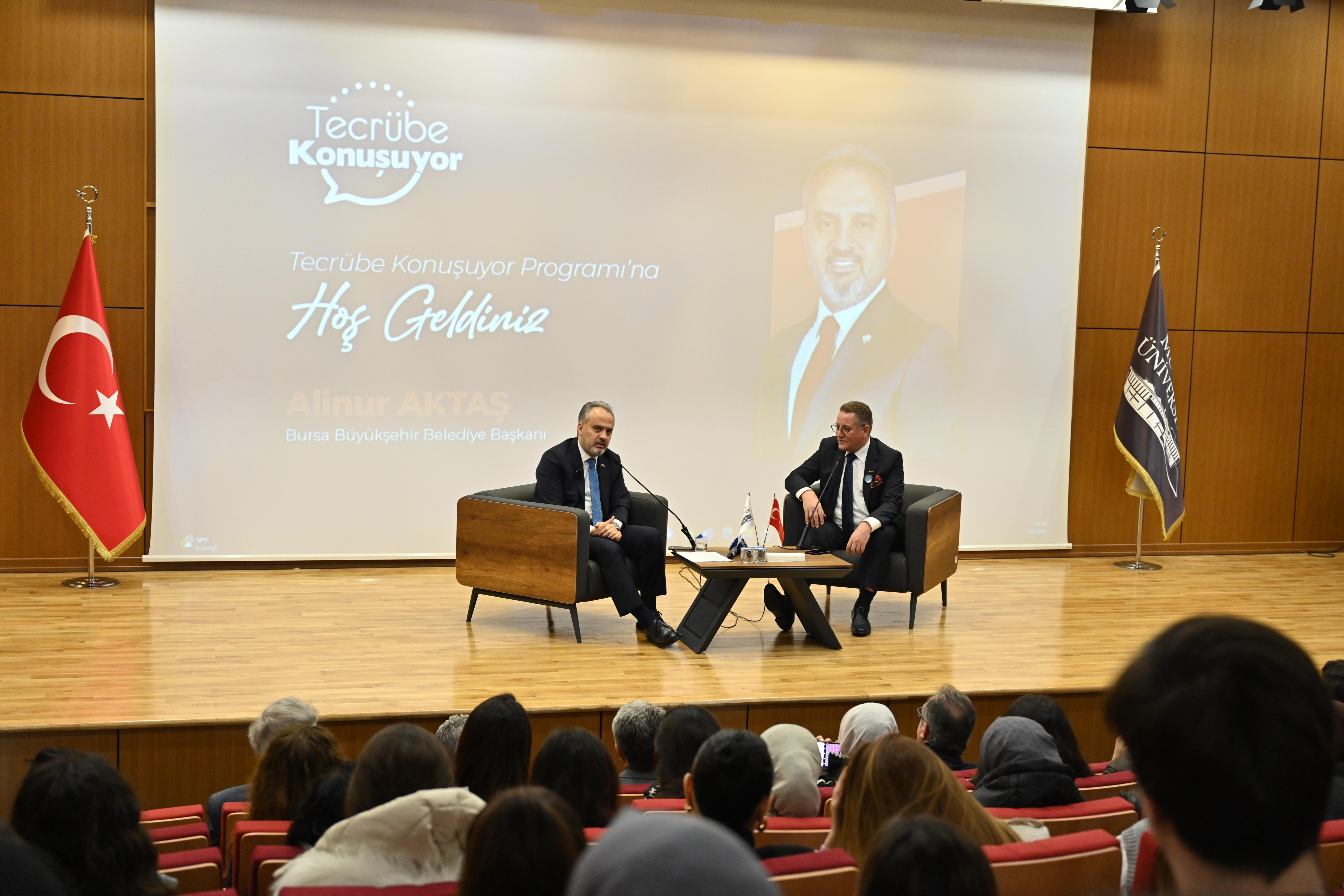 Yoğun programına rağmen sık sık eğitim kurumlarını gezip, öğrencilerle bir araya gelen Bursa Büyükşehir Belediye Başkanı Alinur Aktaş’ın yeni durağı, Mudanya Üniversitesi oldu. Konferans salonunda gerçekleşen programa, Büyükşehir Belediye Başkanı Alinur Aktaş, Mudanya Üniversitesi Mütevelli Heyeti Başkanı Gıyasettin Bingöl, Mütevelli Heyeti üyeleri, Rektör Prof. Dr. Emin Karip, eğitmenler ve öğrenciler katıldı. Moderatörlüğünü Mütevelli Heyeti üyesi Ali Mollasalih’in yaptığı programda konuşan Büyükşehir Belediye Başkanı Alinur Aktaş, hem öğrencilik hem de belediyecilik tecrübelerinden örneklerle gençlere tavsiyelerde bulundu. Mudanya Üniversitesi’nin kurularak Bursa’ya ve Türkiye’ye büyük güç kattığını belirten Başkan Aktaş, “Kendinize, ailenize, üniversitenize, şehrinize, devletinize güvenin. Elbette zorluklar var. Ama içinizde heyecan varsa kesinlikle başarılı olursunuz. Kendinizi geliştirmek için mutlaka bir bahane bulun. Aileleriniz sizi buraya daha insan olmanız, geleceğe güzel hazırlanmanız için gönderiyor. Size sunulan bu imkânları sonuna kadar kullanın. Artık insanlar diplomaya değil, küfenize neler doldurduğunuza bakıyor. Öğrencilik döneminizde kendinize yüklemeler yapın. Birkaç tane yabancı dil öğrenmelisiniz. Türkiye gelişime aç bir ülkedir. Bu süreçte gençlere büyük görevler düşüyor” diye konuştu.