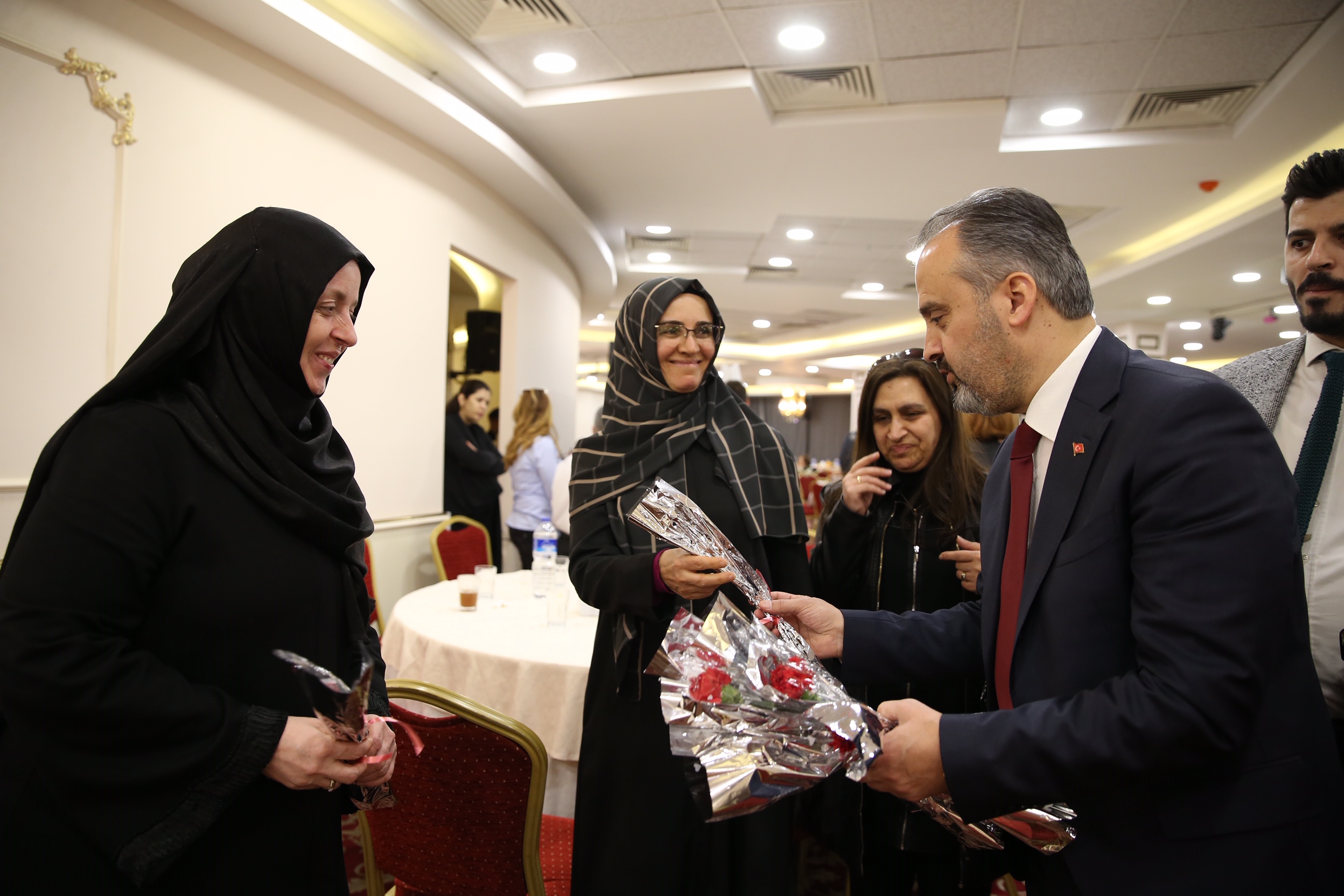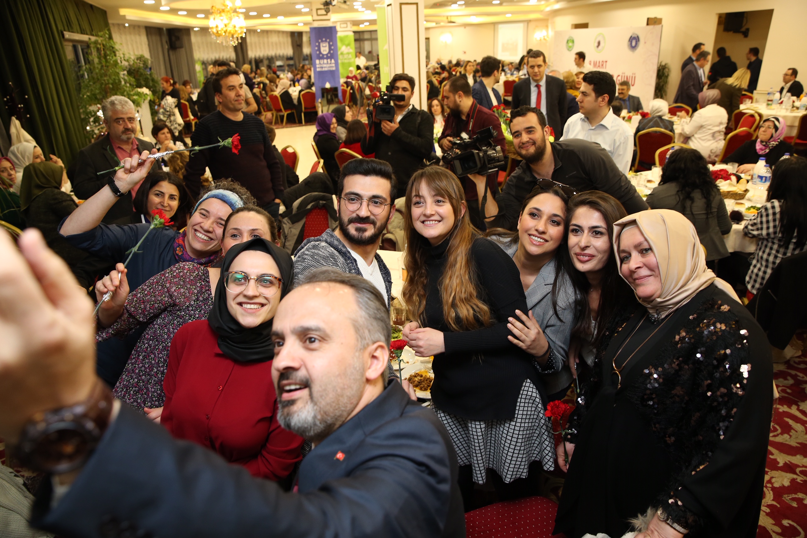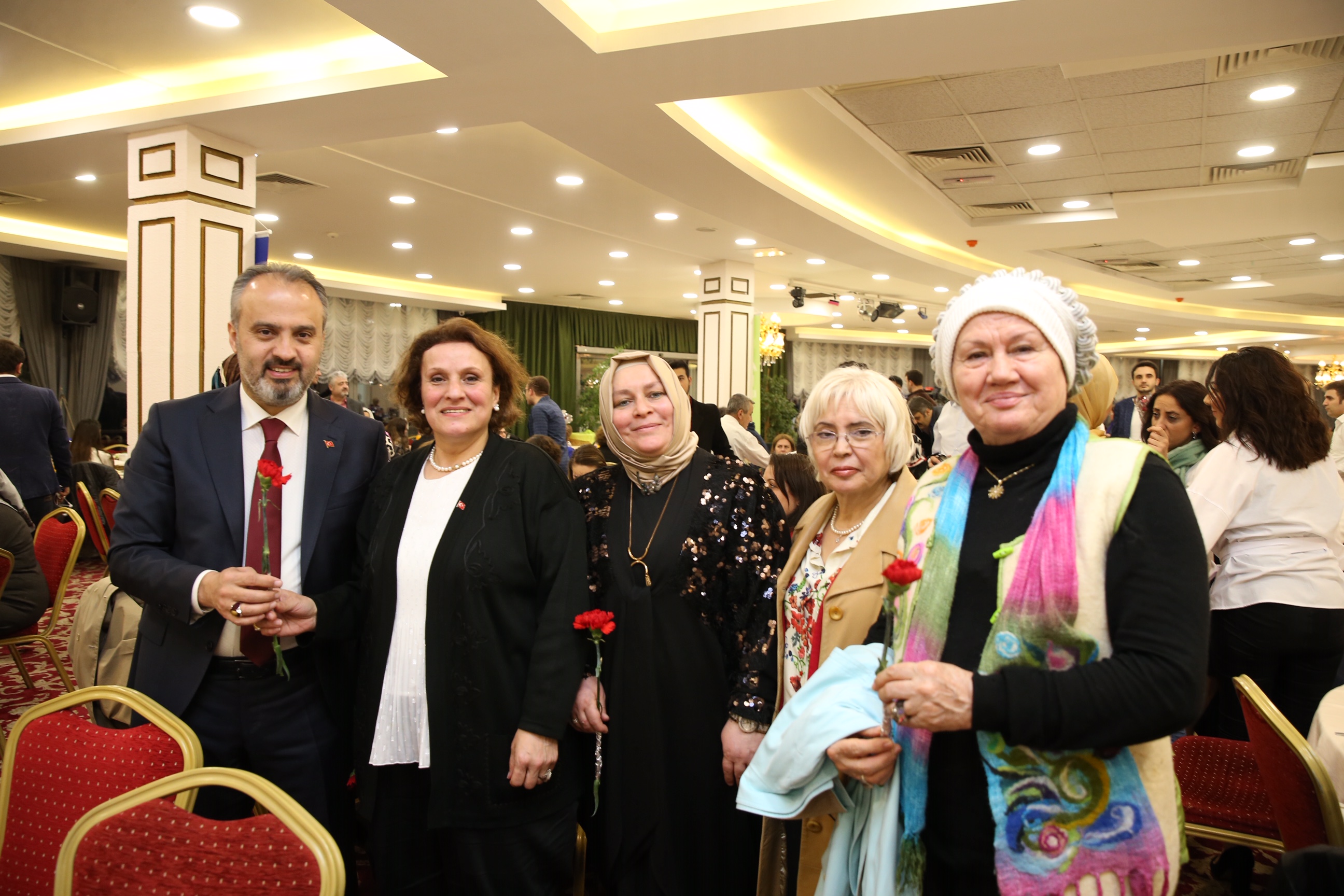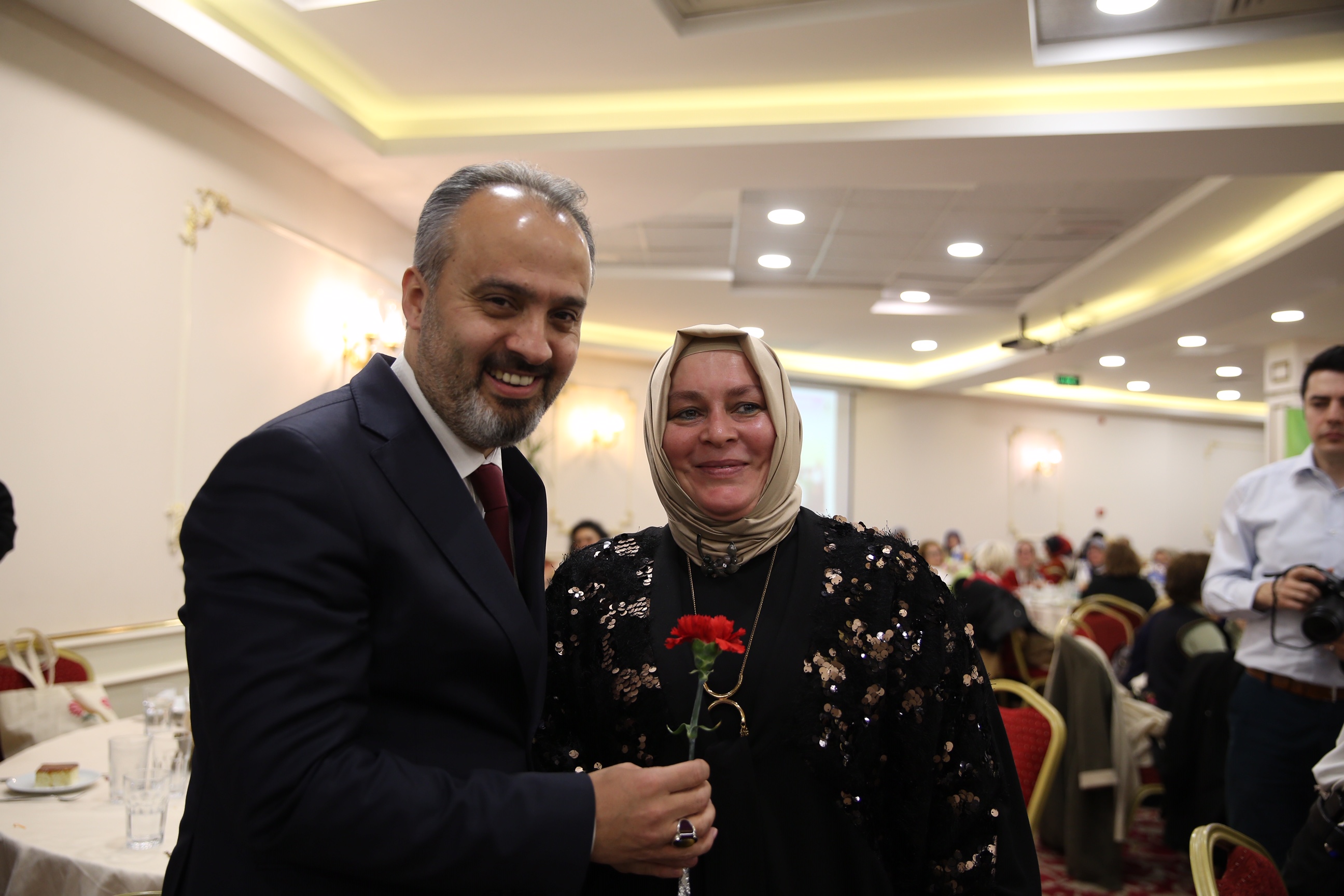 BURSA - Büyükşehir Belediyesi’nin desteğiyle Bursa Kent Konseyi ve Kadın Meclisi tarafından düzenlenen 8 Mart Dünya Kadınlar Günü Buluşması’na katılan Büyükşehir Belediye Başkanı Alinur Aktaş, eşi Sevinç Aktaş ile birlikte tüm masaları dolaşarak davetlilere karanfil hediye etti.