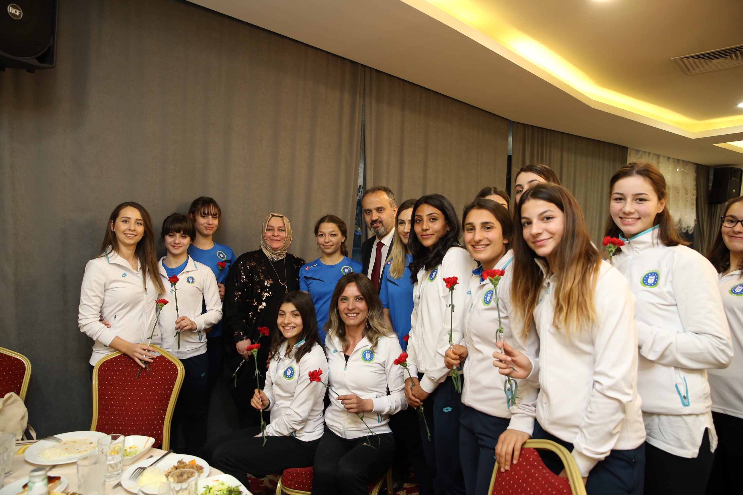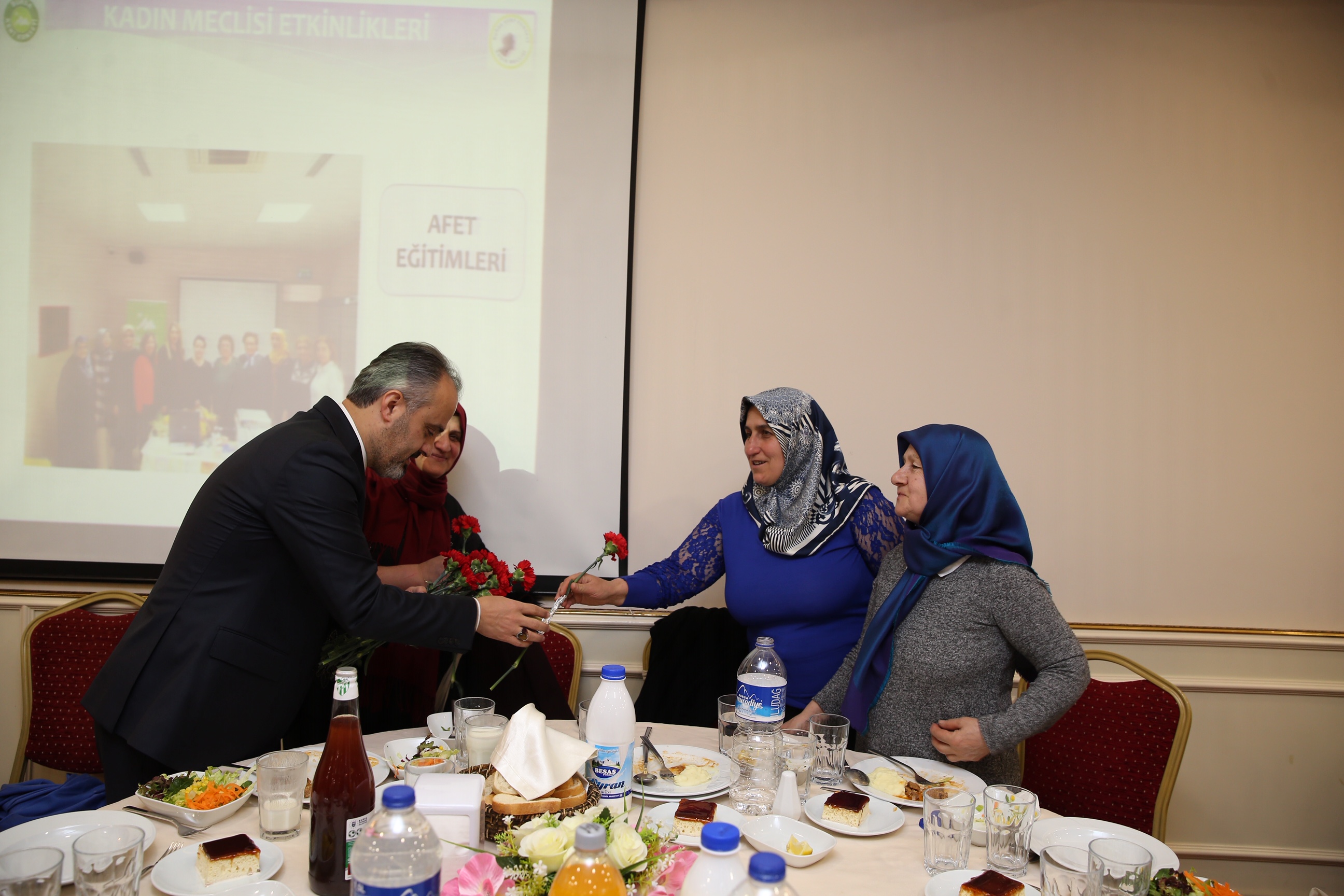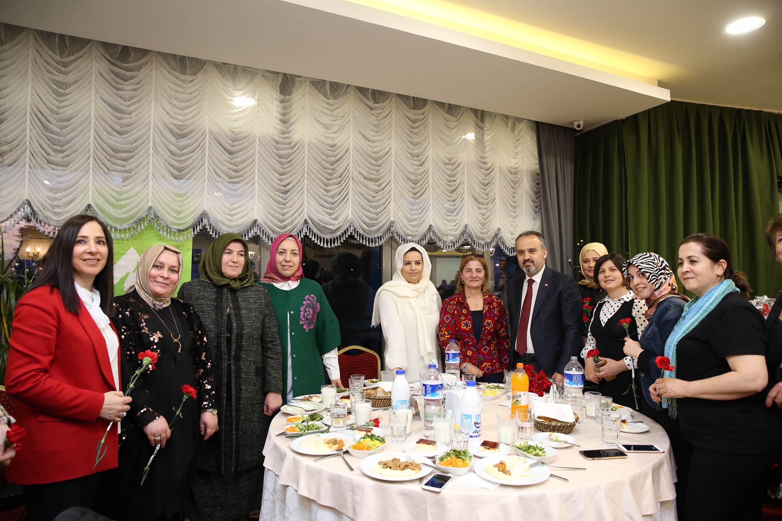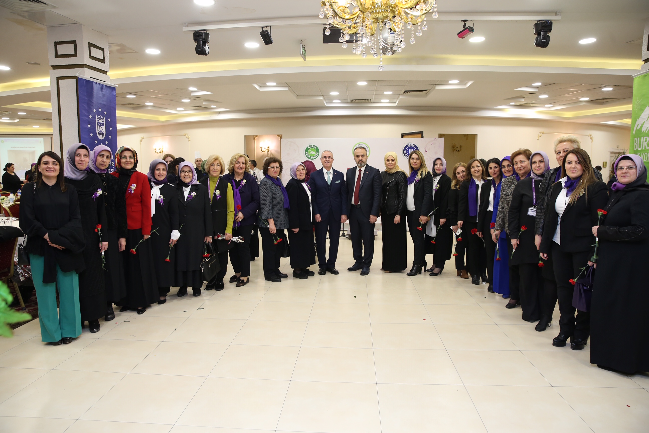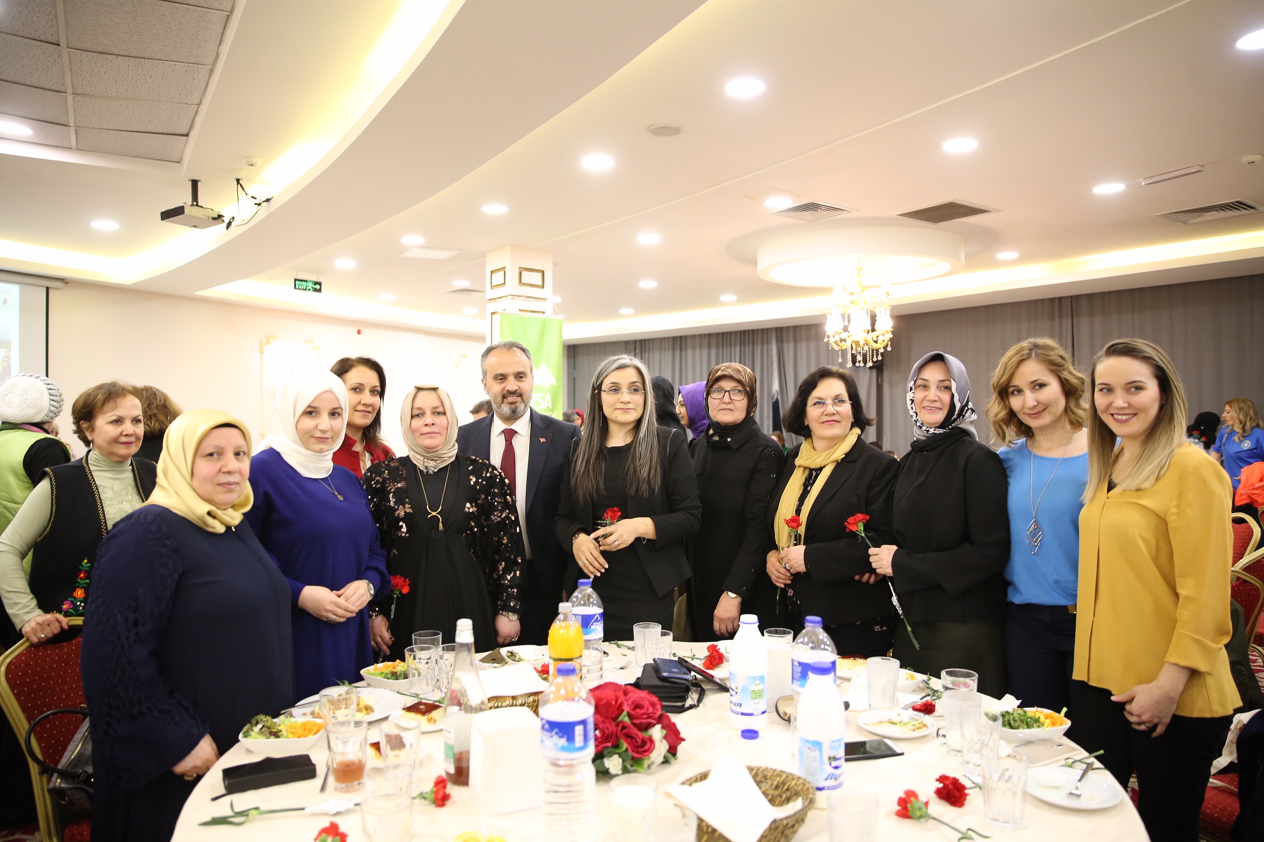 BURSA - Büyükşehir Belediyesi’nin desteğiyle Bursa Kent Konseyi ve Kadın Meclisi tarafından düzenlenen 8 Mart Dünya Kadınlar Günü Buluşması’na katılan Büyükşehir Belediye Başkanı Alinur Aktaş, eşi Sevinç Aktaş ile birlikte tüm masaları dolaşarak davetlilere karanfil hediye etti.