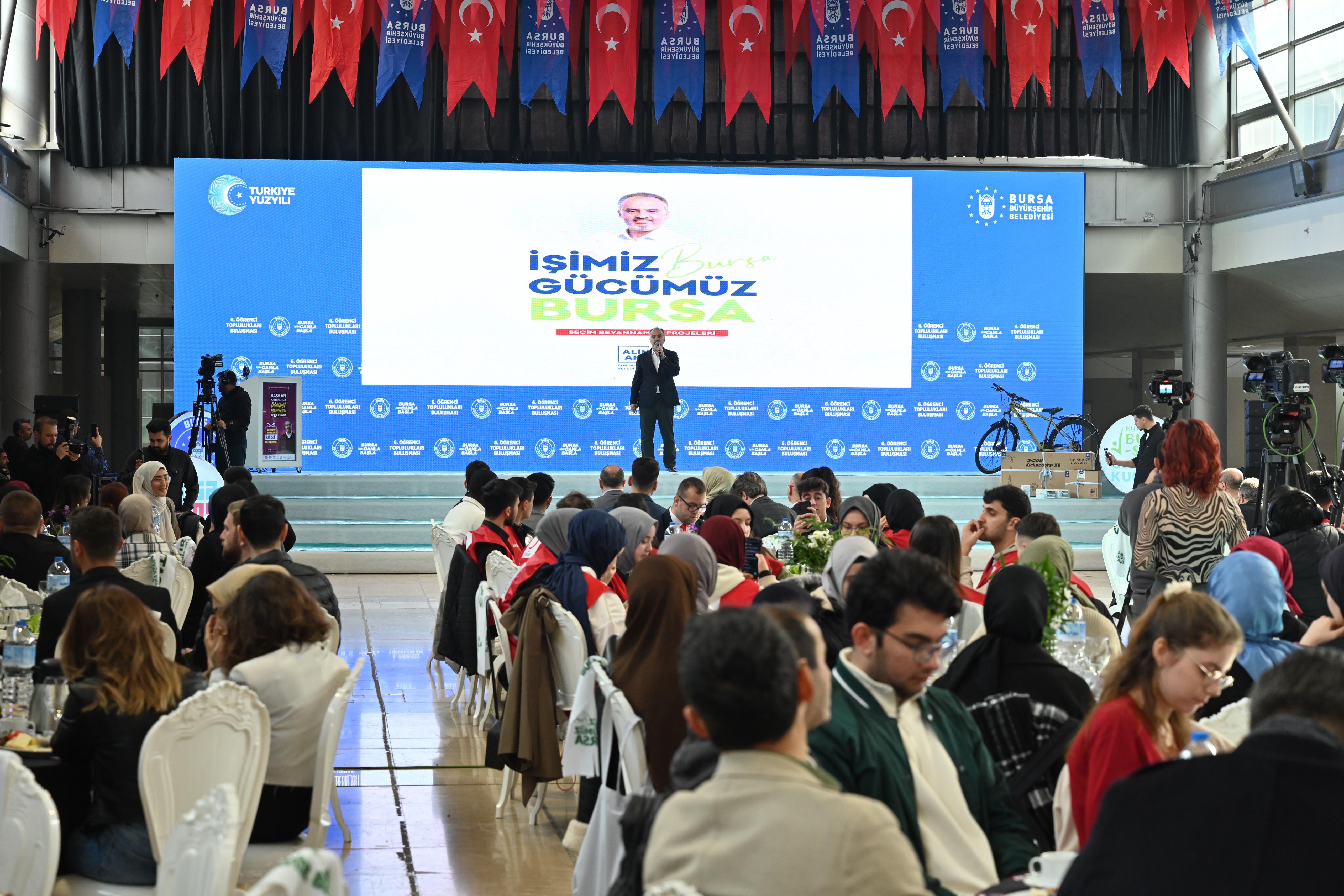 ‘Hayat Bursa’daki Gençlere Güzel’ mottosuyla üniversite öğrenci şenliklerinden şehir içi ve şehir dışı gezilerine, gençlik kamplarından gençlik buluşmalarına kadar birçok program düzenleyen Bursa Büyükşehir Belediyesi, gençlik merkezleri, millet kıraathaneleri ve spor salonlarına varana kadar her alanda gençlerin yanında olmaya devam ediyor. Bu sene 6’ncısı düzenlenen ‘Başkan Kahvaltıda Öğrenci Toplulukları ile Buluşuyor’ toplantısına, Uludağ Üniversitesi, Bursa Teknik Üniversitesi ve Mudanya Üniversitesi öğrenci toplulukları üyesi 1500’e yakın genç katıldı. Atatürk Kongre Kültür Merkezi Fuaye Alanı’nda keyifli bir atmosferde gerçekleşen programa, Bursa Büyükşehir Belediye Başkanı Alinur Aktaş’ın yanı sıra Bursa Milletvekili Mustafa Varank, AK Parti İl Başkanı Davut Gürkan ve Uludağ Üniversitesi Rektörü Prof. Dr. Ferudun Yılmaz da katıldı.