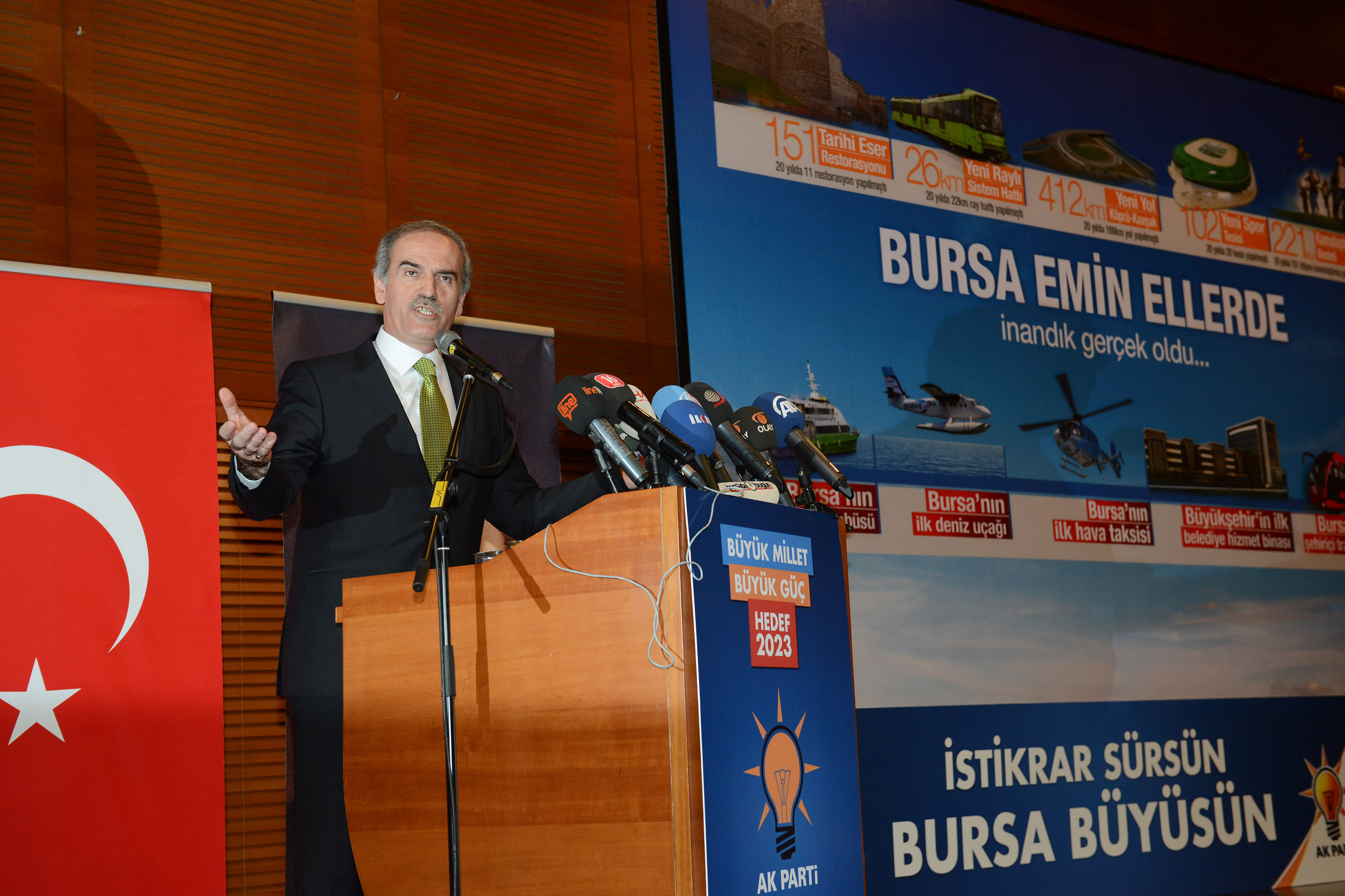 Büyükşehir Belediye Başkanı ve yeni dönem için Başkan adayı Recep Altepe de yerel yönetimlerde yeni bir dönemin başladığını vurguladı. Büyükşehir Belediye Başkanı’nın ikinci dönem hizmetlerine devam etmesi ve sürekliliğin, istikrarın sağlanması noktasında da Bursa’da bir ilkin yaşandığını dile getiren Başkan Altepe, Bursa’nın bu fırsatı en iyi şekilde değerlendireceğine inandığını kaydetti. Yerel yönetimlerde geçen 5 yıla damga vurduklarını, deniz otobüsü, deniz uçağı, yerli tramvay, helikopter, stadyum gibi projelerle en fazla konuşulan belediye olduklarının altını çizen Başkan Altepe, “Bugüne kadar yapılanları yeterli görmüyoruz, Bursa için ne yapsak az. Şimdiye kadar yaptıklarımız bir hiç, şimdiden sonra gerçek anlamda yerel yönetimi göstereceğiz. Hedefimiz dünya kenti olmak. Bizim yarıştığımız şehirler Türkiye’deki şehirler değil. Avrupa ve dünya şehirleriyle yarışıyoruz. Bursa bu dönemde büyük bir hamle yapacak. En güzel uygulamalar Bursa’da gerçekleşecek. Geleceği inşa edeceğiz. Bursa bugüne kadar kendine yakışanı yaptı. Seçim bizim için bir imtihan. Kapı kapı dolaşacağız. Hep birlikte, birlik beraberlik içinde gece gündüz koşturacağız. Seçim çalışması nasıl yapılır herkese göstereceğiz. Başta Başbakanımız Recep Tayyip Erdoğan olmak üzere, Başbakan Yardımcımız Bülent Arınç’ı, milletvekillerimizi, bize güvenenleri mahcup etmeyeceğiz. Bursa rekorları kırarak, oyunu en çok artıran şehir olacak. Zaferi en güzel skorla alacağız” diye konuştu.