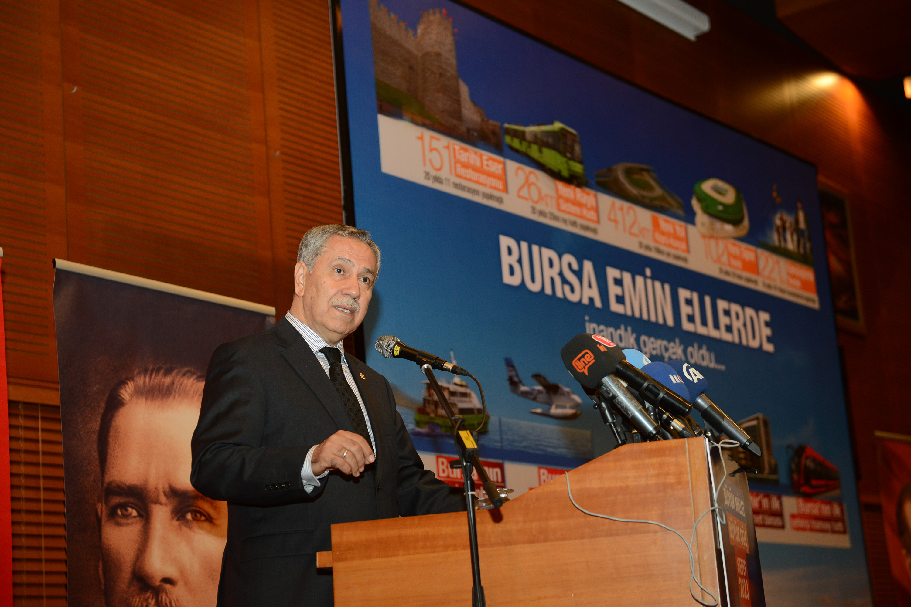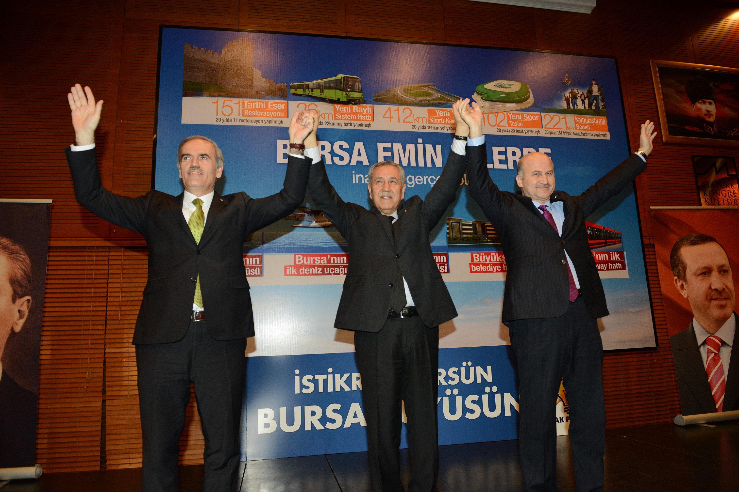 Başbakan Recep Tayyip Erdoğan’ın geçtiğimiz hafta İstanbul’da aralarında Bursa’nın da bulunduğu illerin belediye başkan adaylarını tanıttığı toplantıya önceden planlanan Batman programı nedeniyle katılamayan Başbakan Yardımcısı Bülent Arınç, AK Parti İl Başkanlığı tarafından düzenlenen Büyükşehir Belediye Başkanı aday tanıtım toplantısında partililerle bir araya geldi. Atatürk Kongre Kültür Merkezi’nde düzenlenen toplantıya Arınç’ın yanı sıra Büyükşehir Belediye Başkanı Recep Altepe, ilçe belediye başkanları ve belediye başkan adayları ile çok sayıda partili katıldı. Toplantıya ilgi yoğun olunca oturacak yer bulamayan partililerin büyük bir kısmı toplantıyı ayakta takip etti.