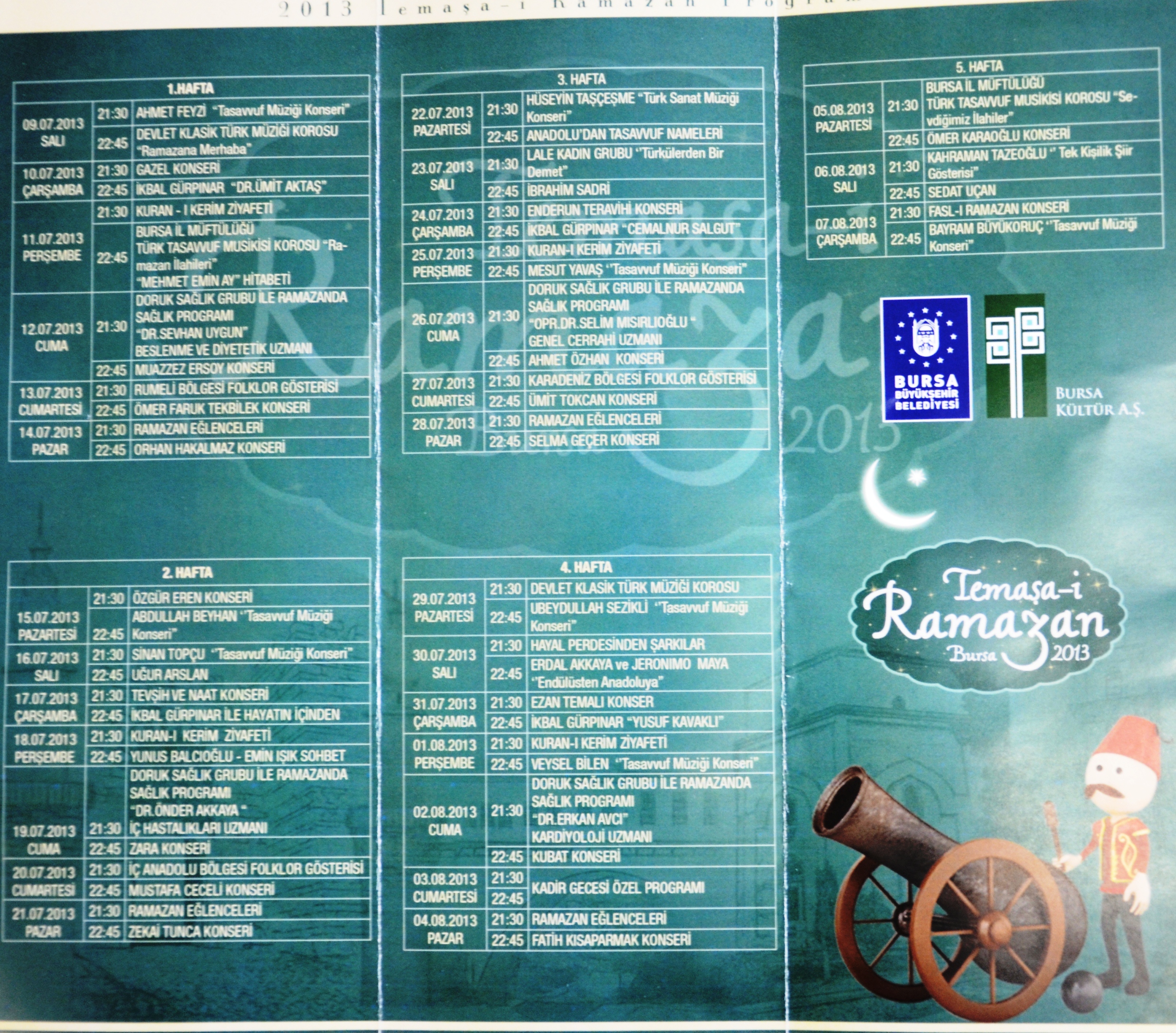 Programda yerel tasavvuf müziği sanatçılarından Hüseyin Taşçeşme, Ubeydullah Sezikli, Sinan Topçu, Veysel Bilen, Mesut Yavaş, Abdullah Beyhan, Ahmet Feyzi ve Bayram Büyükoruç’un programları severek izlenecek. Gazeller, kasideler, naatlar ve ilahiler´in sema gösterisi eşliğinde icralarının yapılacağı gazel konseri, teşvih ve naat konseri, Enderun teravihi konseri ve ezan temalı konserleri de programda yer alıyor. Kadir gecesinde Mevlid, Kur’an-ı Kerim ve tasavvuf müziğinin nadide örneklerinden hazırlanmış repertuarın yanı sıra Mevlevi mukabelesi, niyaz ilahisi ve okunacak aşr-ı şerif ile kadir gecesi programının da keyifle dinlenecek. Bursa’da Ramazan boyunca her perşembe hafızlardan Kur’an-ı Kerim ziyafeti yaşanacak, her cuma günü de ‘Ramazan’da Sağlık’ programlarında uzman doktorlar halkı bilinçlendirecek.