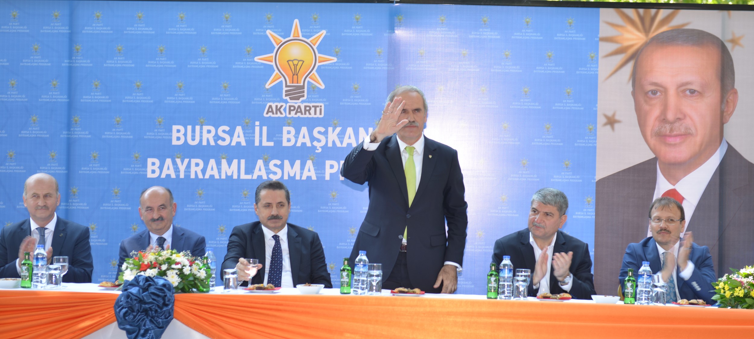 AK Parti Bursa İl Başkanlığı tarafından düzenlenen bayramlaşma töreni, Sağlık Bakanı Mehmet Müezzinoğlu, Çalışma ve Sosyal Güvenlik Bakanı Faruk Çelik ve Bursa Büyükşehir Belediye Başkanı Recep Altepe’nin katılımıyla Merinos Parkı içerisindeki Gönül Dostları Sofrası’nda yapıldı.