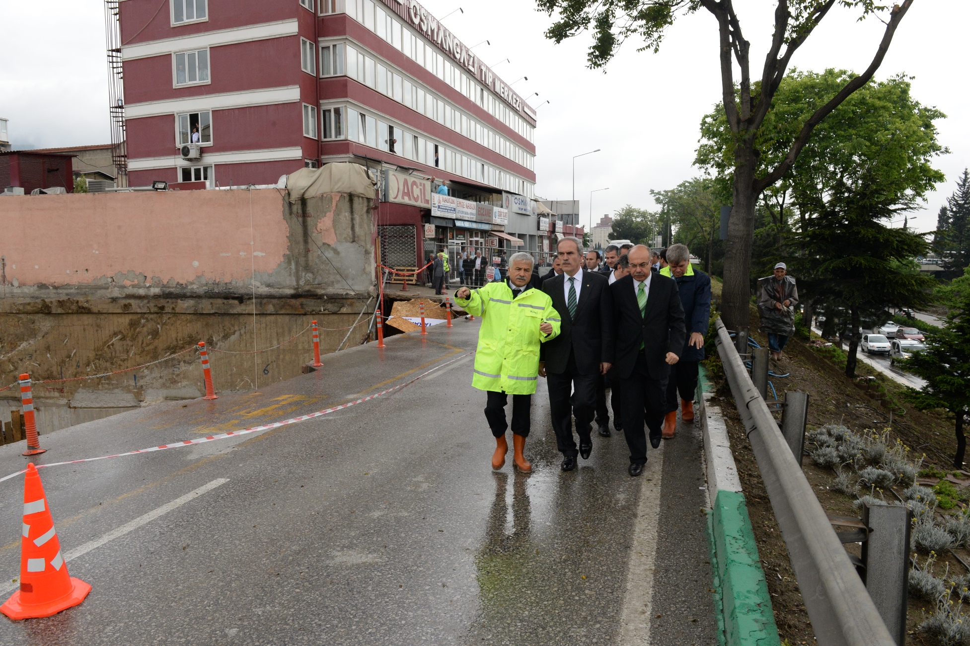 Bursa’da şiddetli yağış, bir inşaatın yanındaki kanalizasyon borusunun patlamasına ve Santral Garaj-Ankara bağlantı yolunun çökmesine yol açtı. Çöken karayolu, muhtemel bir facianın önüne geçilmesi amacıyla zabıta ekipleri tarafından trafiğe kapatıldı. Büyükşehir Belediye Başkanı Recep Altepe, BUSKİ Genel Müdürü İsmail Hakkı Çetinavcı’yla birlikte olay yerinde incemele yaparak alınacak tedbirleri görüştü.