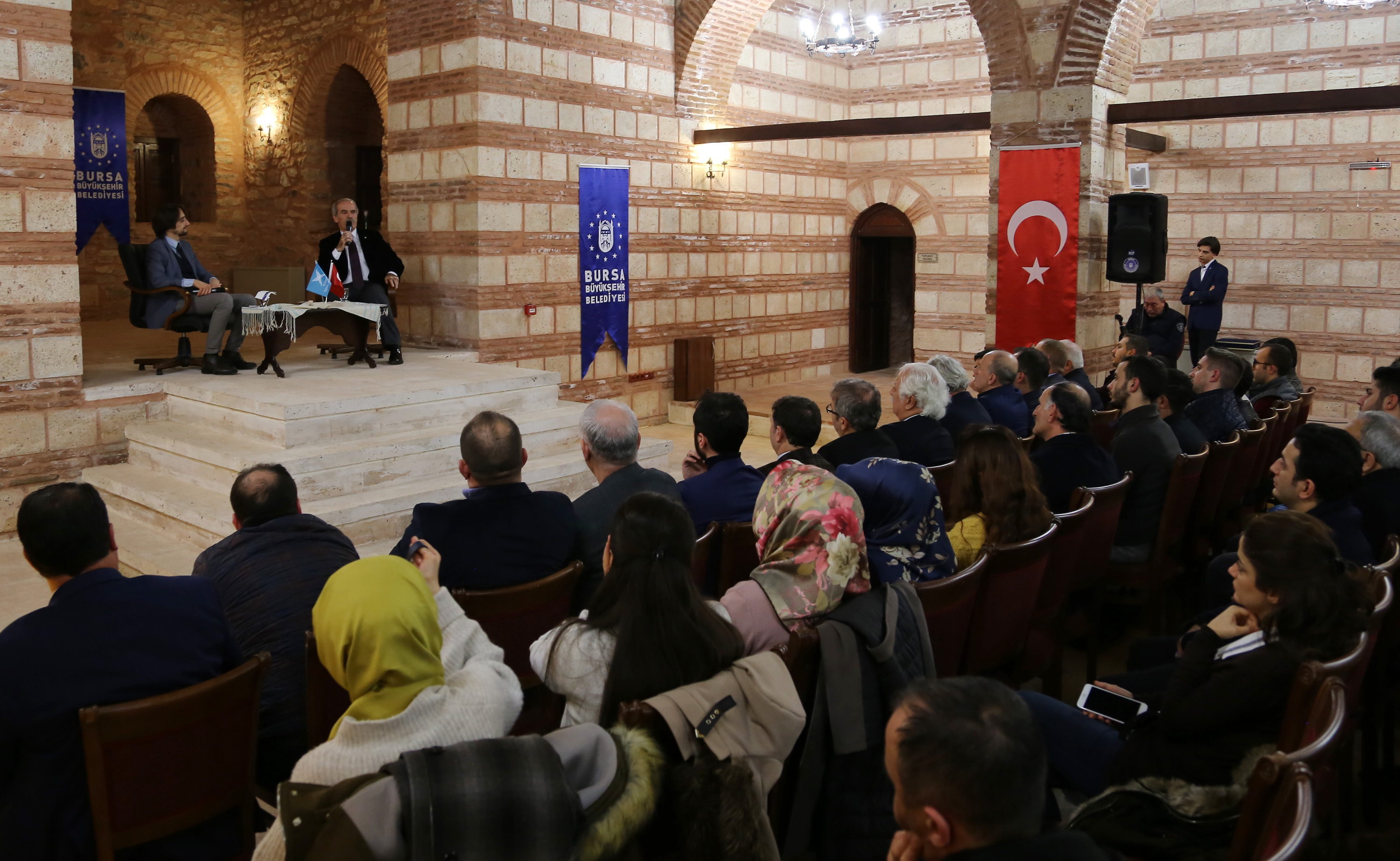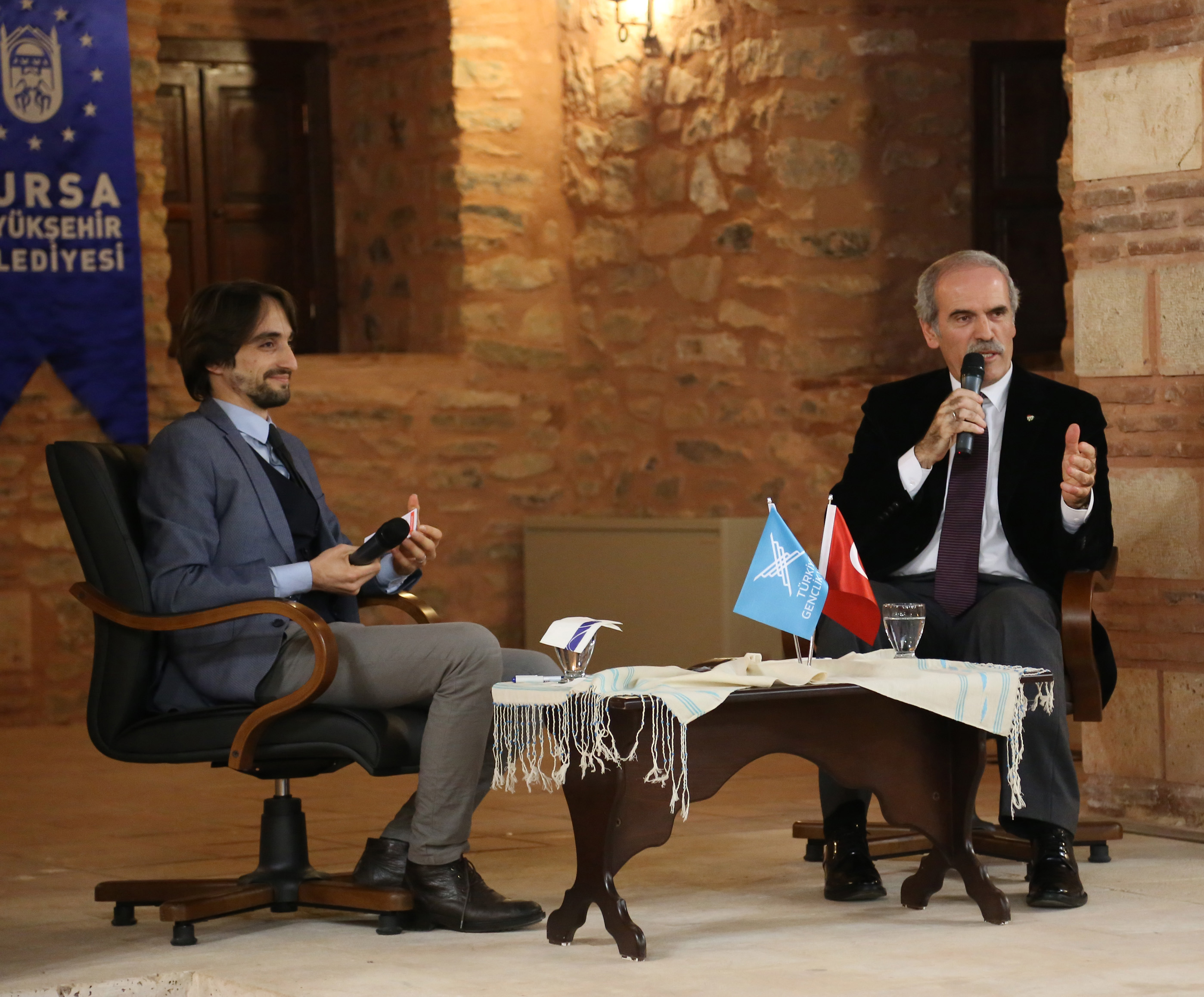Bursa Büyükşehir Belediye Başkanı Recep Altepe, Türkiye Gençlik Vakfı (TÜGVA) Bursa İl Temsilciliği tarafından Bayezıd Paşa Medresesi’nde düzenlenen söyleşiye konuk oldu. Başkan Altepe, TÜGVA Bursa İl Temsilcisi Hüseyin Yavuz’un moderatörlüğünde gerçekleştirilen söyleşide, mesleki ve siyasi yaşamına dair anılarını gençlerle paylaştı. Başkan Altepe, Bursa’da yaşamanın mutluluğunu yaşadığını söyleyerek, “Ne kadar şükretsek az, böyle güzel bir şehirde ve ülkede yaşıyoruz, böyle büyük bir ecdadın torunlarıyız. Üzerimizde büyük bir sorumluluk ve misyon var. Ben böyle gördüm, çocukluğumdan beri hep koşturma halinde, sosyal hayatın içinde oldum. Çocuk yaşlarımdan beri büyükleri dinlemek, bu tür toplantılara gitmek ve orada büyüklerden bir şey öğrenebilmek, onların anılarını ve tavsiyelerini dinlemek gerçekten benim için en büyük zevkti…” diyerek enerjisinin ve dinamik çalışma temposunun sırrını paylaştı.