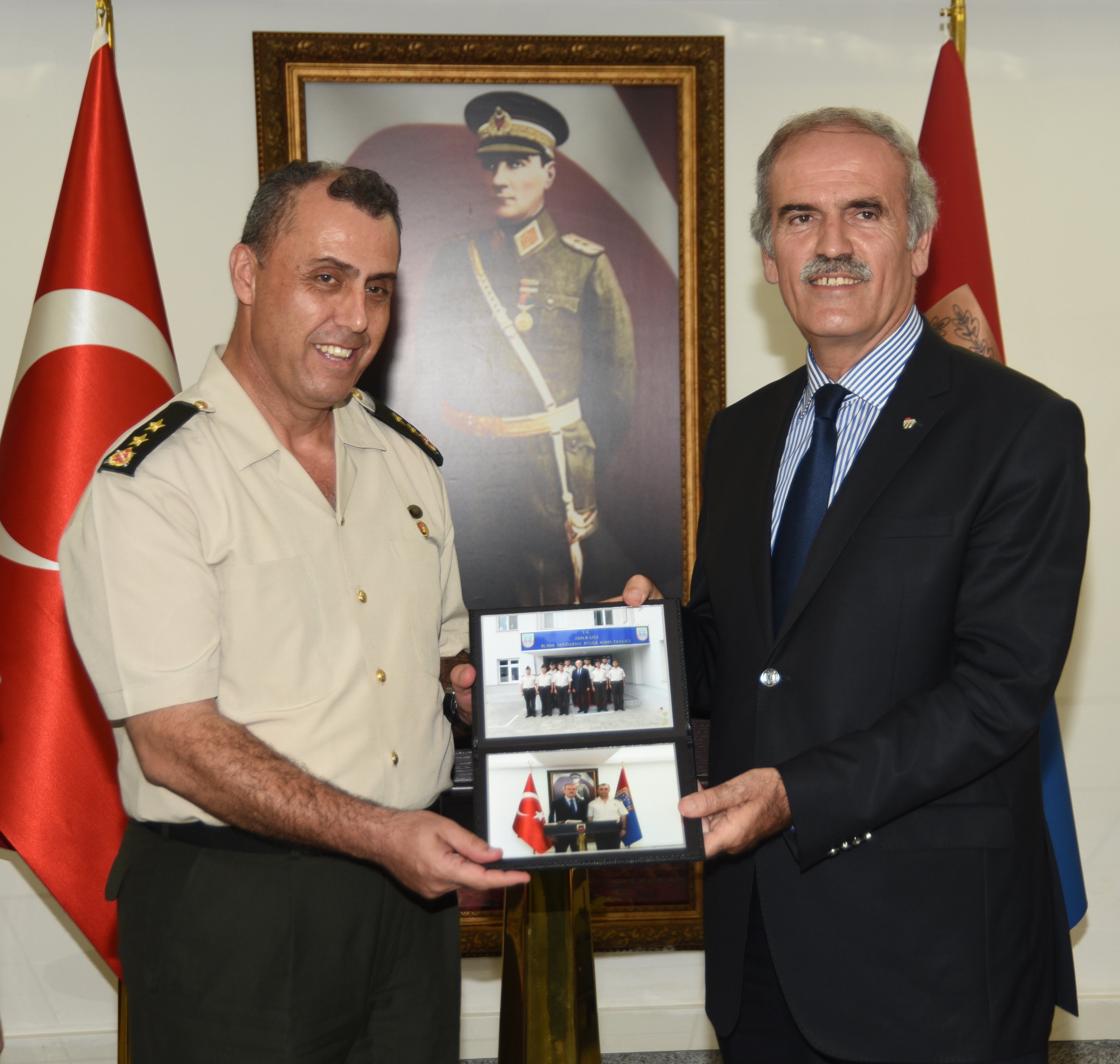 Bursa Büyükşehir Belediye Başkanı Recep Altepe, Garnizon Komutanı Tümgeneral Seyfullah Saldık’ı ziyaret etti. Tümgeneral Saldık’ı cesaretli ve vatansever tavrından dolayı Bursalılar adına tebrik eden Başkan Altepe, “15 Temmuz’da Türkiye Cumhuriyeti tarihi bir gün yaşadı ve büyük bir tehlike atlattı. Demokrasiye, devlete, devlet güçlerine ve yürüyen sisteme karşı illegal bir kalkışma yaşandı. Burada silahla devleti ele geçirme girişimi başlatıldı. Yapılan bu girişim de akamete uğradı. Bu işte dik ve dirayetli duran, gerçek anlamda yönetim kadrolarının sözüne uyan, bu şekilde kargaşa oluşmasına sebep olmayan, yönetime katkı koyan, burada illegal yapılanmaya meydan bırakmayan, bu konuda güçlü bir iradeyi ortaya koyarak boşluk bırakmayan ve başta Bursa’mız olmak üzere Balıkesir, Çanakkale, Kütahya, Bilecik, Yalova’da da düzeni sağlayan Jandarma teşkilatımızdır… Dünya önüne gerçekleşen bu olayda güzel bir imtihan veren Jandarma teşkilatımıza, başta Tümgeneral Seyfullah Saldık Paşa’mıza ve bu bölgenin bu oyuna ait olmamasını sağlayan devlet güçlerine, komuta kademesinin emrinden ayrılmayan değerli komutanlarımıza, tüm teşkilatımıza Bursa halkı adına şükranlarımızı arz ediyoruz. Bu iradeyi ortaya koydukları için de kendilerini sonuna kadar destekliyoruz” diye konuştu.