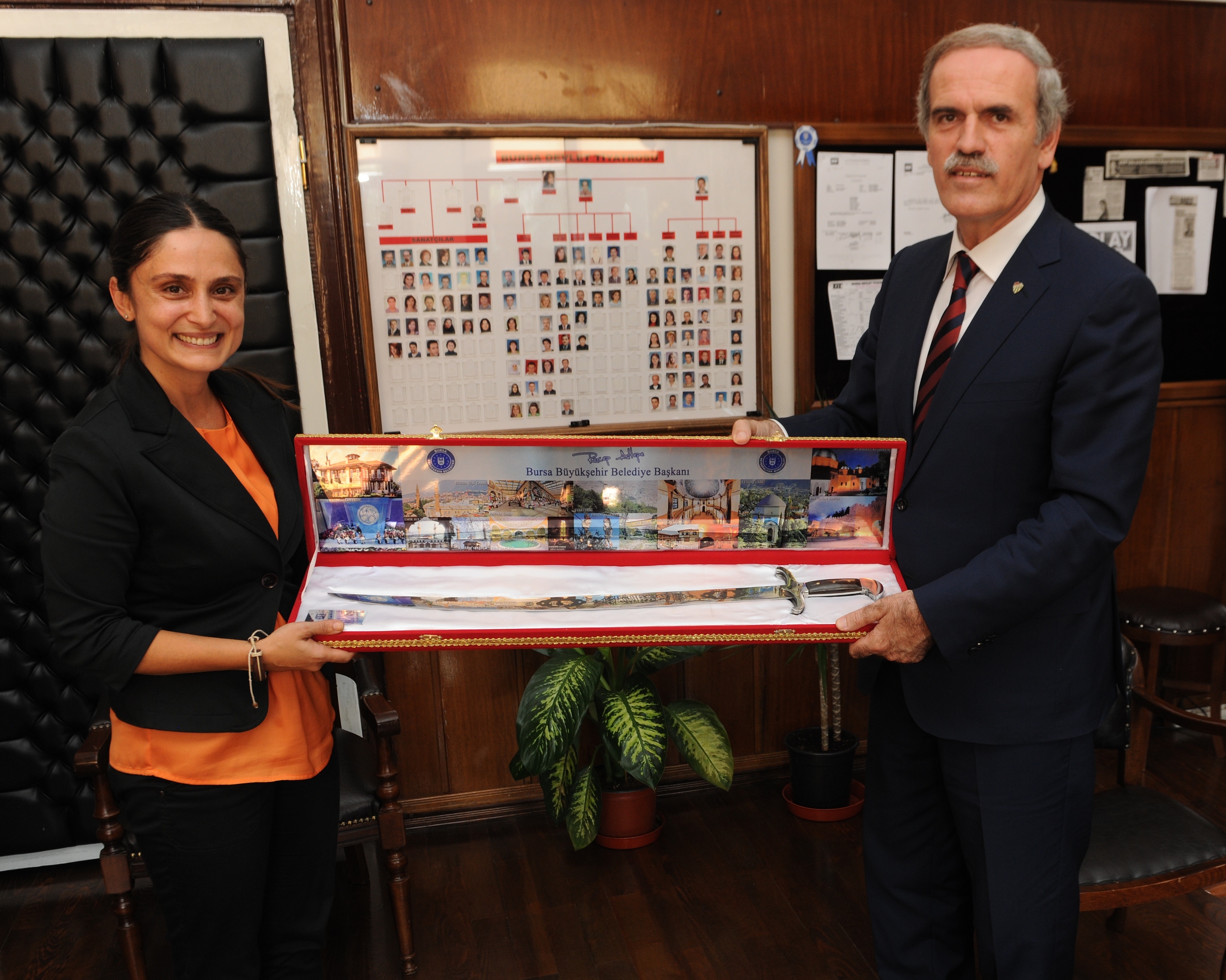 Bursa Devlet Tiyatrosu’nun yeni müdürü Arzu Tan Bayraktutan’dan çalışmaları ve ‘Tohum ve Toprak’ oyunu hakkında bilgiler alan Başkan Altepe, tiyatro sanatının, Bursa’nın kültürel yaşamının vazgeçilmez bir öğesi olduğunu ifade etti. Başkan Altepe, Bursa’da tiyatronun daha çok kişiye ulaşması adına yapılan çalışmaları desteklediklerini anlatarak, ‘Tohum ve Toprak’ adlı yepyeni oyunuyla sanatseverlerle buluşan Bursa Devlet Tiyatrosu’na yeni sezonda başarılar diledi. BDT Müdürü Arzu Tan Bayraktutan da Başkan Altepe’nin ziyaretinden dolayı mutluluk duyduklarını ifade ederek, yeni sanat sezonunda sanatseverlerin birbirinden güzel oyunlarla buluşacağına değindi. Başkan Altepe, ayrıca, Bayraktutan’a Bursa’ya özgü bıçak hediye etti.