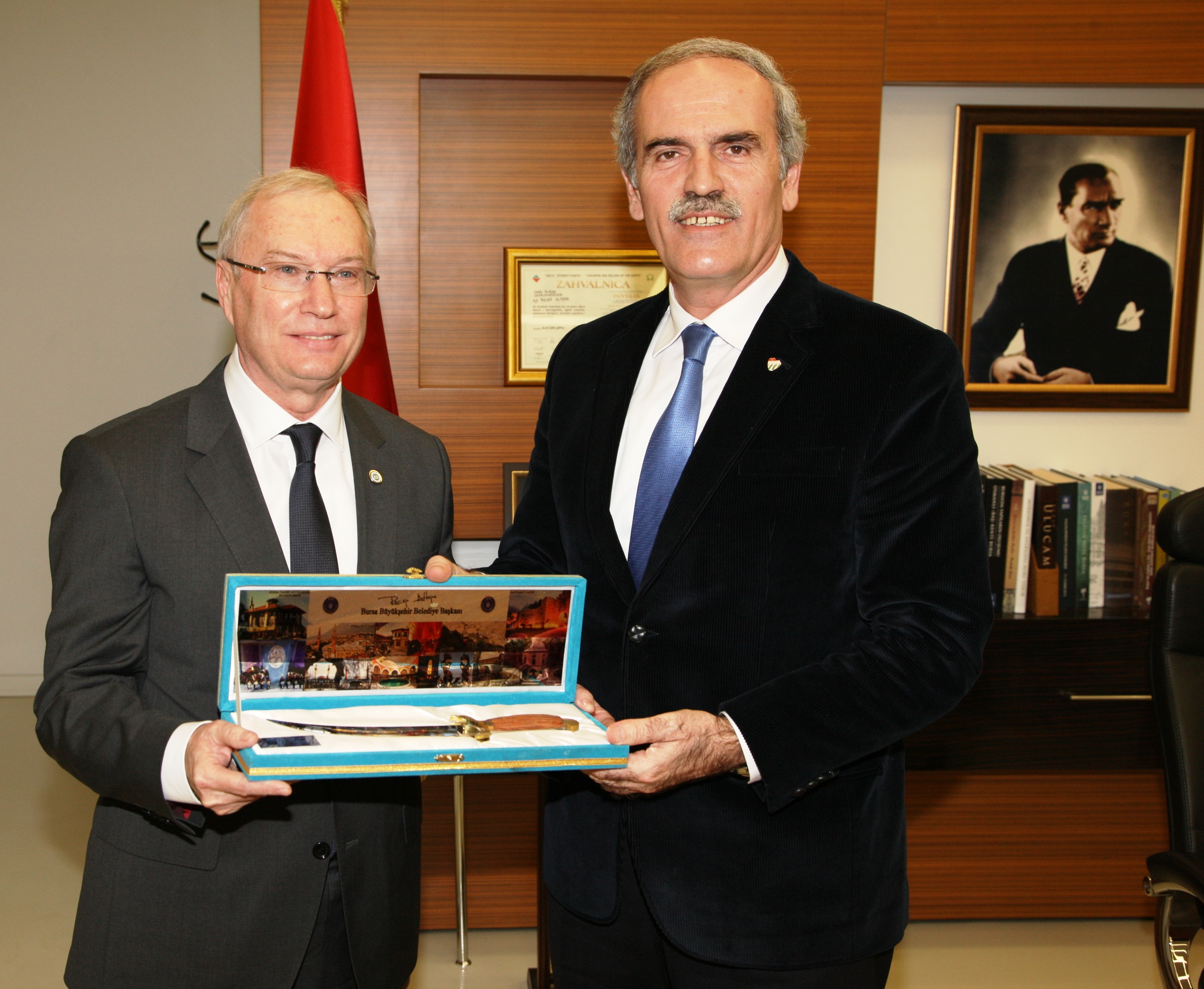BOSİAD Başkanı İlker Oral da Bursa’da çevre odaklı faaliyetleri desteklediklerini ve herkesin üzerine düşeni yapması gerektiğini vurguladı. Ziyaretin sonunda Başkan Recep Altepe, İlker Oral’a el yapımı Bursa bıçağı hediye etti.