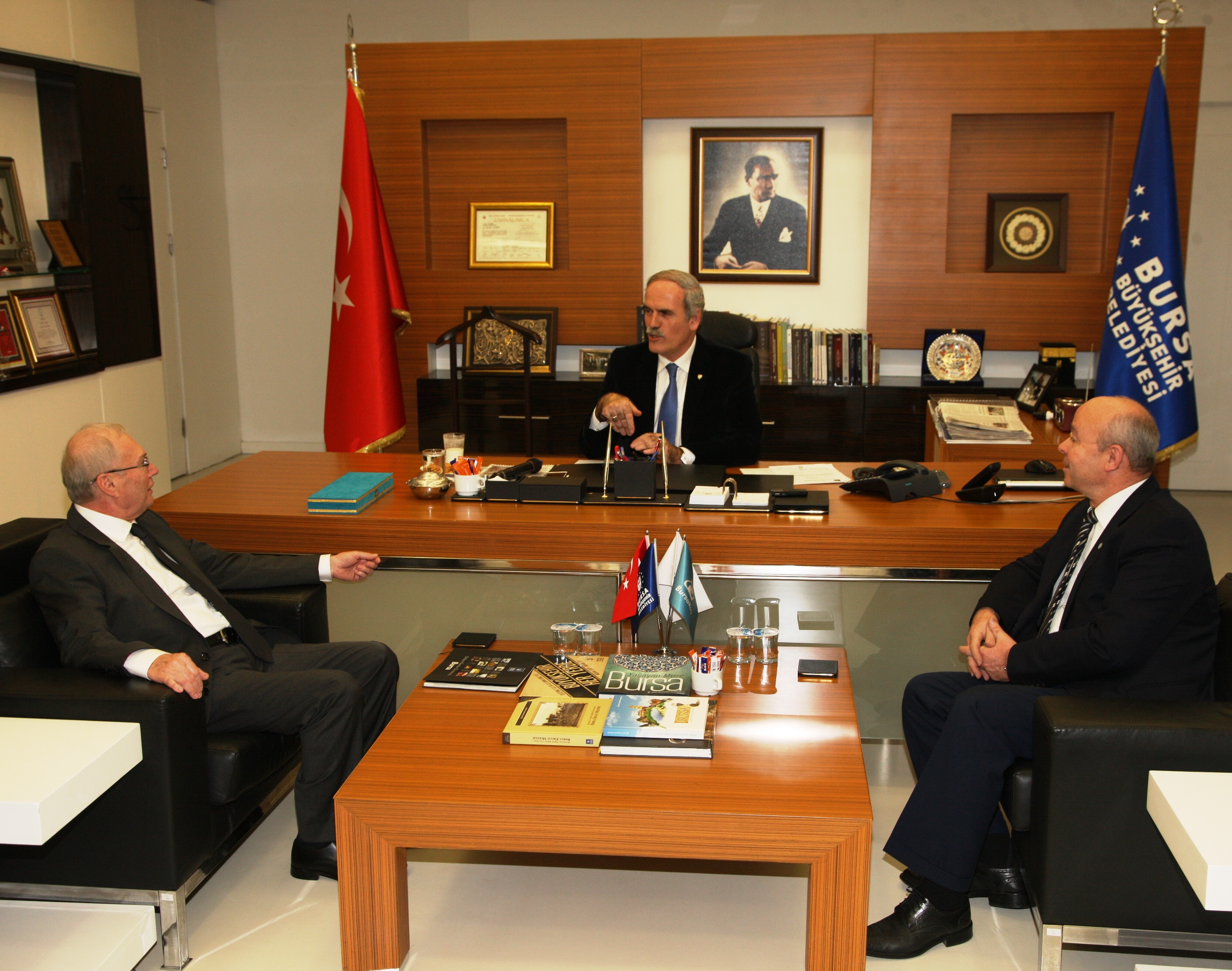 Büyükşehir Belediye Başkanı Recep Altepe, Bursa Organize Sanayi Bölgesi Sanayicileri ve İş Adamları Derneği (BOSİAD) Başkanı İlker Oral ile yeni yönetim kurulu üyeleri ile BURULAŞ’taki Başkanlık makamında bir araya geldi. BOSİAD’ın yeni yönetimine çalışmalarında başarılar dileyen Başkan Altepe, Bursa’da sağlıklı şehir hedefiyle çalışmalarına yön verdiklerini anlattı.