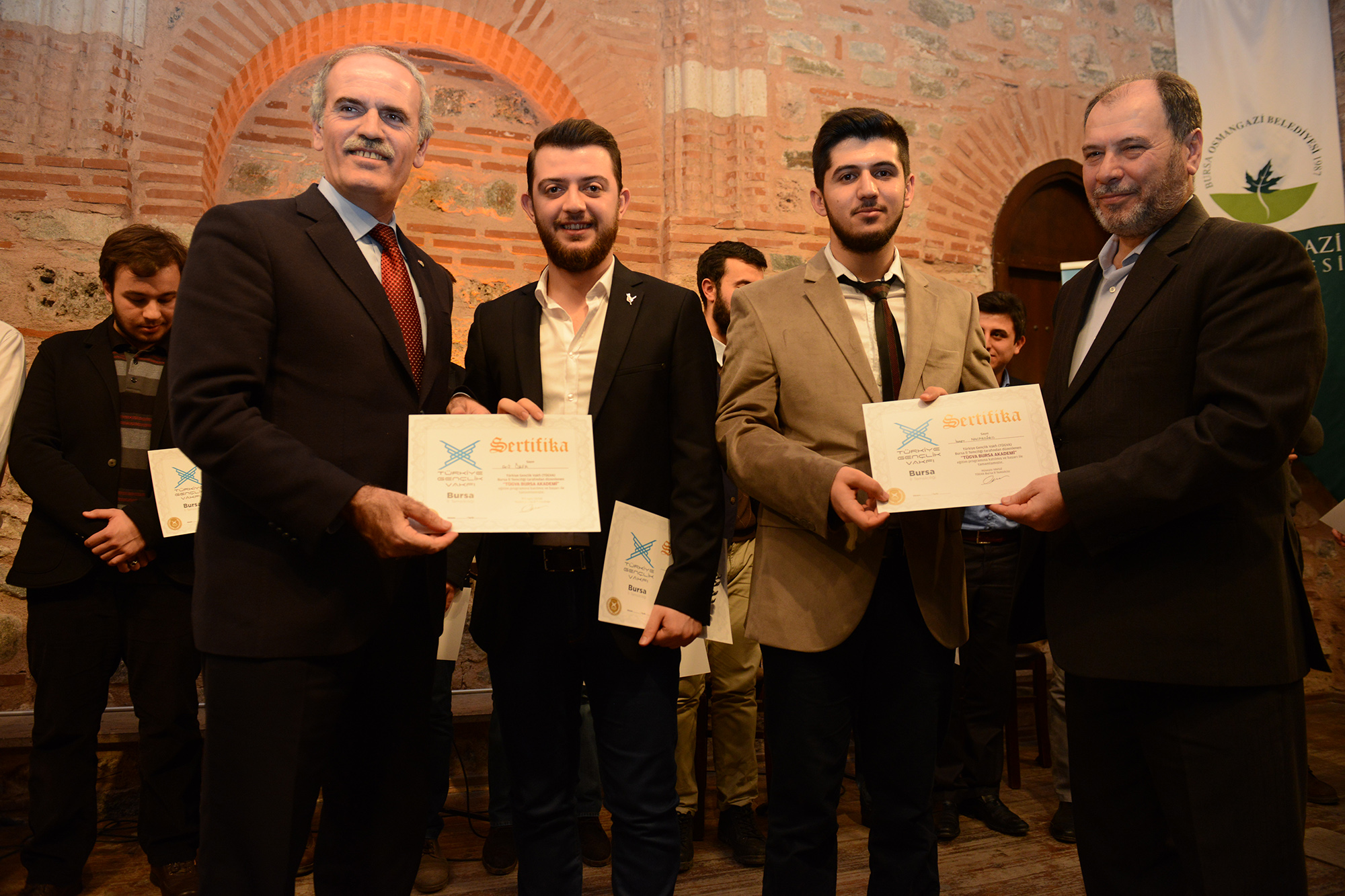 Türkiye Geçlik Vakfı Bursa İl Temsilciliği tarafından Örnekli Kültür Merkezi’nde düzenlenen sertifika töreni, Bursa Valisi Münir Karaloğlu ve Büyükşehir Belediye Başkanı Recep Altepe’nin de katılımıyla gerçekleşti. Törenin açılışında konuşan Türkiye Gençlik Vakfı Bursa İl Temsilcisi Hüseyin Yavuz, Türkiye’nin en genç vakıflarından biri olduklarını ifade ederek, büyük, güçlü ve yeni Türkiye idealine hizmet etmek için bu vakfın çatısı altında toplandıklarını belirtti. Yavuz, “Türkiye Gençlik Vakfı olarak Türkiye idealini taşıyabilecek gençlerin, milli ve manevi değerlerine bağlı insana ve doğaya saygılı, fikri ve kültürel anlamda donanımlı, ilim irfan sahibi bir gençlik olacağına inandık. TÜGVA olarak, genç kardeşlerimizin, medeniyet şuuruna sahip, çağın gereklerini okuyabilen, insanlığa değer katan, demokratik değerleri ve ilkeleri benimseyip özgüveni yüksek ve yenilikçi ama aynı zamanda ahlaklı ve hoşgörülü bireyler olması için gayret gösteriyoruz” dedi.