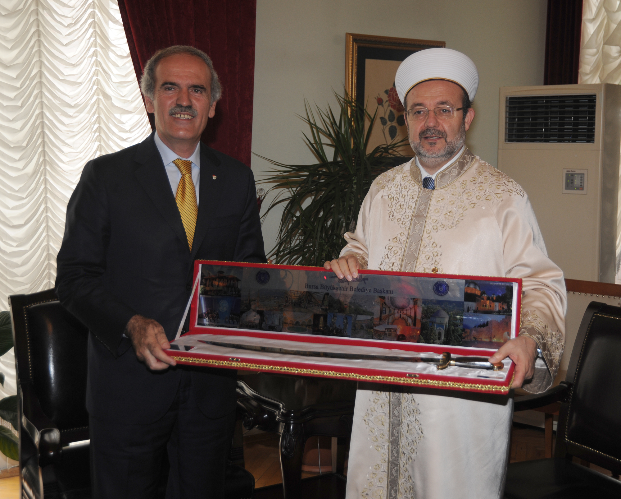 Başkan Altepe, kendisine kitap hediye eden Görmez’e, günün anısına bıçağıyla meşhur Bursa’nın kılıcını hediye etti.