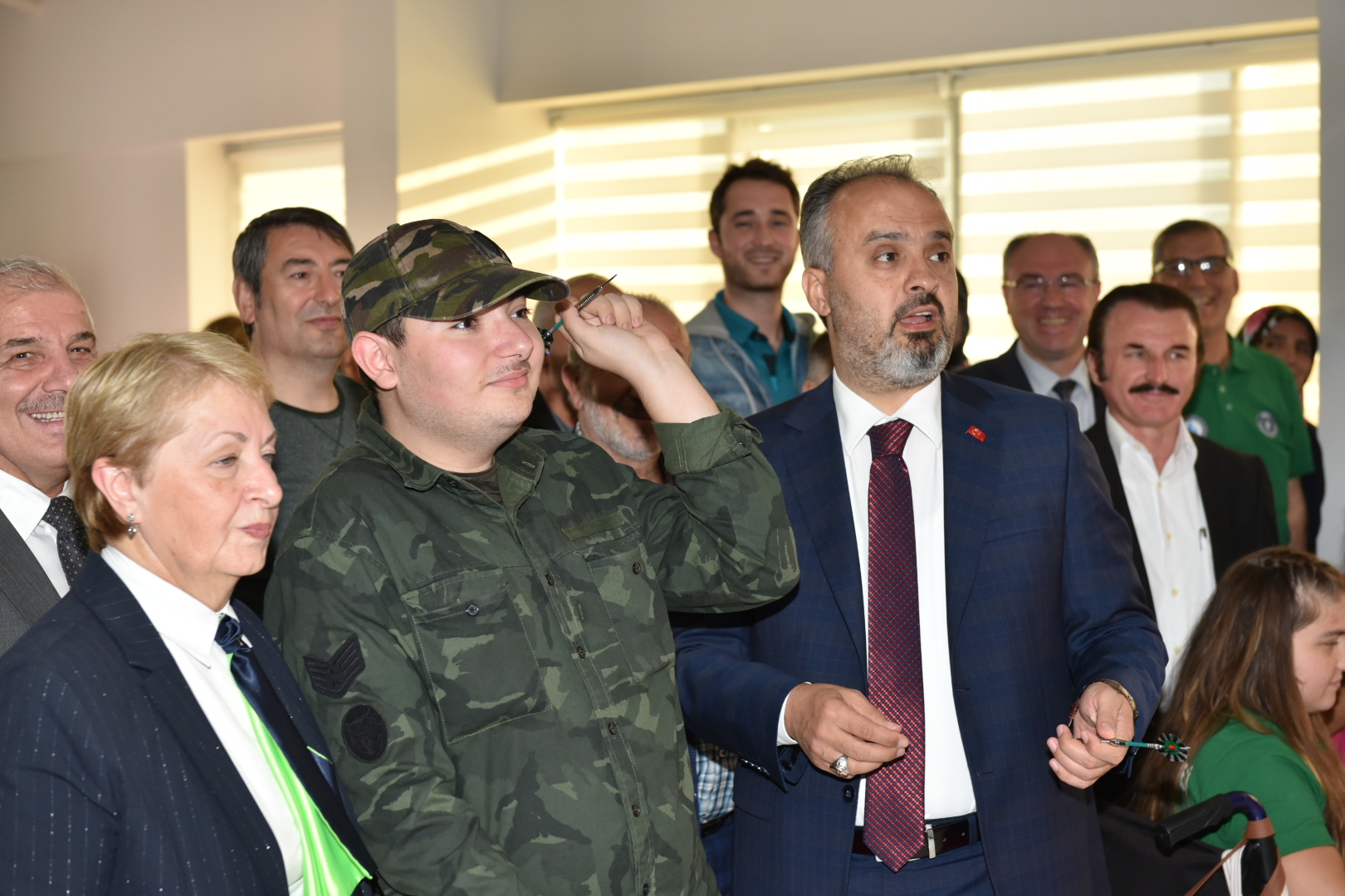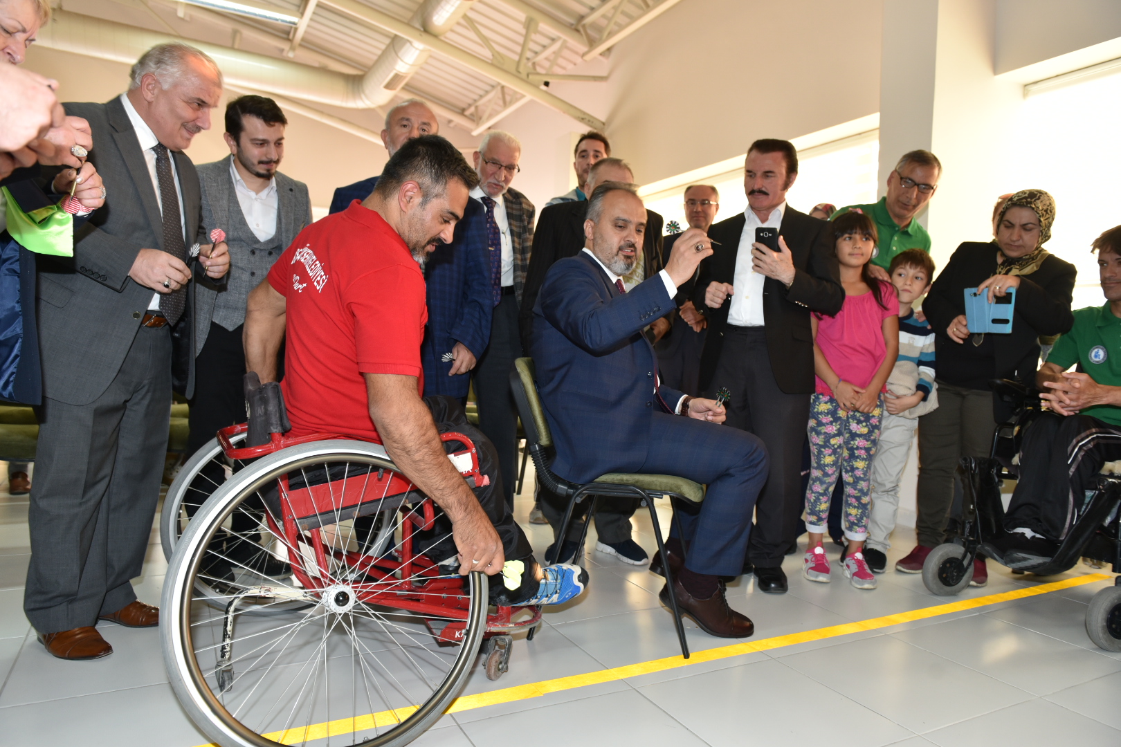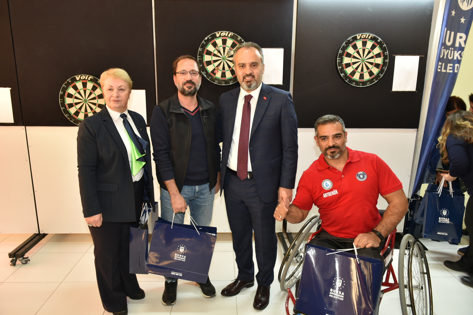 BURSA - Büyükşehir Belediyesi Engelsiz Yaşam Merkezi içinde oluşturan ‘Engelsiz Dart Alanı’nın açılışında şartları eşitlemek için sandalyeye oturup atış yapan Büyükşehir Belediye Başkanı Alinur Aktaş, hedefi tutturmayı başardı.