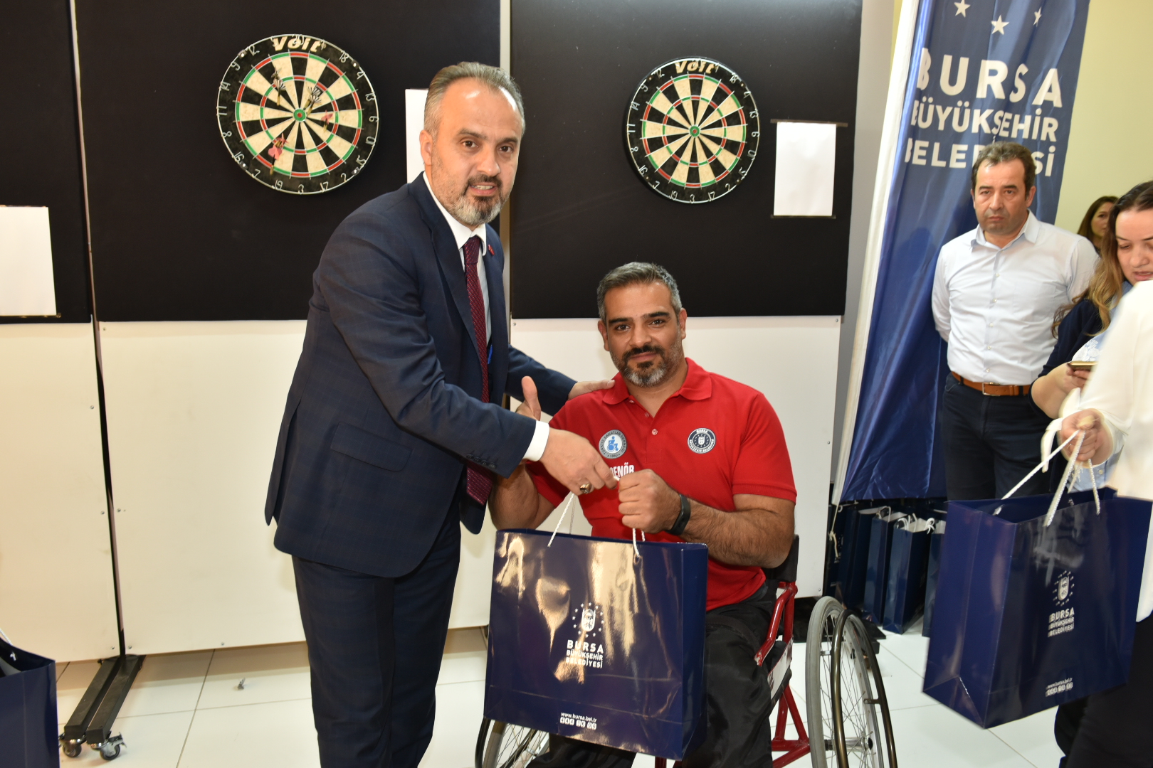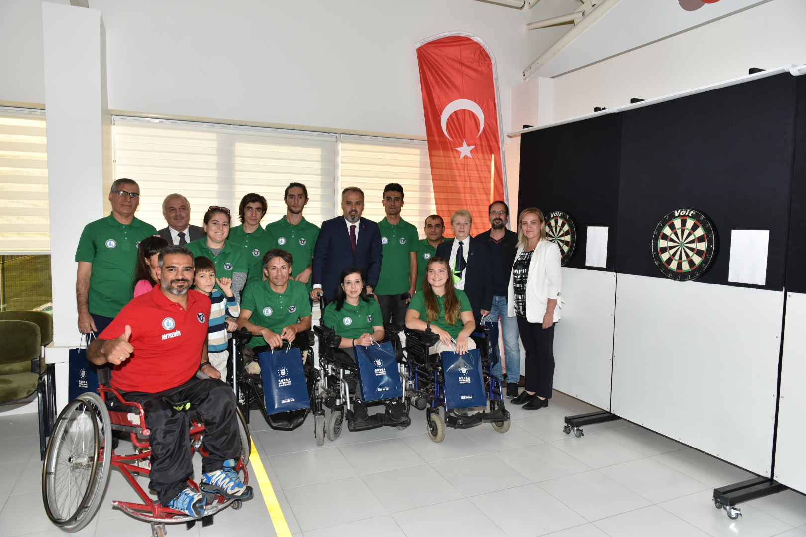 Bursa’ya değer katacak projeleri kararlı adımlarla hayata geçerine Büyükşehir Belediyesi, engelli vatandaşların topluma kazandırılması, sosyal ve sportif faaliyetlerde aktif şekilde yer alması hedefiyle yaptığı çalışmalara bir yenisini daha ekledi. Türkiye’de bir ilk olarak engelli sporcuların antrenmanlarını yapabileceği ve müsabakalarını oynayabileceği ‘Engelsiz Dart Alanı’ Büyükşehir Belediye Başkanı Alinur Aktaş, Türkiye Sakatlar Derneği Bursa Şubesi Başkanı Müzeyyen Yıldırım, Türkiye Bowling, Bocce Dart Federasyonu Bursa Dart İl Temsilcisi Mevlüt Arslan, Milli sporcu Dart Antrenörü Nihat Demir ile engelli vatandaşlar katıldı.