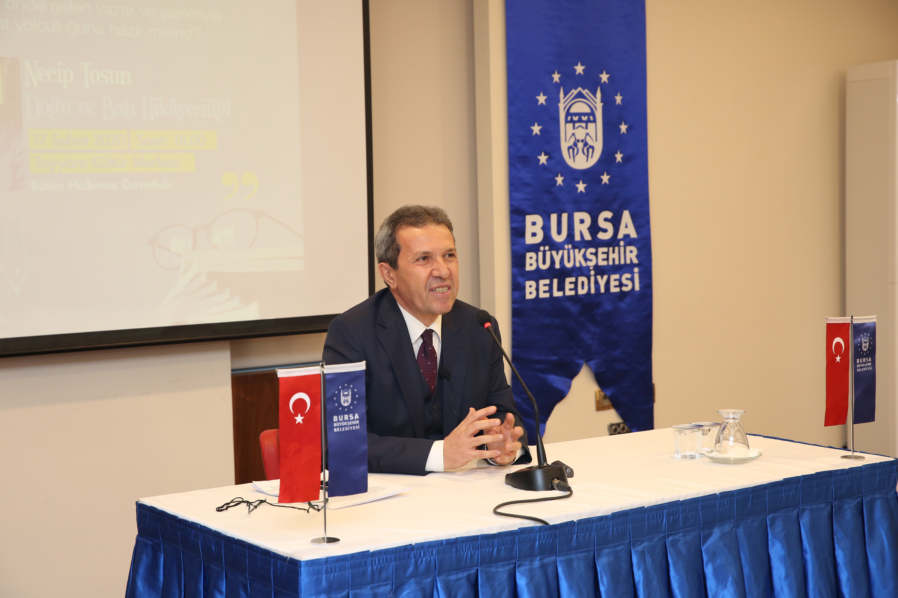 Bursa Büyükşehir Belediyesi Kültür ve Sosyal İşler Dairesi Başkanlığı tarafından ‘Edebi Şehir Bursa’ temasıyla düzenlenen ‘Bursa Edebiyat ve Yazı Akademisi’nin bu haftaki konuğu Yazar Necip Tosun oldu. Tayyare Kültür Merkezi’nde yapılan ve ilginin hayli yoğun olduğu etkinlikte Yazar Necip Tosun, ‘Doğu ve Batı Hikâyeciliğini’ anlattı. Hikâyenin bütün insanlığa bilgiyi, hikmeti anlatan bir yazım türü olduğunu ifade eden Tosun, “Hikâye insanlığın sahici bir dili ve insanlığın birikimini aktardığı temel normlardan biridir. Doğu ülkeleri hikâyeye çok önem verirken, batıya gidildikçe hikâyelerin, resim, müzik ve heykel üzerinden anlatıldığını görürüz. Biz kelimelerle sanatımızı icra etmişiz. Geçmişten günümüze bilgimizi hikâye ile aktardık. Doğu kültüründe hikâye, hikmetin bir inci olarak saklanması demektir. Kutsal kitabımıza baktığımızda önemli bir bölümünün kıssalar olduğunu görürüz. Mesela Yusuf kıssası birçok edebi metine kaynaklık etmiştir. İnsana ulaşmakta hikâyenin gücü çok yüksektir, Kuran kıssaları da bu görevi görüyor. Doğunun temel anlatıları da hikâyelere yaslanır. Binbir Gece Masalları da doğunun dünyaya bakışını anlatır. Binbir Gece Masalları batıda yayınlandığında edebiyat akımları başlamıştır. Batıyı İncil’den sonra en çok etkileyen kitap Binbir Gece Masallarıdır” diye konuştu.