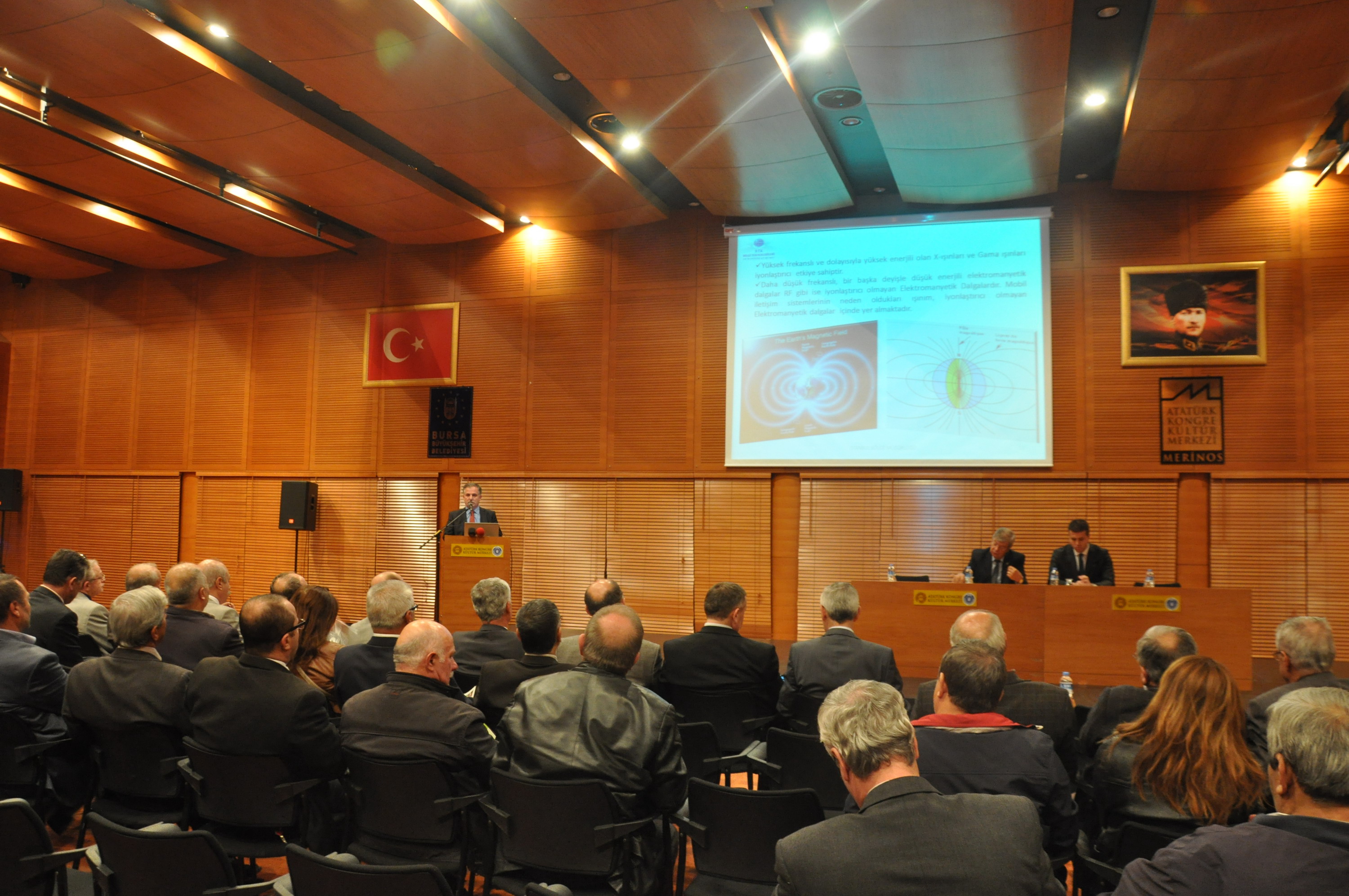 Atatürk Kongre Kültür Merkezi (Merinos AKKM) Hüdavendigar Salonu’ndaki ‘Baz istasyonlarının Bursa ölçüm sonuçları, insan sağlığına etkisi ve bu konudaki bilimsel çalışmalar’ konulu toplantıya, Büyükşehir Belediyesi yöneticileri, muhtarlar, kamu kurumlarının ve sivil toplum kuruluşlarının temsilcileri katıldı.