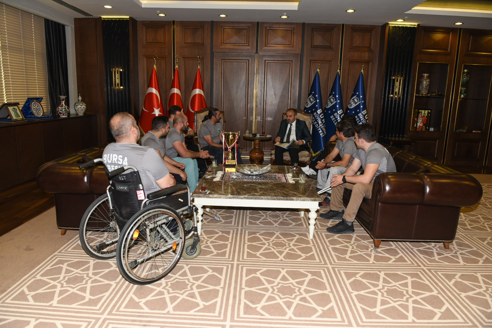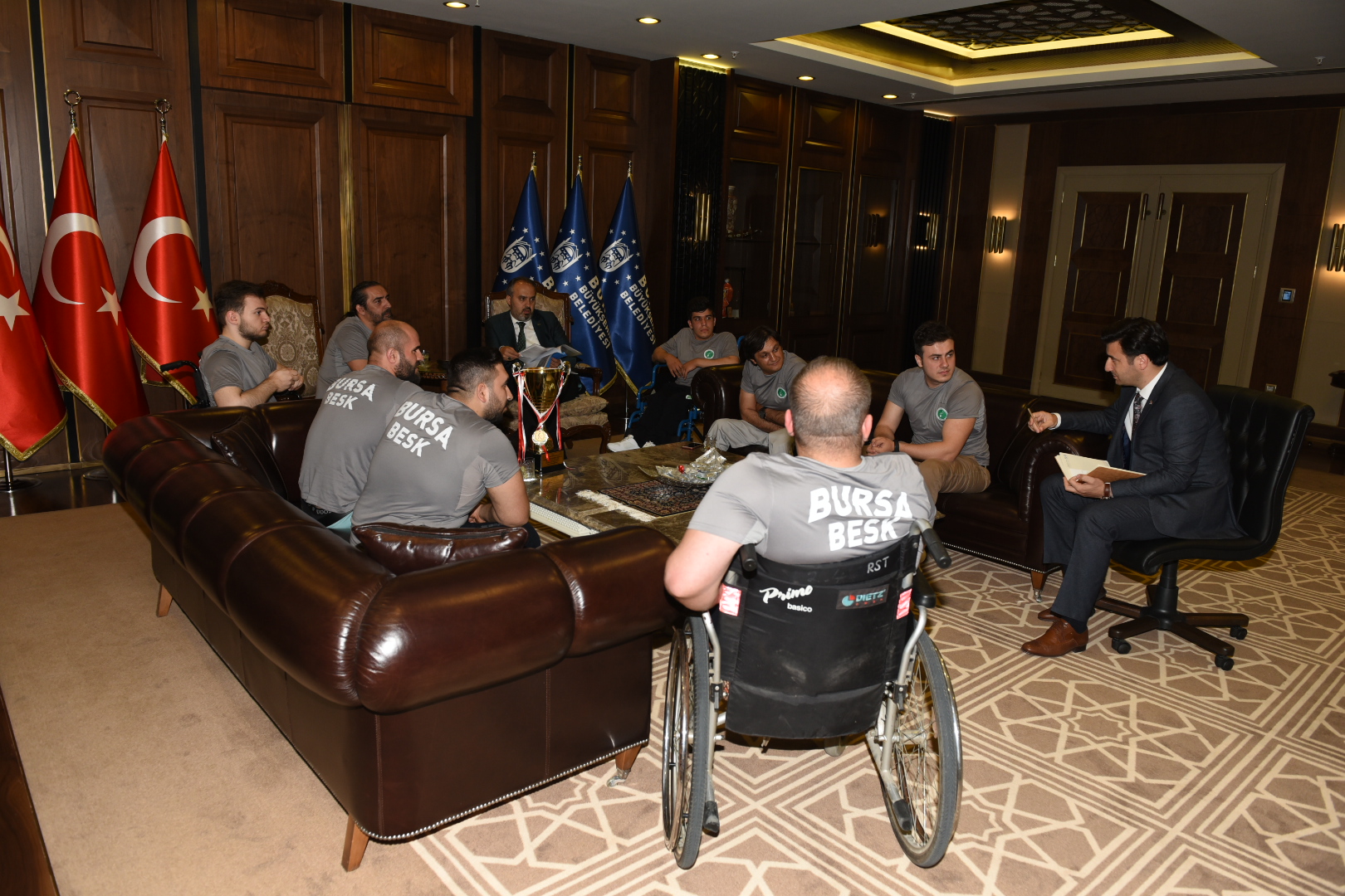 BURSA - Büyükşehir Belediye Başkanı Alinur Aktaş, 1 yıldır faaliyet göstermesine rağmen TS Basketbol Bölgesel Lig’de şampiyon olan ve ardından gerçekleştirdiği maçlarda başarı göstererek aynı klasmanda 2. lige çıkan Bursa Engelliler Spor Kulübü (BESK) oyuncularını ağırladı. Elde ettikleri başarı ve Bursa’nın adını bir spor dalında daha duyurdukları için takım oyuncularını tebrik eden Başkan Aktaş, “8-10 samimi adamın bir araya gelerek ulusal müsabakalarda mücadele etmesi, alkışlanacak bir şey. Başarılarının devamını diliyorum” dedi. Başkan Aktaş, şampiyonluk kupasıyla birlikte kendisini ziyaret eden BESK oyuncularına 5 bin TL şampiyonluk primi ile çeşitli hediyeler takdim etti.