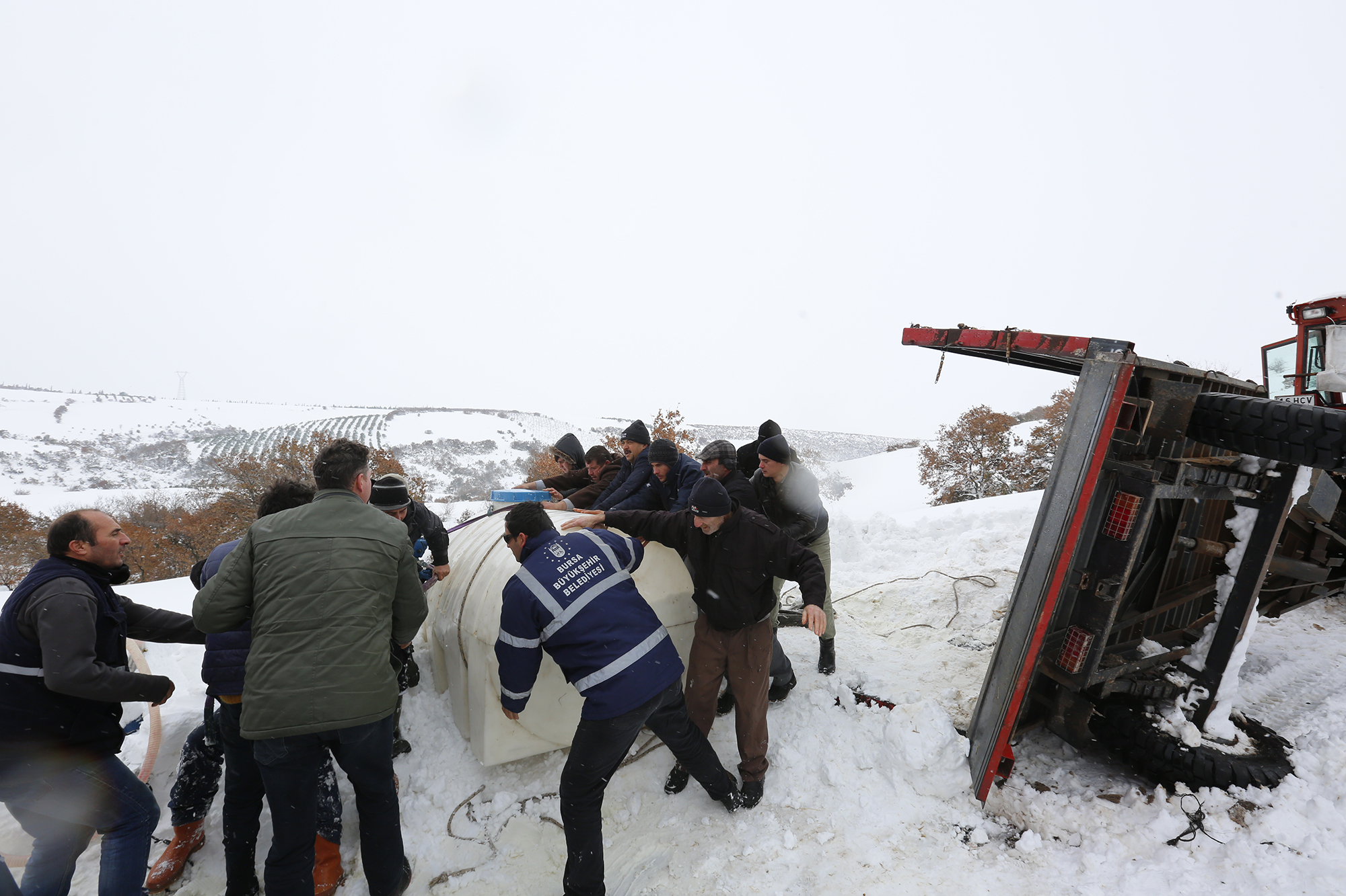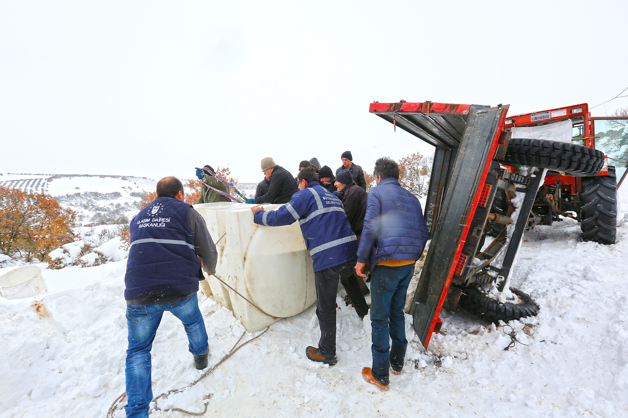 Karda kayıp, devrilen traktör römorkunun kaldırılmasına da destek veren Büyükşehir ekipleri, toplamda 6 bin kilometreyi bulan mahalle ve arazi yollarını ulaşılabilir hale getiriyor.