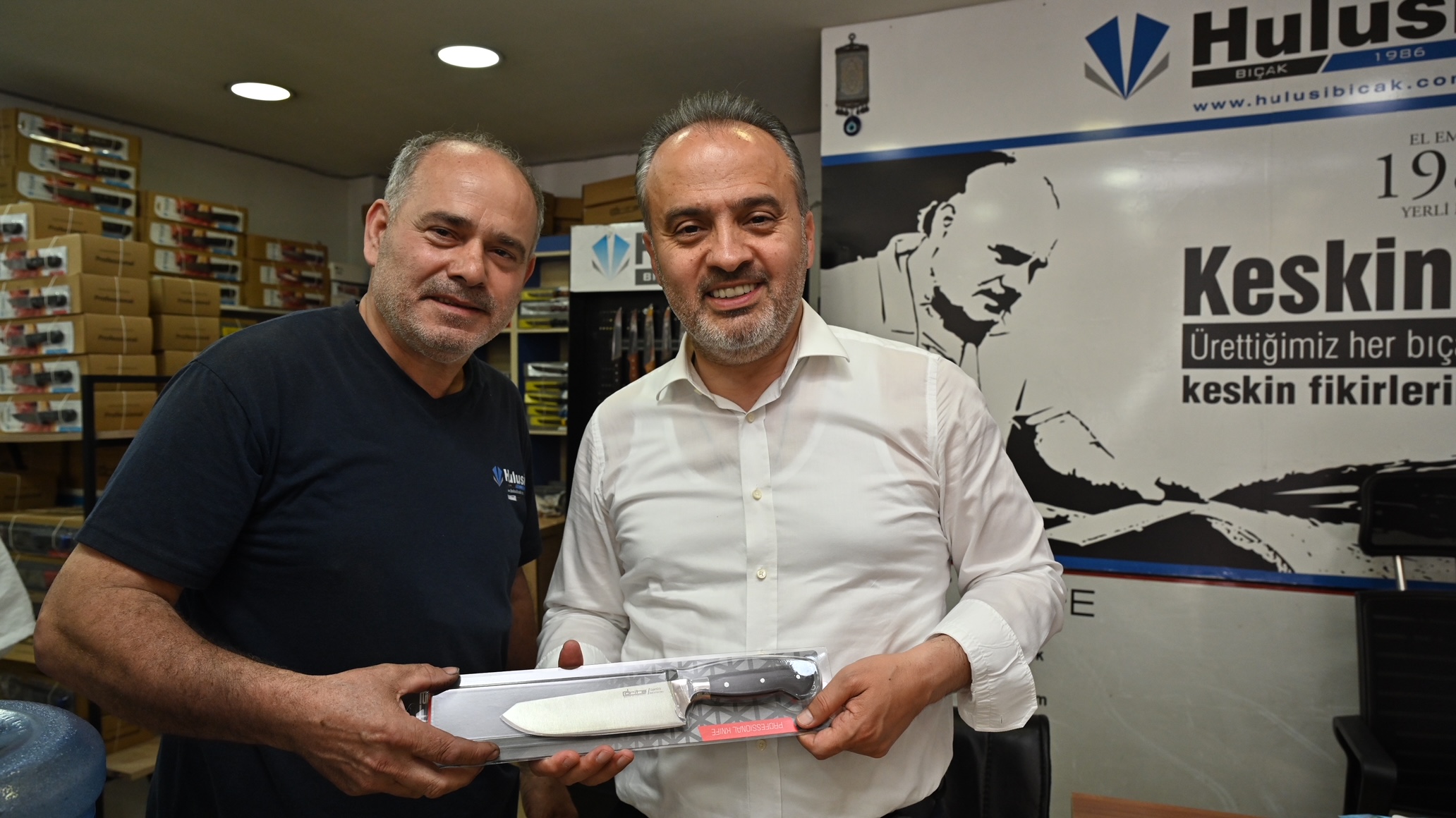 Bursa’nın pek çok özelliği bünyesinde bulundurduğunu, bıçağın da Bursa’nın önemli markalarından biri olduğunu belirten Başkan Aktaş, “Bursa bıçağının hak ettiği değere ulaşabilmesi adına, artık bir endüstriyel ürün olarak bütün dünya pazarlarında var olması adına büyük bir gayret ortaya koyuyoruz. Öncelikle Bıçakçılar Derneğimiz ve konunun tüm taraflarıyla bir araya gelerek geçen sene İspanya'dan başlayan süreci, bu sene Fransa'daki fuarla gerçekten zirveye çıkardık. Yine düzenlediğimiz festivalle beraber de sektörü daha üst düzey noktaya taşıdık. Bugün de bayram öncesi esnaflarımızı geziyoruz, selam veriyoruz. Bu manadaki düşünce ve önerilerini alıyoruz. Ben inanıyorum ki birkaç yıl içerisinde rakamlar çok daha ciddi hale gelecek. Esnafımızın belki bir miktar uzaklaştığı bu sektörün çok daha iyi noktalara taşınacağına yürekten inanıyorum. Herkese hayırlı bayramlar diliyorum” diye konuştu.