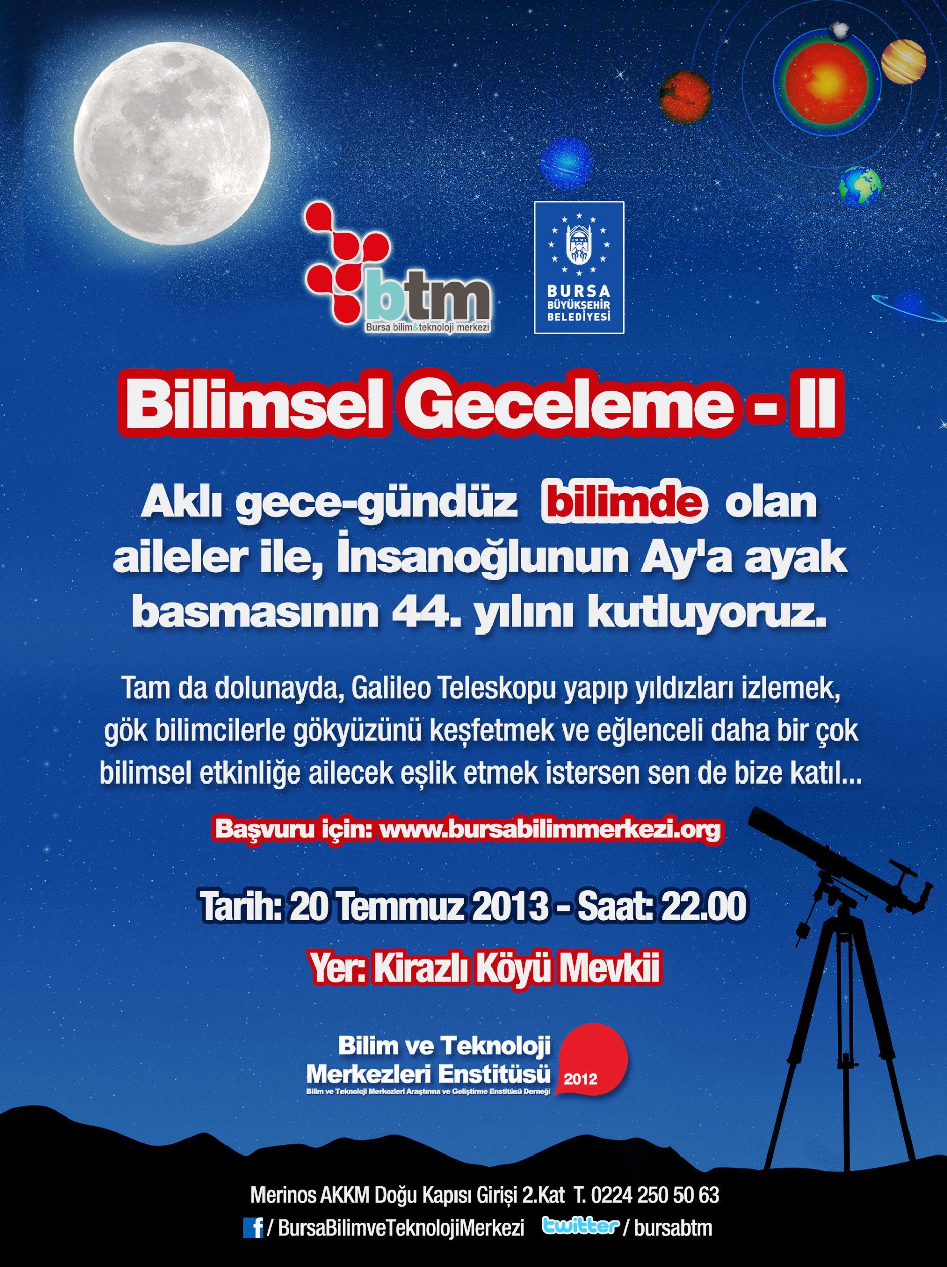 - Bursalıları bilim ve teknoloji alanındaki gelişmelerle buluşturan Bilim ve Teknoloji Merkezi (BTM), ‘Bilimsel Geceleme’ etkinliğiyle meraklılarını Kirazlı Köyü’nde bir araya getiriyor.