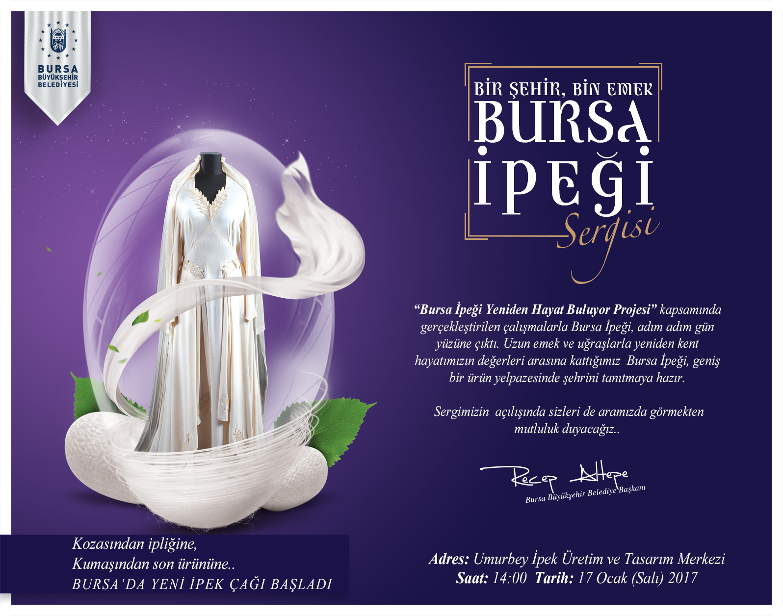 - ‘Bursa İpeği Yeniden Hayat Bulacak’ sloganı ile başlatılan çalışmalar kapsamında hazırlanan ürünlerin yer aldığı ‘Bir şehir, Bin emek; Bursa İpeği’ adlı sergi, 17 Ocak Salı günü saat 14.00’da Umurbey İpek Üretim ve Tasarım Merkezi’nde izlenime sunulacaktır.