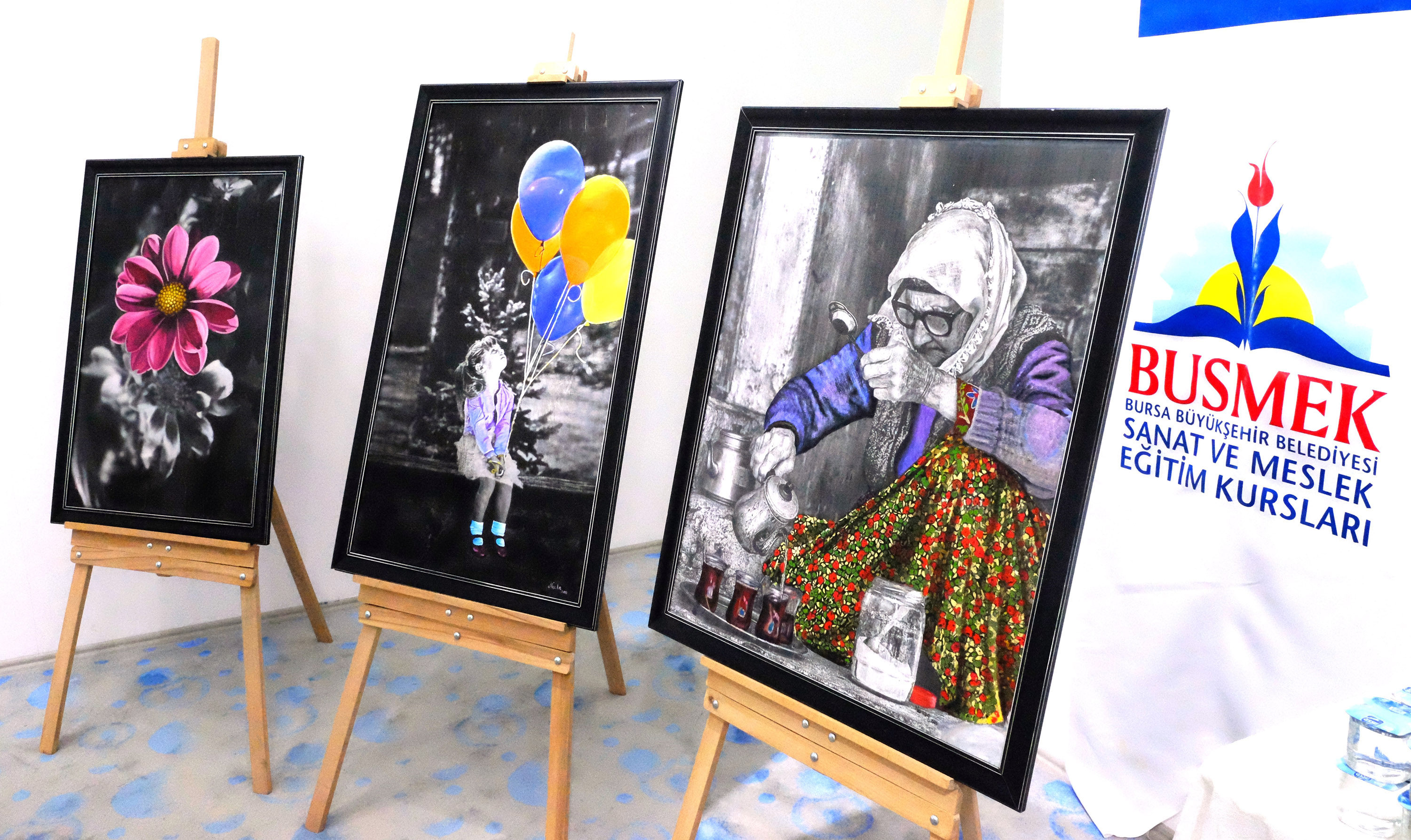 BUSMEK kursiyerlerinin el emeğini gözler önüne seren ‘Bir Tutam Renk’ adlı resim sergisi izlenime sunuldu.