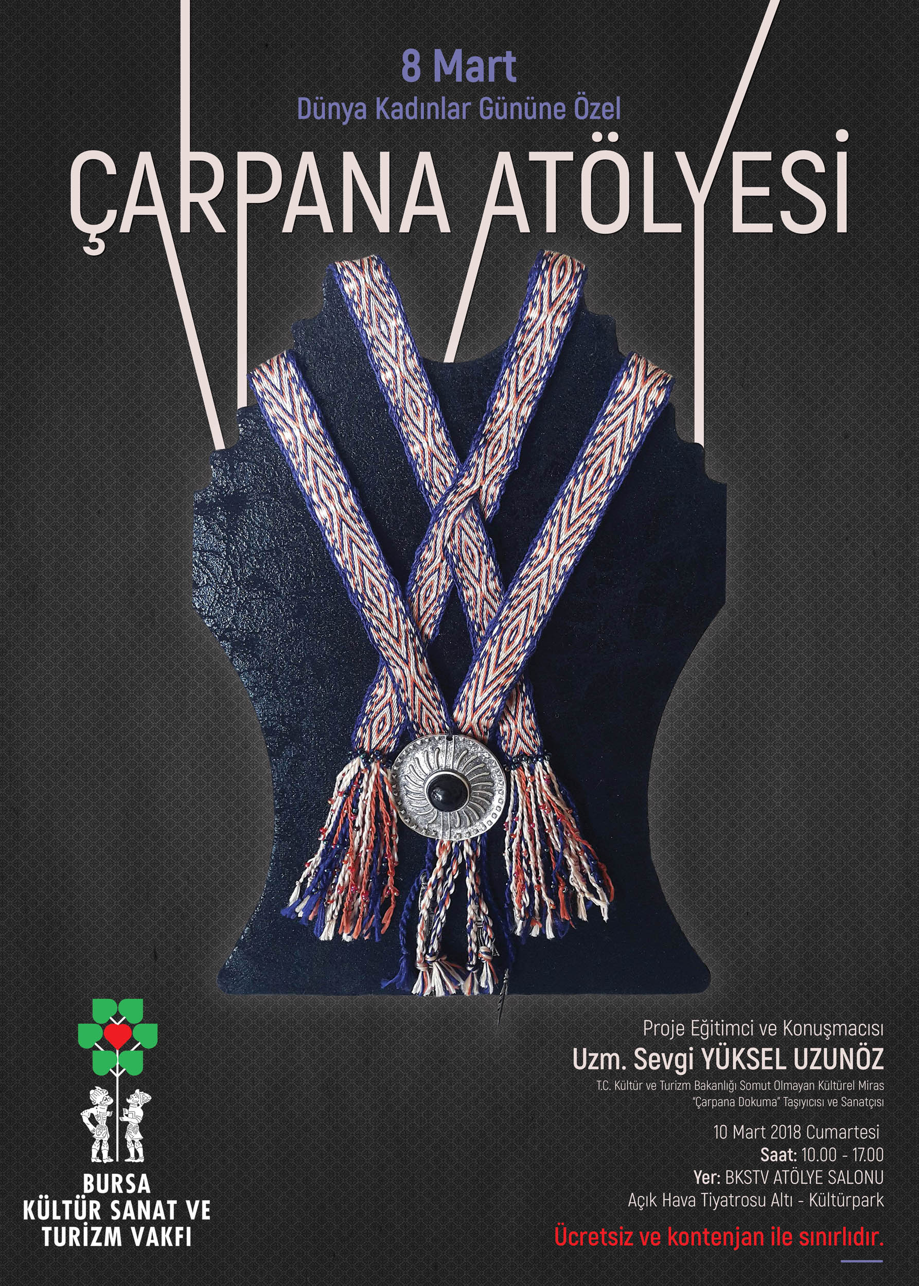 BURSA – Bursa Kültür Sanat ve Turizm Vakfı (BKSTV), ‘8 Mart Dünya Kadınlar Günü’ nedeniyle ‘Çarpana Dokuma’ atölyesi gerçekleştiriyor.