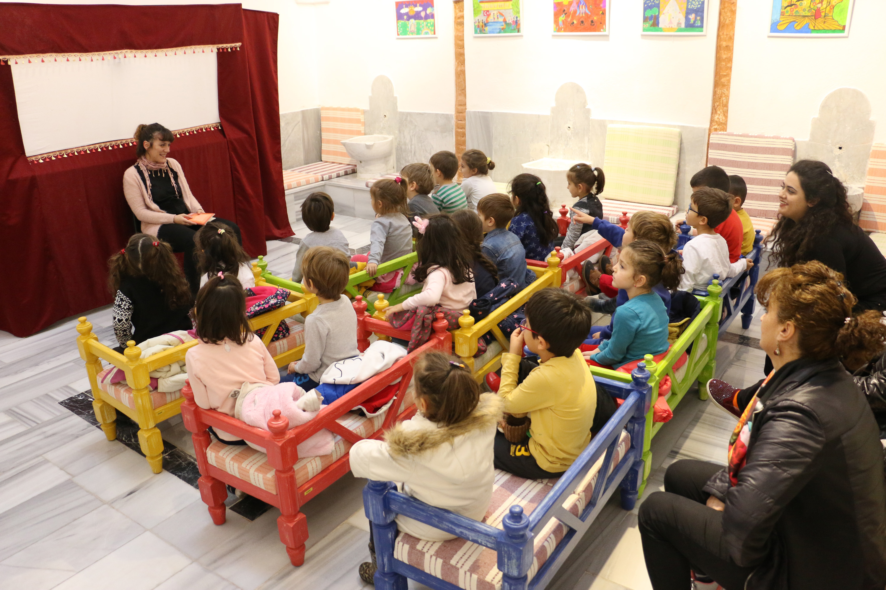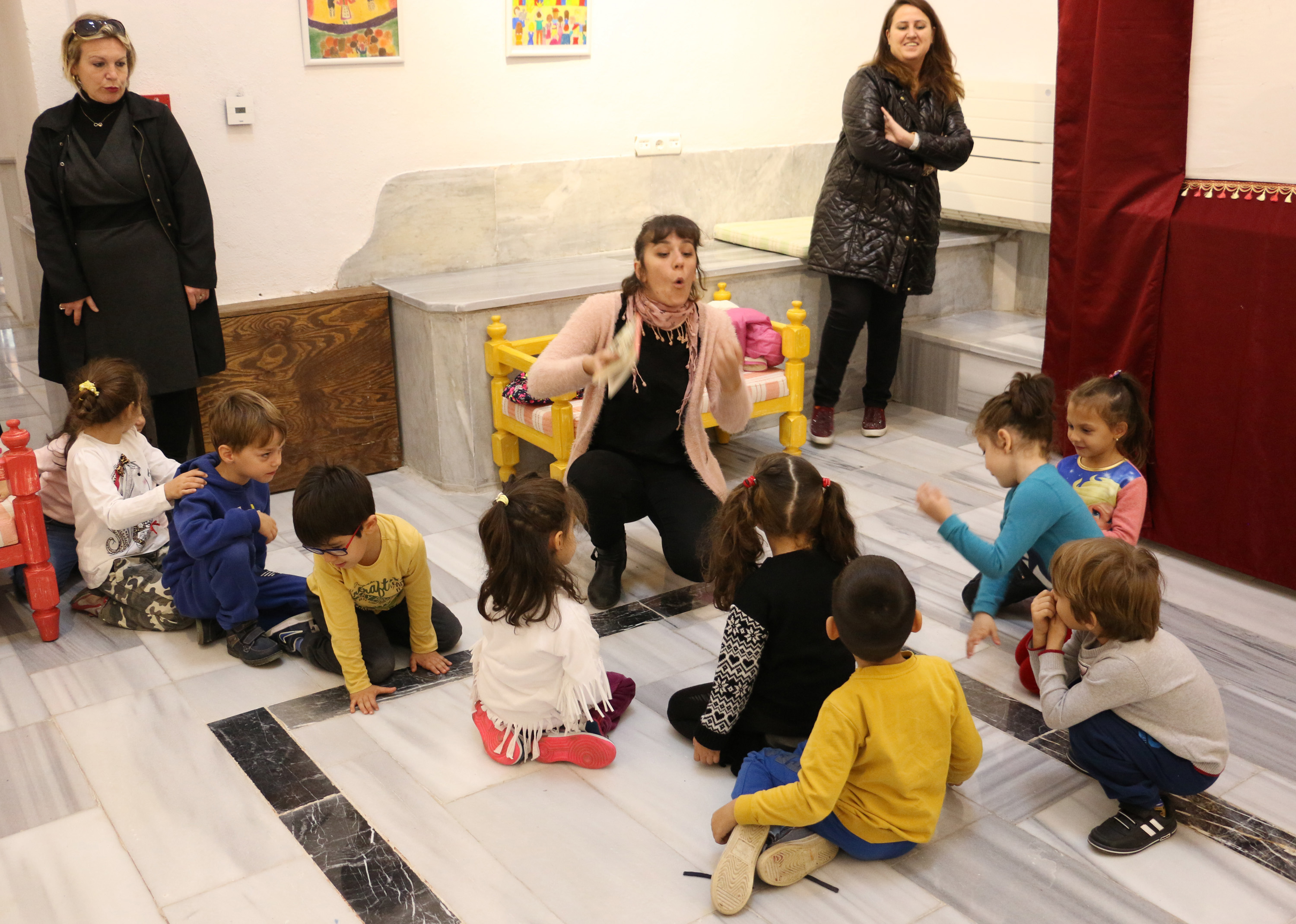 Bursa Büyükşehir Belediyesi Şehir Tiyatrosu, anaokulu öğrencilerine yönelik masal okuma etkinliği gerçekleştiriyor. Mudanya Tahir Ağa Kültür Merkezi’nde küçük öğrencilerle bir araya gelen Şehir Tiyatrosu Sanatçısı İpek Zeylan, çocuklara ‘Bremen Mızıkacıları’ masalını anlatıyor. Zeylan ile birlikte masalı da canlandıran çocuklar, etkinlikte masalın resimlerini de yapıyor.