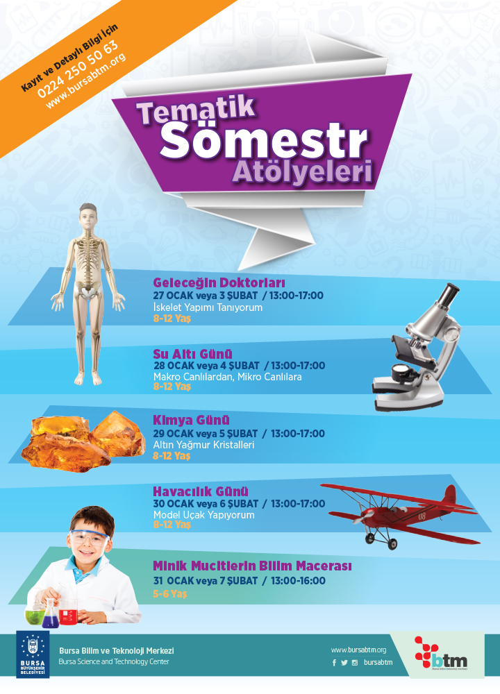 - BURSA BÜYÜKŞEHİR BELEDİYESİ´NİN GEÇTİĞİMİZ YIL HAYATA GEÇİRDİĞİ BİLİM VE TEKNOLOJİ MERKEZİ PROJESİ YIL BOYUNCA BİLİMSEL BİRÇOK ETKİNLİĞE EV SAHİPLİĞİ YAPTI. BİLİM İLE DOLU BİR SÖMESTR İSTEYENLER İÇİN BTM´DE TEMATİK BİLİM ATÖLYELERİ GERÇEKLEŞECEK.