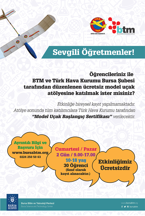 - ÇOCUKLARIN İLGİ ALANLARINA YÖNELİK İÇERİKLER HAZIRLAYIP SUNAN BTM, AKLI HAVACILIKTA VE UÇAKLARDA OLAN ÇOCUKLAR İÇİN TÜRK HAVA KURUMU BURSA ŞUBESİ İLE İŞBİRLİĞİ SAĞLADI. MODEL UÇAK ATÖLYESİ ARTIK HER HAFTA SONU BTM’DE THK TARAFINDAN ÜCRETSİZ OLARAK DÜZENLENECEK.