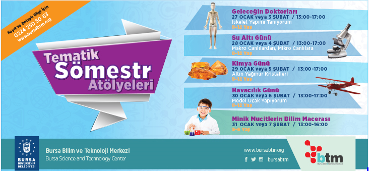 BTM sömestr tematik atölyelerine katılan çocuklar önümüzdeki günlerde mikroskopla inceleme yaparak yeni canlı türlerini keşfedecekleri, kimyada altın kristalleri oluşturacak, kendi model uçaklarını yapıp uçuş tarihi hakkında bilgi alabilecekleri birçok farklı alanda etkinliklere katılabilecekler. Öğlen saat 13.00´te başlayacak etkinlikler, saat 17.00’de sona erecek.