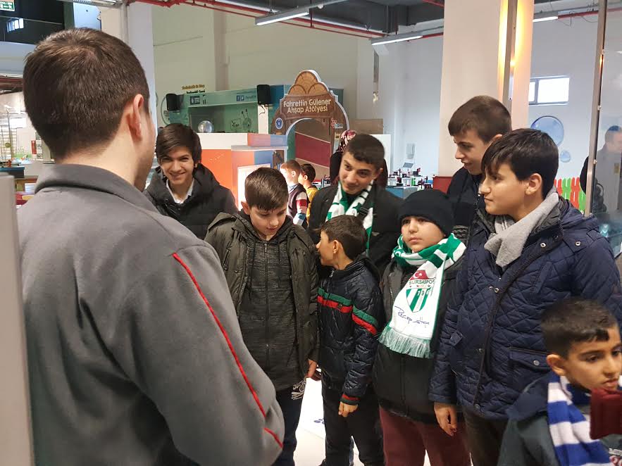 Mardin Nusaybin Çocuk Gelişimi Merkezi öğrencileri, dünyanın sayılı bilim şenliklerinden birini gerçekleştiren, Türkiye’nin en kapsamlı bilim merkezi özelliğine sahip olan ‘Bursa Bilim ve Teknoloji Merkezi’ içinde bulunan deney düzeneklerini inceledi. Altın Çağ’da Bilim ve Devr-i Dinozor sergilerini de gezen öğrenciler, bilim avcıları ekibinin bilim şovunu da ilgiyle izledi. Çoğu Bursaspor sevdalısı olan minikler ziyaretlerinin sonunda boyunlarındaki Bursaspor atkısı ile günün anısına hatıra fotoğraf çektirdi. Bursa Bilim ve Teknoloji Merkezi geçtiğimiz yaz aylarında da Mardin’e gönül köprüsü kurmuş, sosyal sorumluluk bilinciyle Midyat ilçesindeki Çavuşoğlu Çok Programlı Anadolu Lisesi’nde öğrenim gören öğrencilerin gerçekleştirdiği bilimsel etkinliğe atölye malzemesi göndererek destek olmuştu.