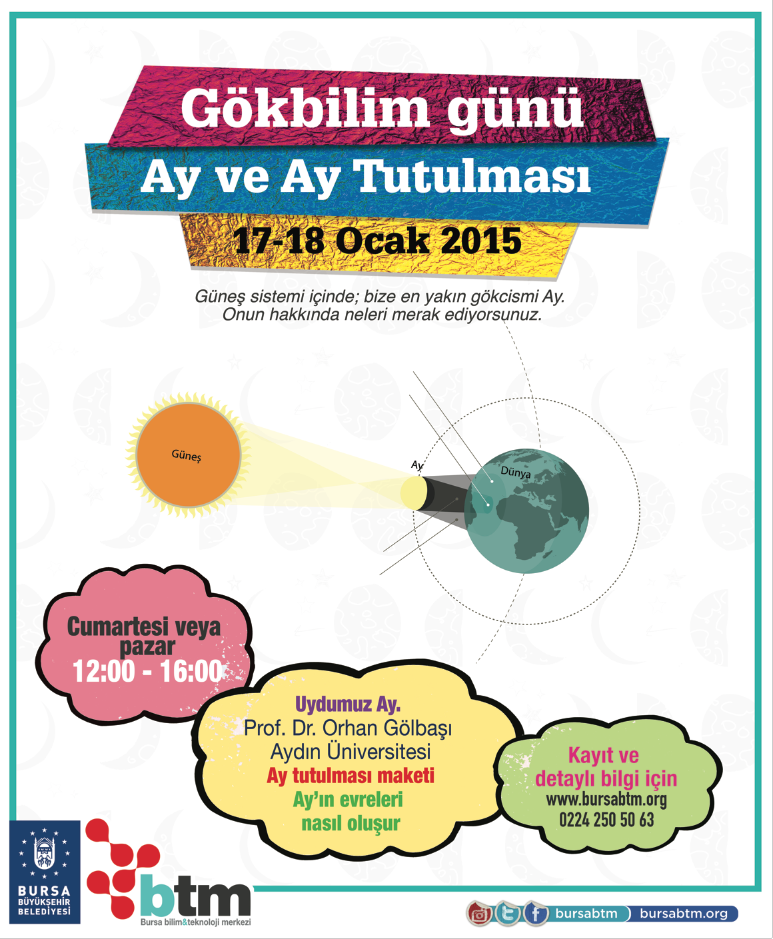 Bilimin en eğlenceli ve uygulanabilir halini çocuklarla buluşturan BTM, her hafta sonu farklı bir alanda tematik atölye çalışmasına imza atarak geleceğin mucitlerinin yetişmesine katkı sağladı. Kasım ayında başlayan ve yoğun katılımla gerçekleştirilen tematik hafta sonu etkinlikleri, 17-18 Ocak tarihlerinde son kez yapılacak. Programa, Kültür Üniversitesi profesörlerinden Orhan Gölbaşı katılacak. Gölbaşı, ‘Ay’ hakkında bilgiler verecek ve dünyadan gözlemlenen ay tutulmalarının doğasını anlatacak. Katılımcıların ay tutulması maketlerini de yaparak ayın evreleri hakkında bilgi sahibi olacağı program, yine bir hafta sonunda Bursalılara renkli anlar yaşatacak. Gelecek aylarda yeni konularla yeniden başlayacak olan tematik etkinlikler hakkında detaylı bilgi almak isteyen vatandaşlar, http://bursabilimmerkezi.org/ adlı internet sitesi ile BTM’nin sosyal medya kaynaklarını takip edebilirler.