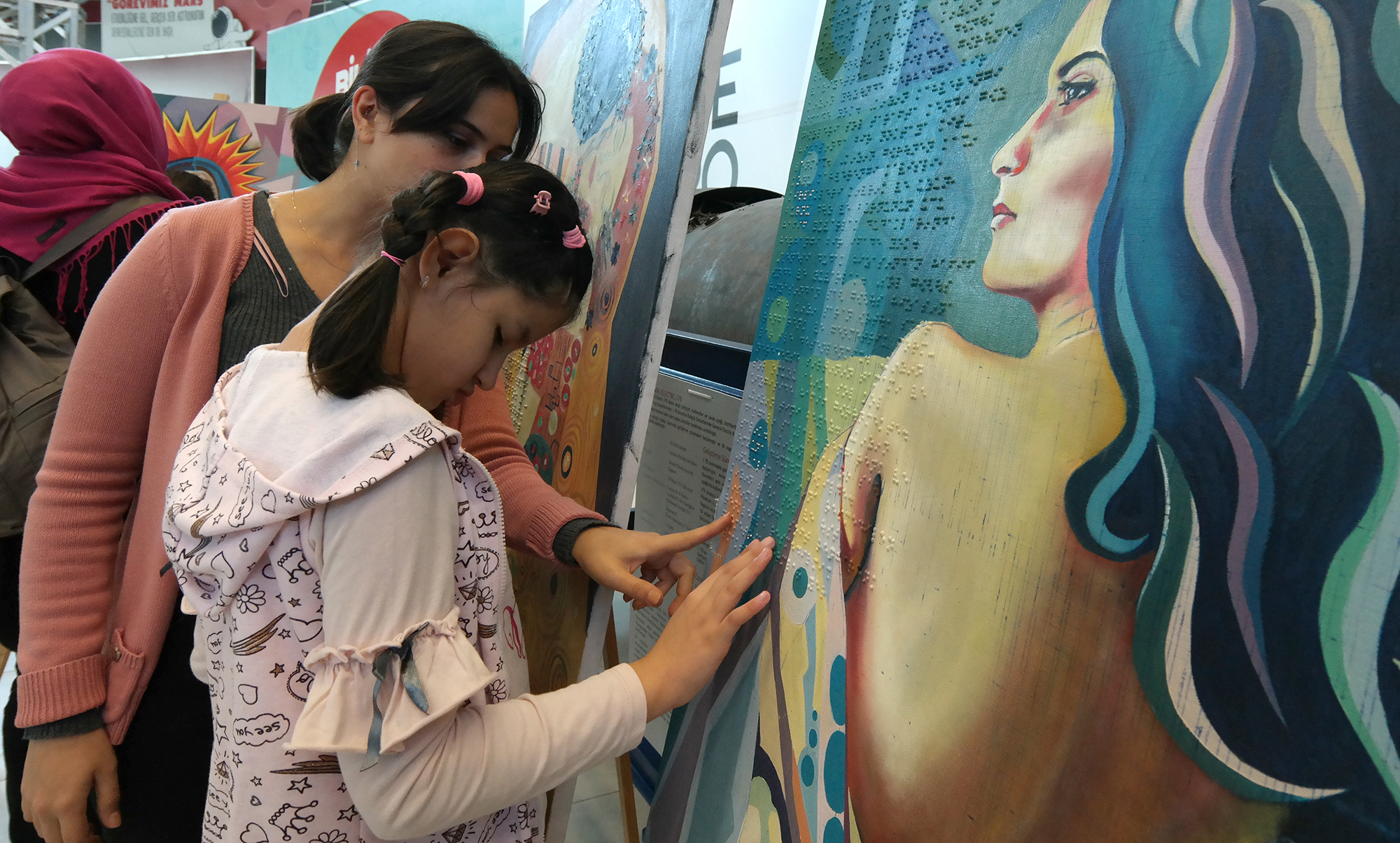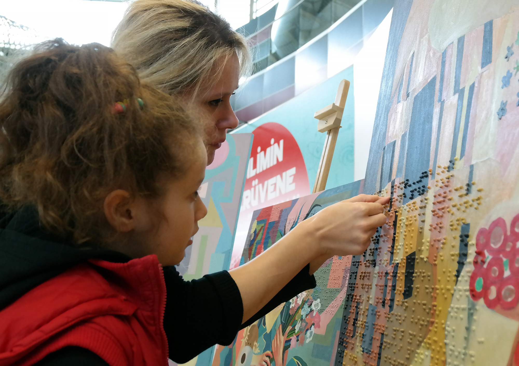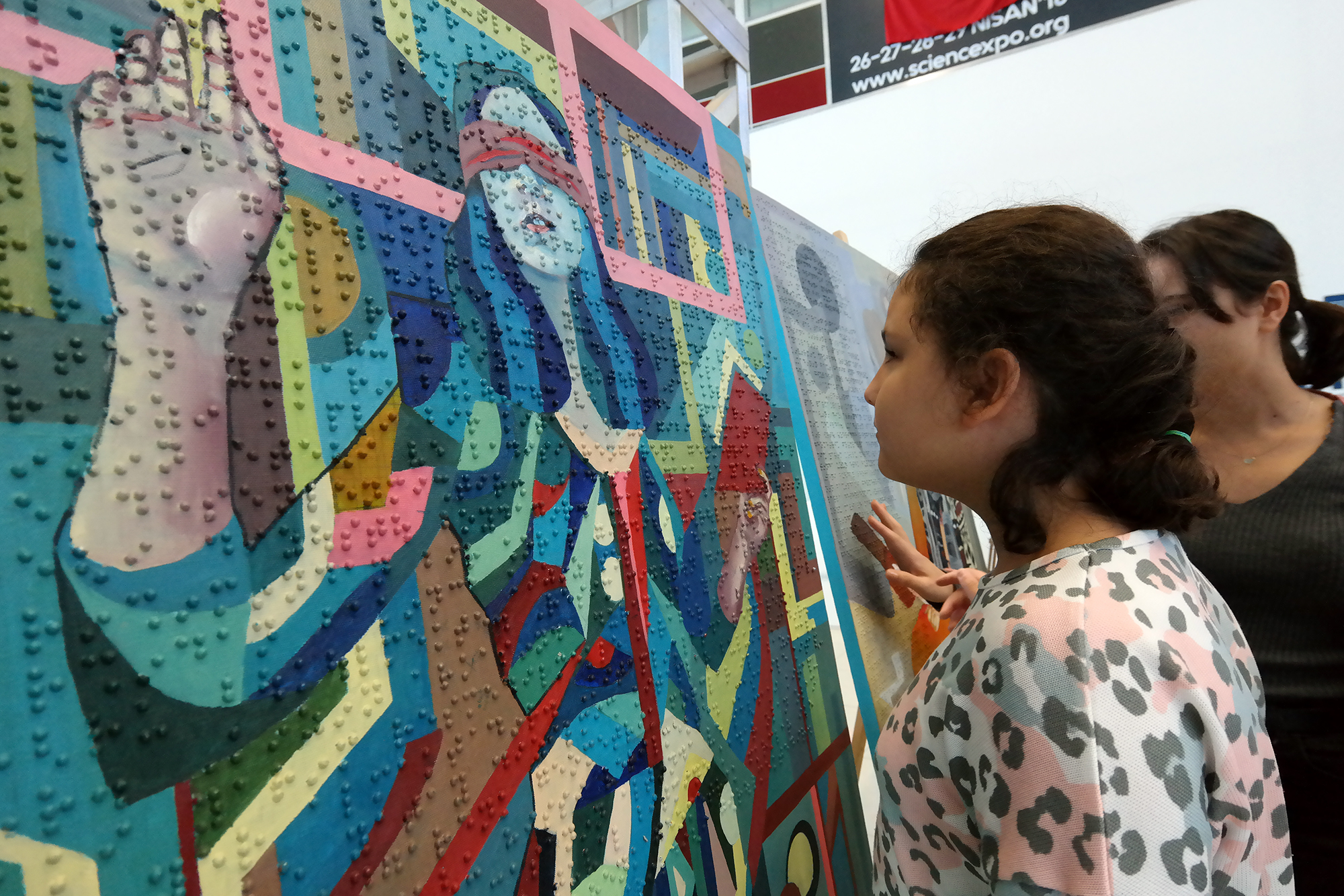 Birbirinden farklı atölye çalışmalarıyla bilimi 7’den 70’e toplumun bütün kesimlerine sevdiren Bursa Büyükşehir Belediyesi Bilim ve Teknoloji Merkezi, bu kez kapılarını sanatta engelleri kaldıran ‘Erişilebilir Sergiye’ açtı. Resim Öğretmeni Renziye İsmihan tarafından yapılan ve Trakya Üniversitesi Özel Eğitim Öğretmenliği son sınıf öğrencisi Büşra Altun tarafından betimlenen resimler görme engelli vatandaşların resim sanatına eşimi önündeki engelleri tamamen ortadan kaldırdı. Mitat Enç Özel Eğitim Ortaokulu’ndan gelen çocuklar, sergideki resimlere dokunarak, tuvale işli Braille alfabesi sayesinde görmedikleri resimleri anlamaya çalıştı. Velilerinin de yardımıyla sergideki tüm resimleri tek tek inceleyen çocuklar, bir anlamda okudukları resimleri anlama imkanı buldu.