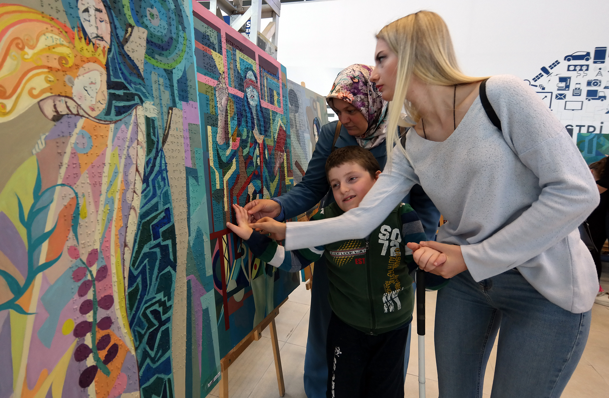 BURSA - Bursa Büyükşehir Belediyesi Bilim ve Teknoloji Merkezi’nin ev sahipliğindeki sergide, tuval üzerine işlenen kabartma harflerle betimlenen resimler, görme engellileri de sanatla buluşturdu. Serginin ziyaretçileri, Braille alfabesiyle betimlenen resimleri dokunarak anlamaya çalıştı.