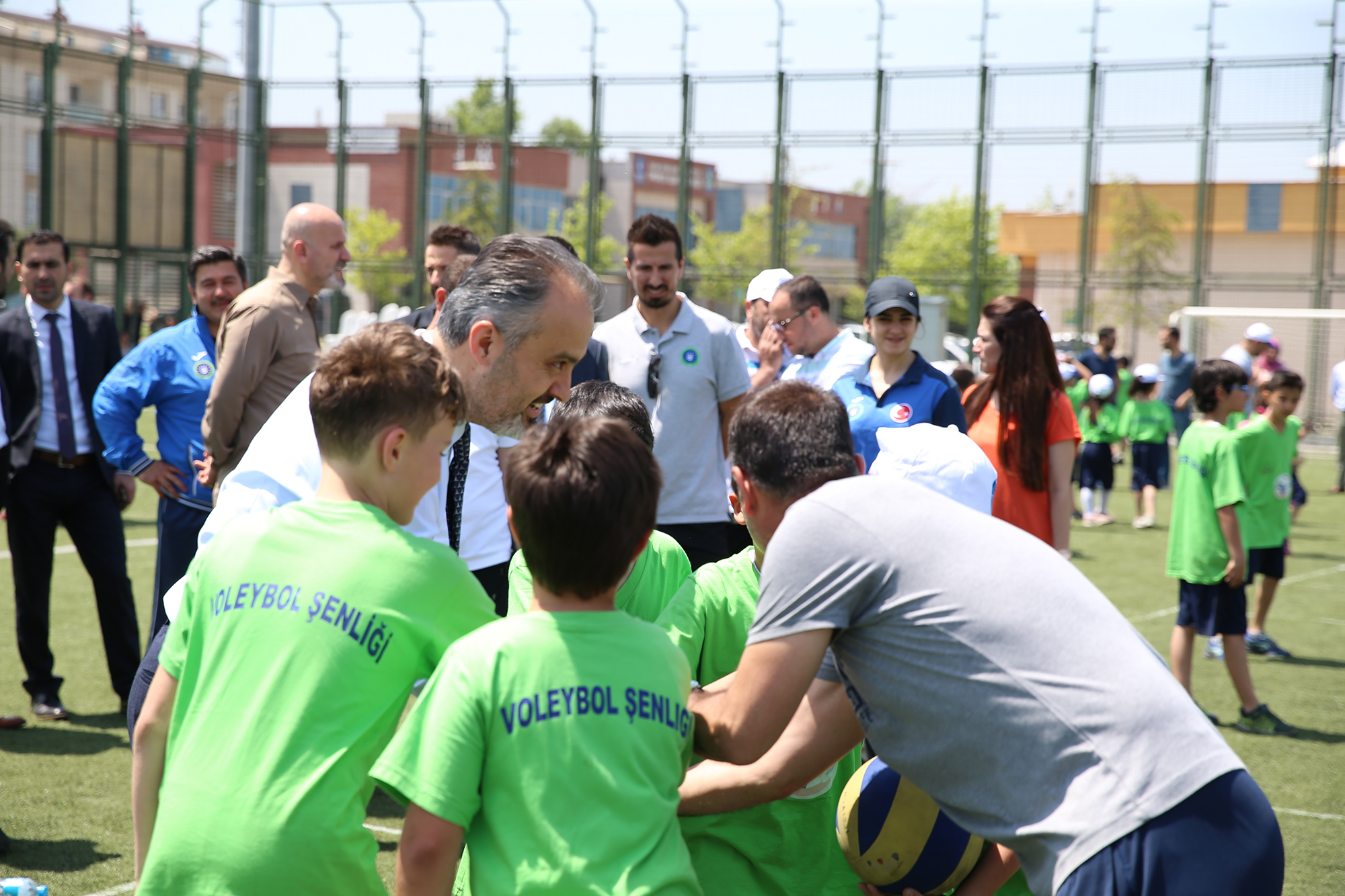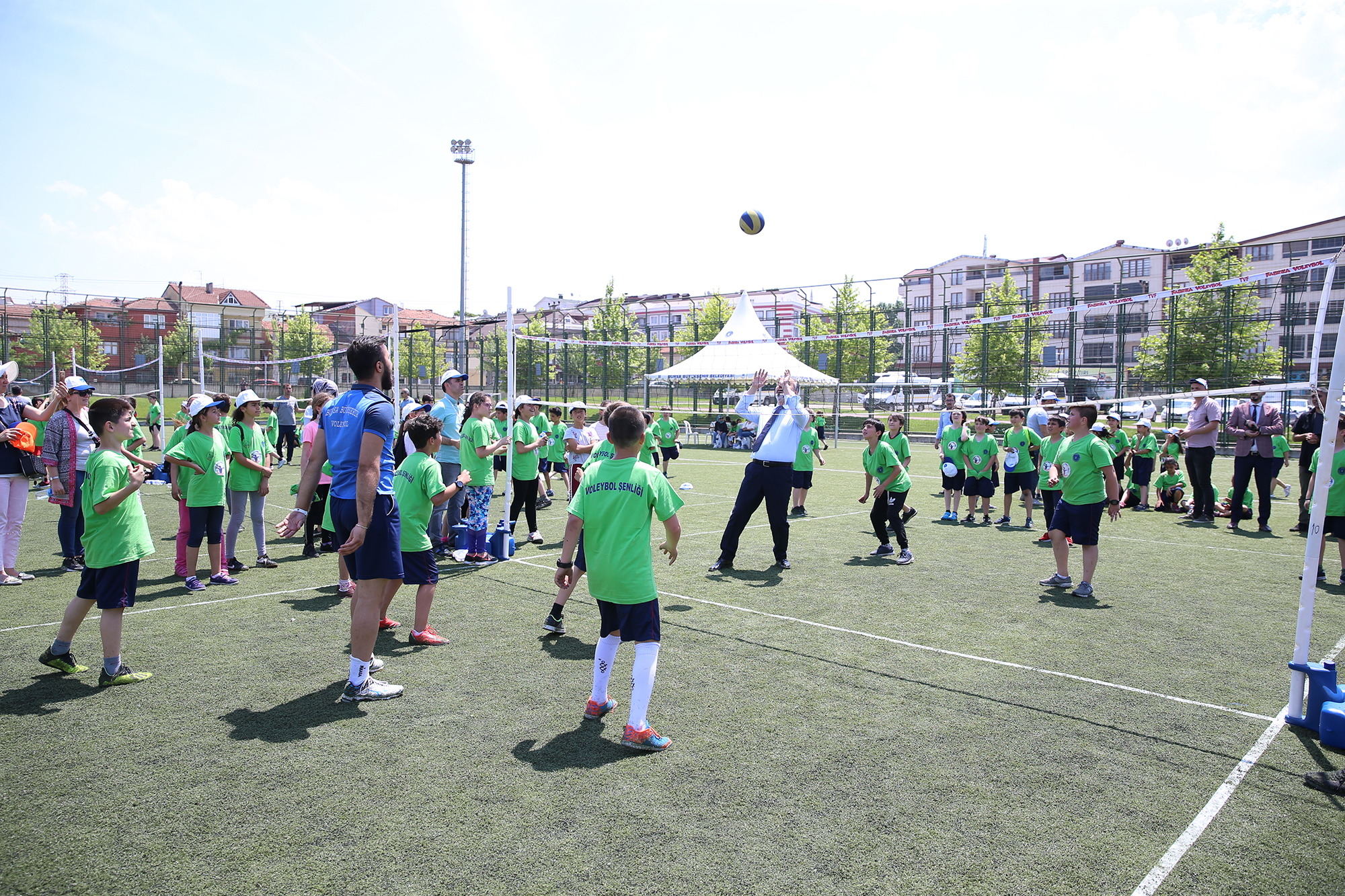 Bursa Büyükşehir Belediyesi Gençlik ve Spor Hizmetleri Şube Müdürlüğü koordinasyonunda Fethiye Spor Kompleksi’nde yapılan şenliğe, 17 ilçede daha önceden düzenlenen mini voleybol turnuvaları sonucu belirlenen 4’üncü sınıf öğrencilerinden oluşan kız ve erkek takımları katıldı. 17 ilçedeki 35 okuldan, 55 takım ve 550’ye yakın kız ve erkek öğrencinin katılımıyla müsabakadan çok şenlik havasında geçen etkinliğin kaybedeni olmazken, Bursa Büyükşehir Belediye Başkanı Alinur Aktaş da çocukların heyecanına ortak oldu. Ceketini çıkarıp, sahaya giren Başkan Aktaş, sıcak havaya rağmen çocuklarla birlikte voleybol oynadı.