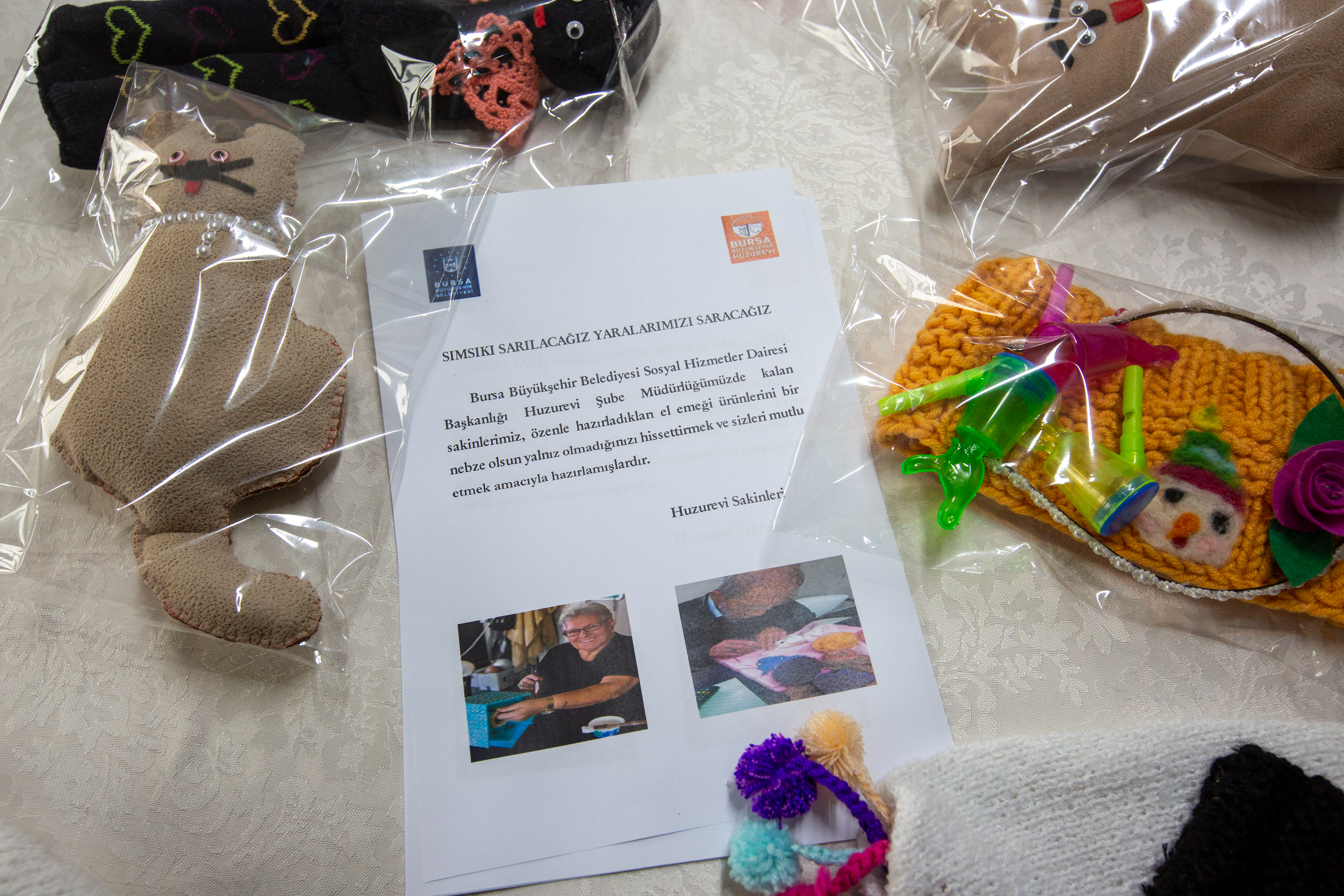 Bursa Büyükşehir Belediyesi Huzurevi sakinleri, hobi atölyelerinde her yıl yapılan kermes için ürettikleri ürünleri, bu kez deprem bölgesindeki çocuklar için hazırladı. Huzurevi sakinleri tarafından hazırlanan atkı, bere, oyuncak, çanta gibi el emeği ürünler depremzede çocuklar için kolilere yerleştirildi.