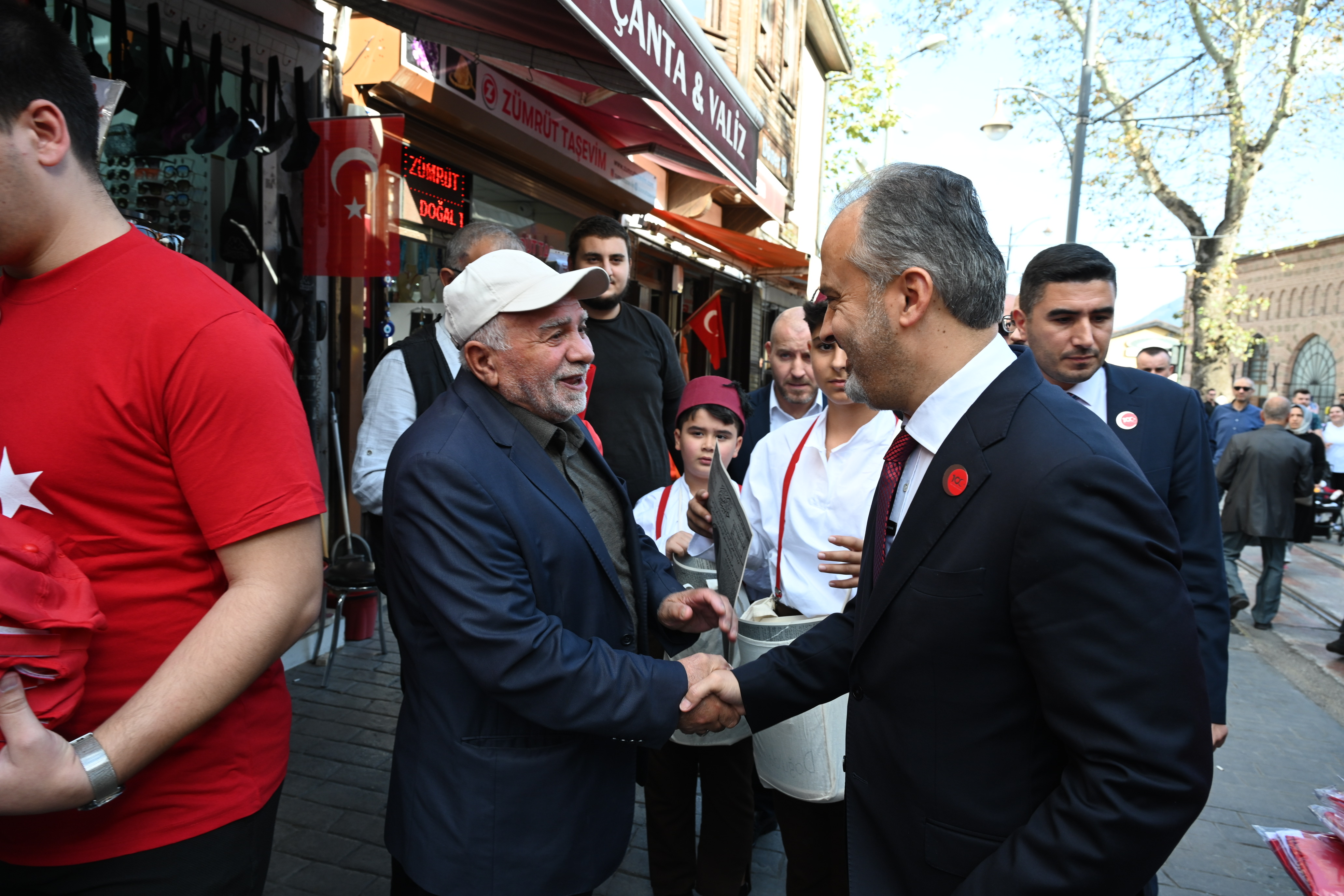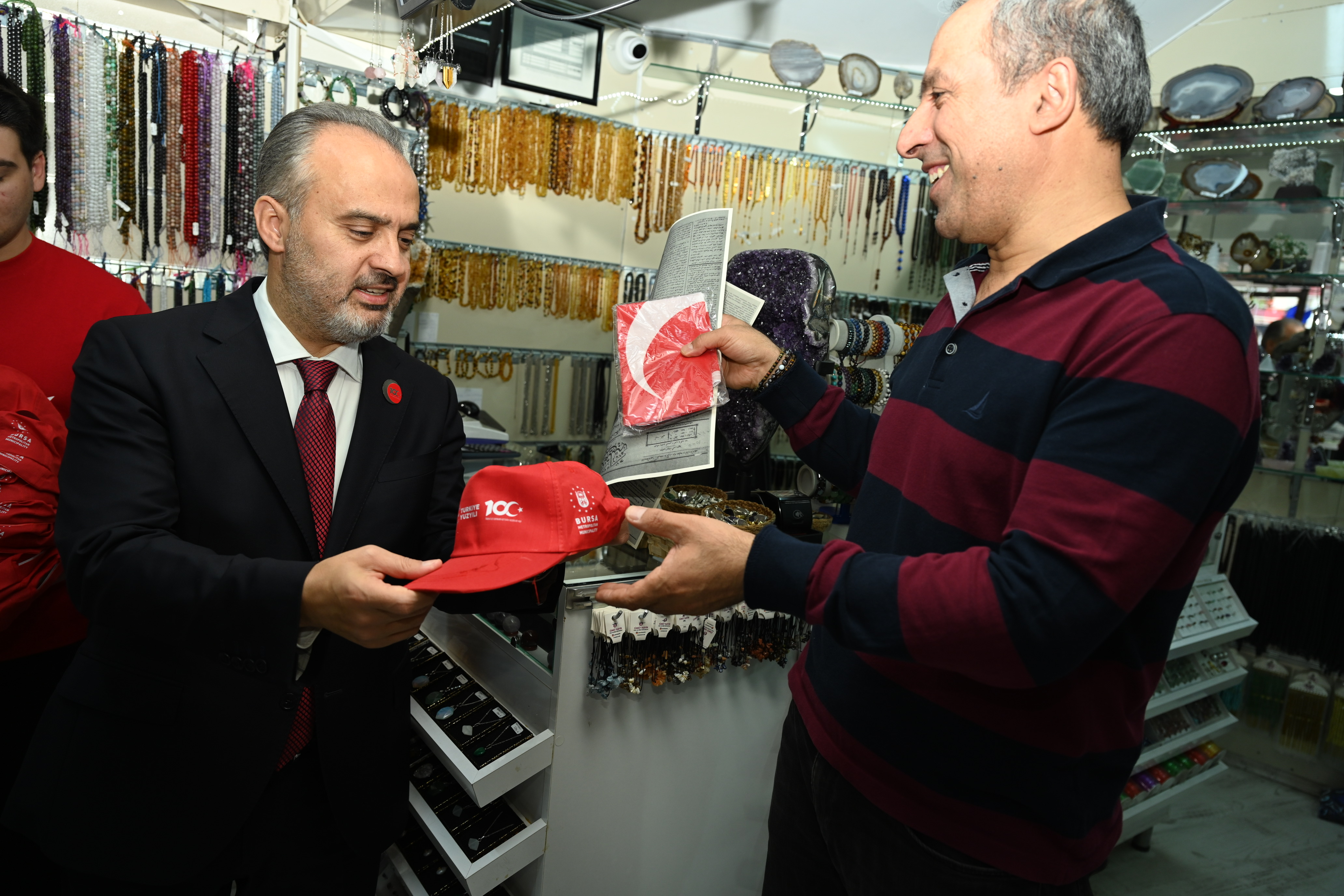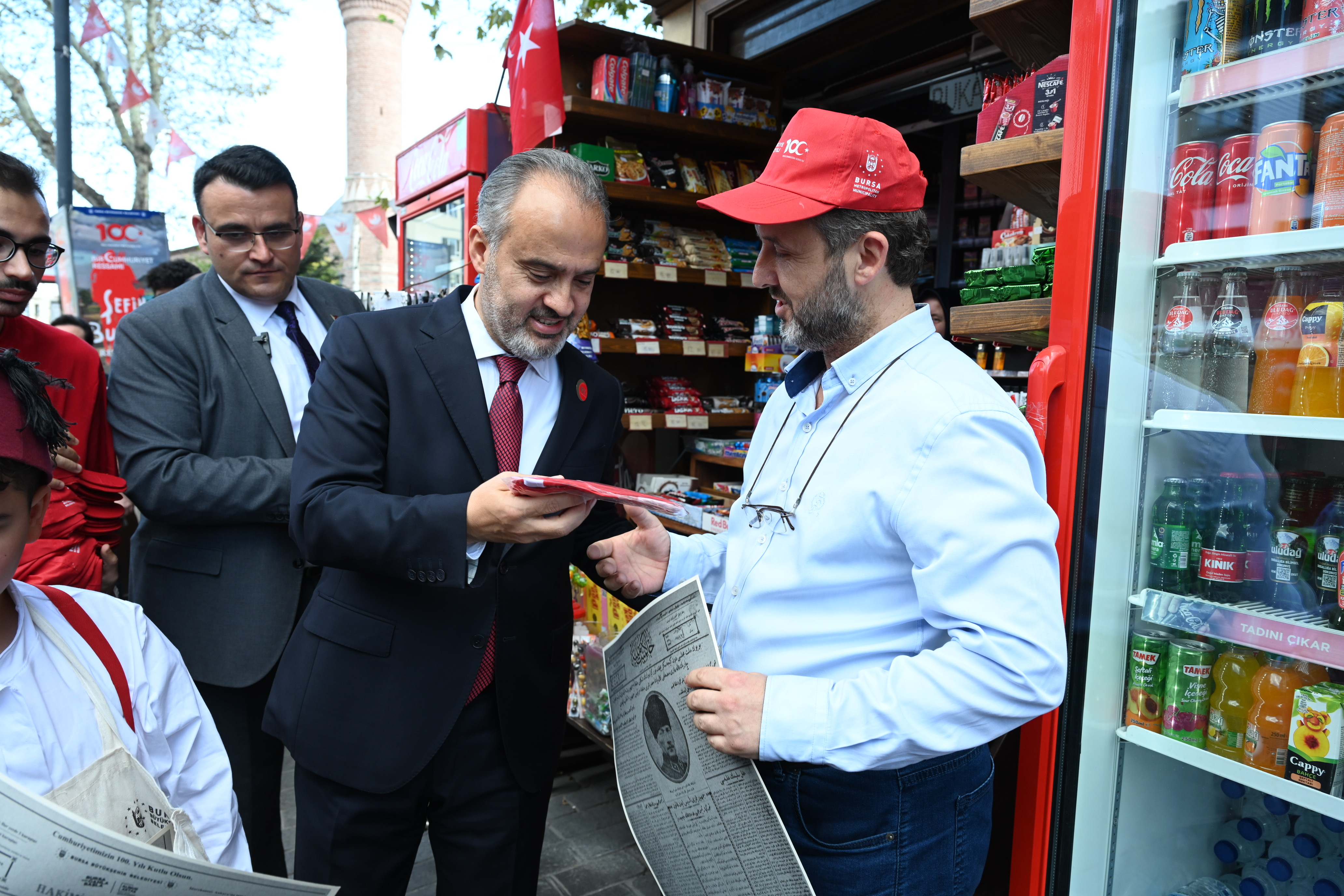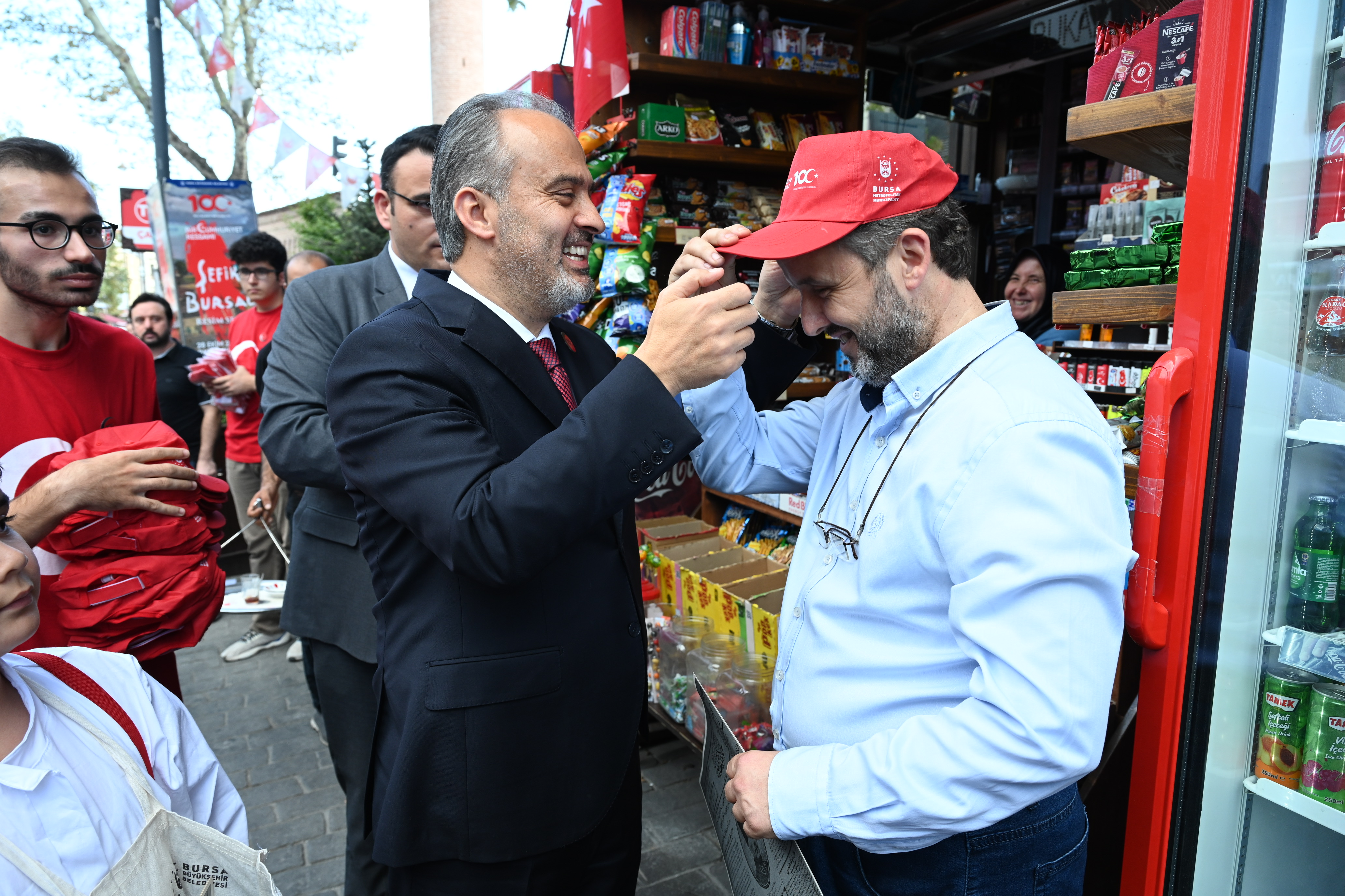 BURSA – Bursa Büyükşehir Belediyesi, Cumhuriyet’in 100’üncü kuruluş yıldönümü nedeniyle şehrin tüm ana arterlerini Türk Bayrakları ile donatırken, Başkan Alinur Aktaş da çarşı esnafına Türk Bayrağı ve ay-yıldızlı şapkalar hediye etti.
