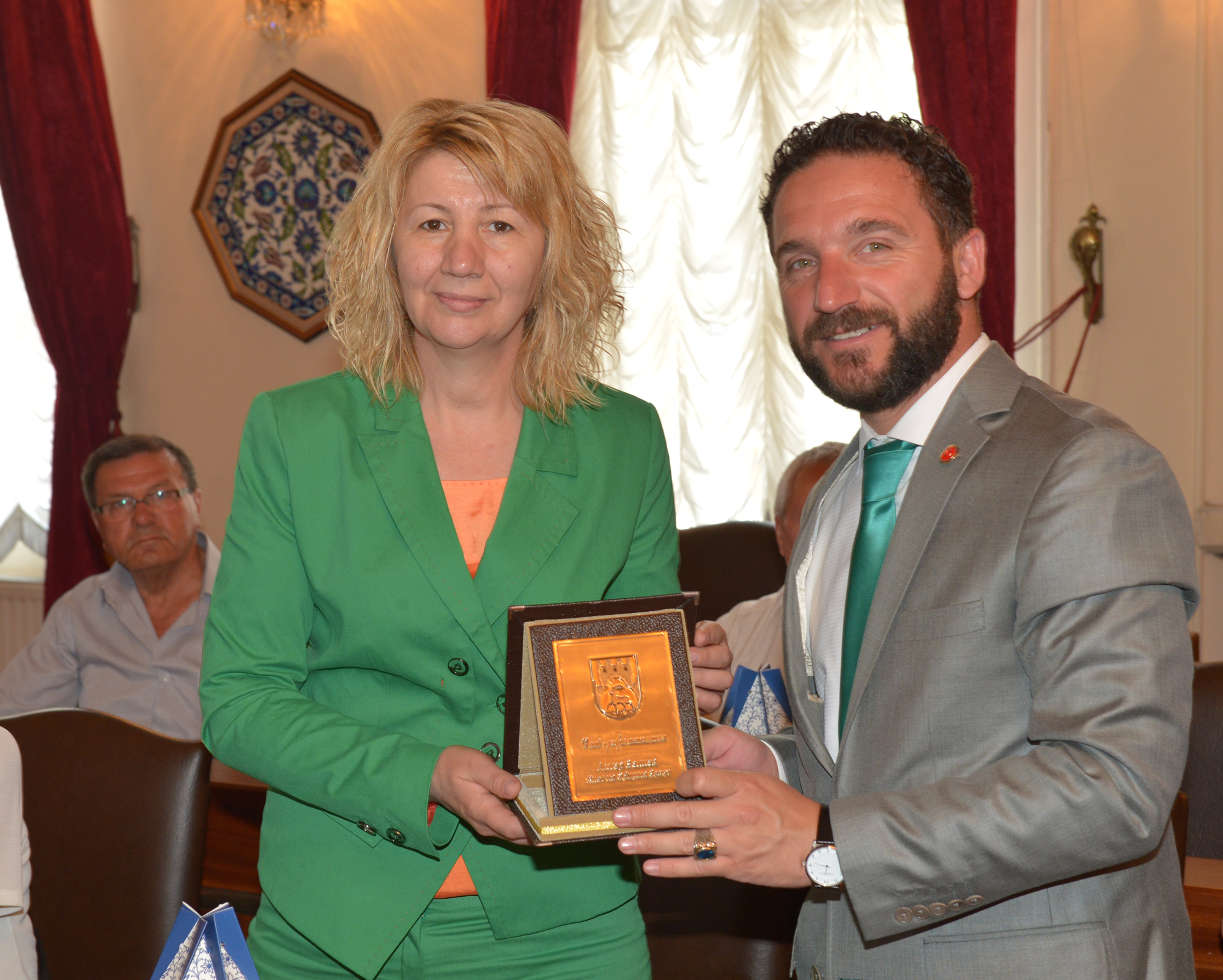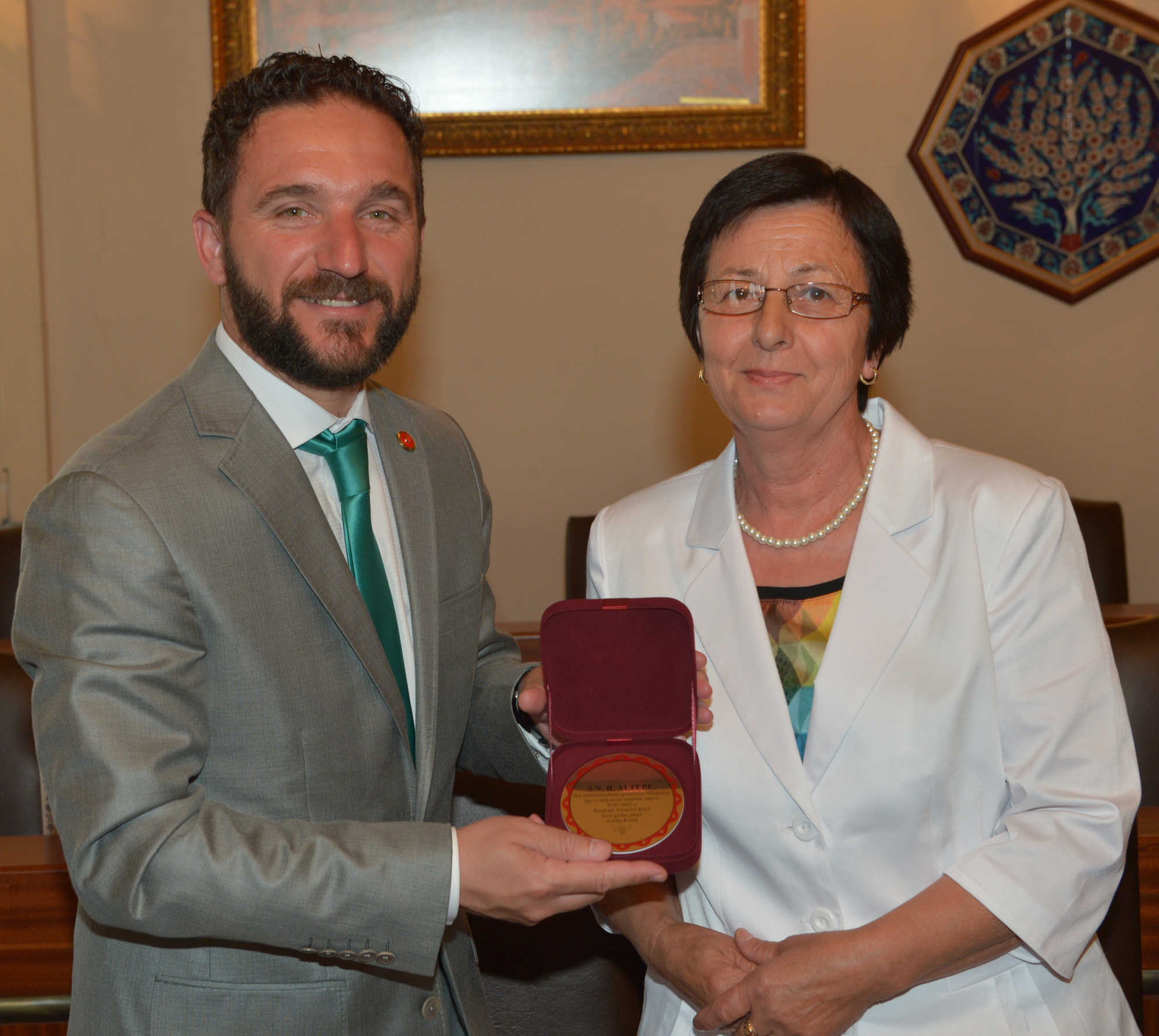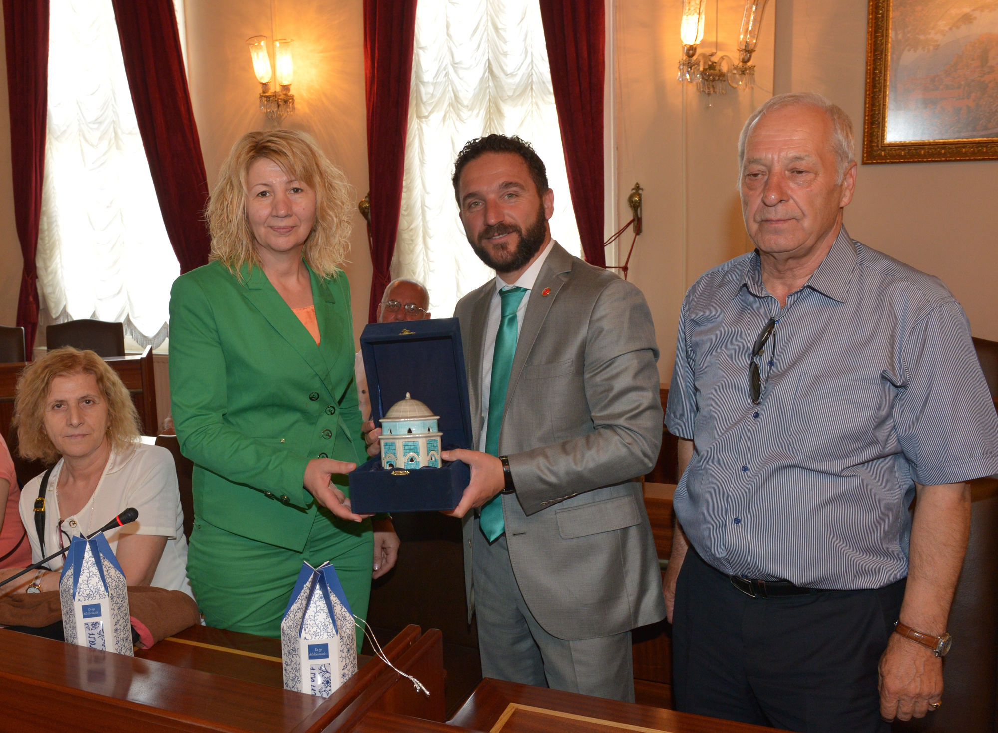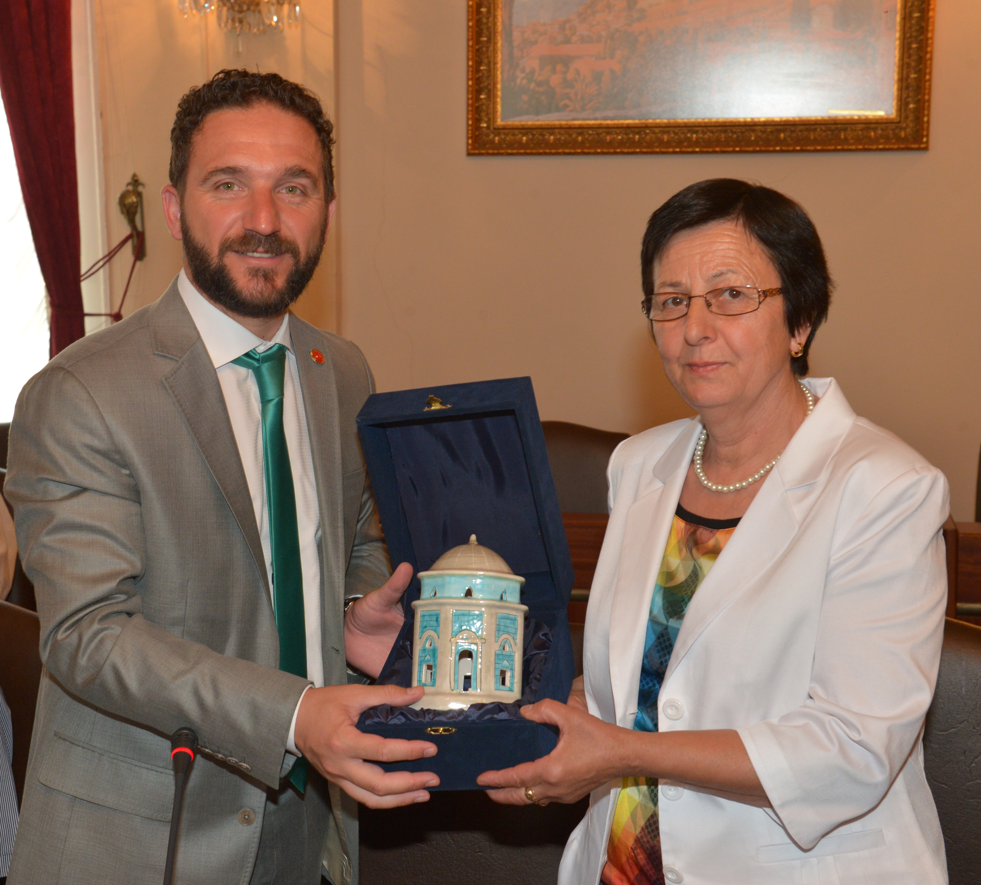 Ziyaretin ardından Başkanvekili Ödünç, misafirlerine Yeşil Türbe figürlü çini porselen hediye etti.